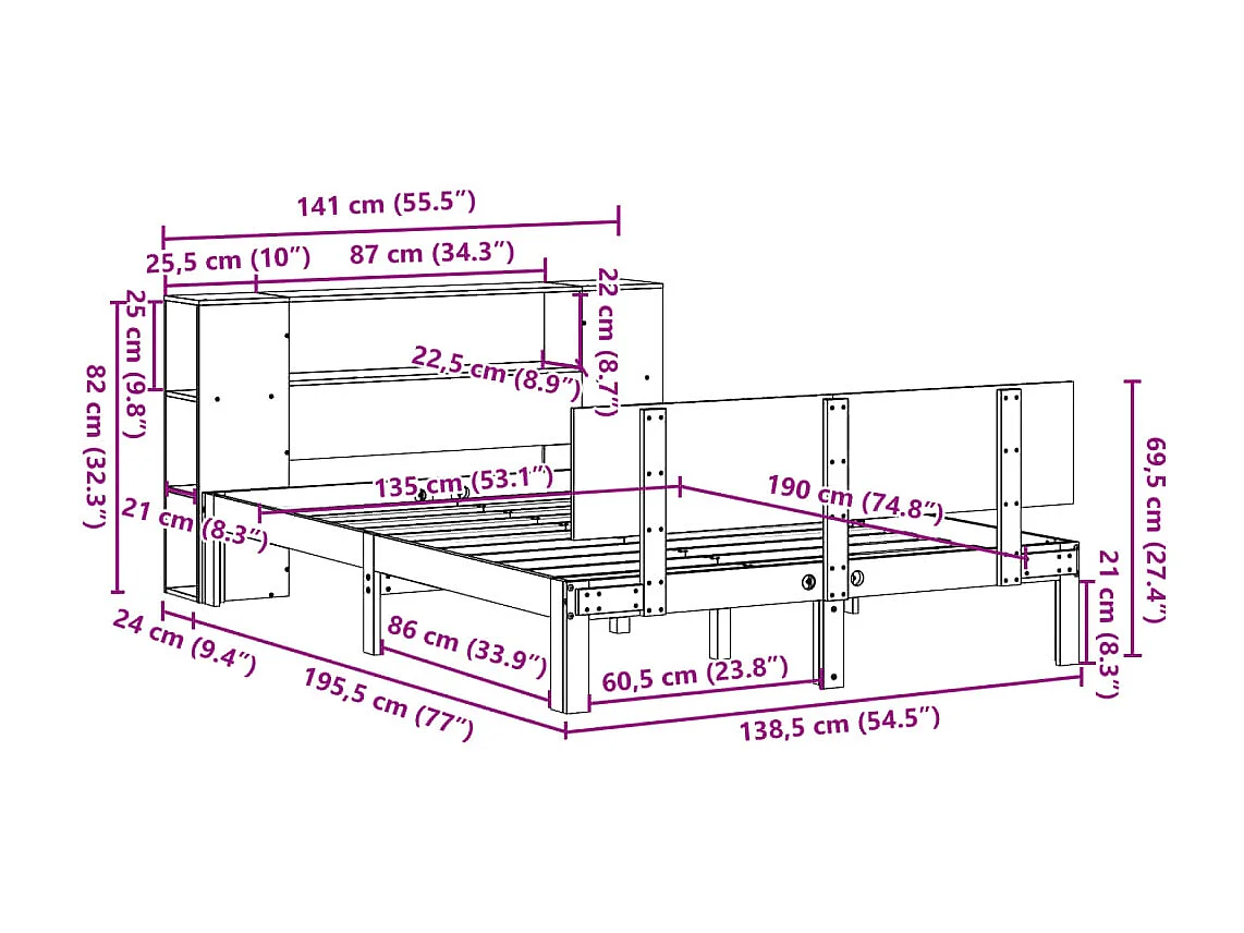 Lit bibliothèque sans matelas blanc 135x190 cm bois pin massif