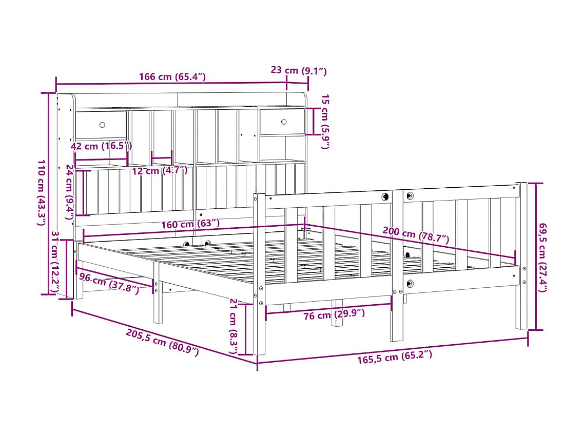 Lit bibliothèque sans matelas blanc 160x200 cm bois pin massif