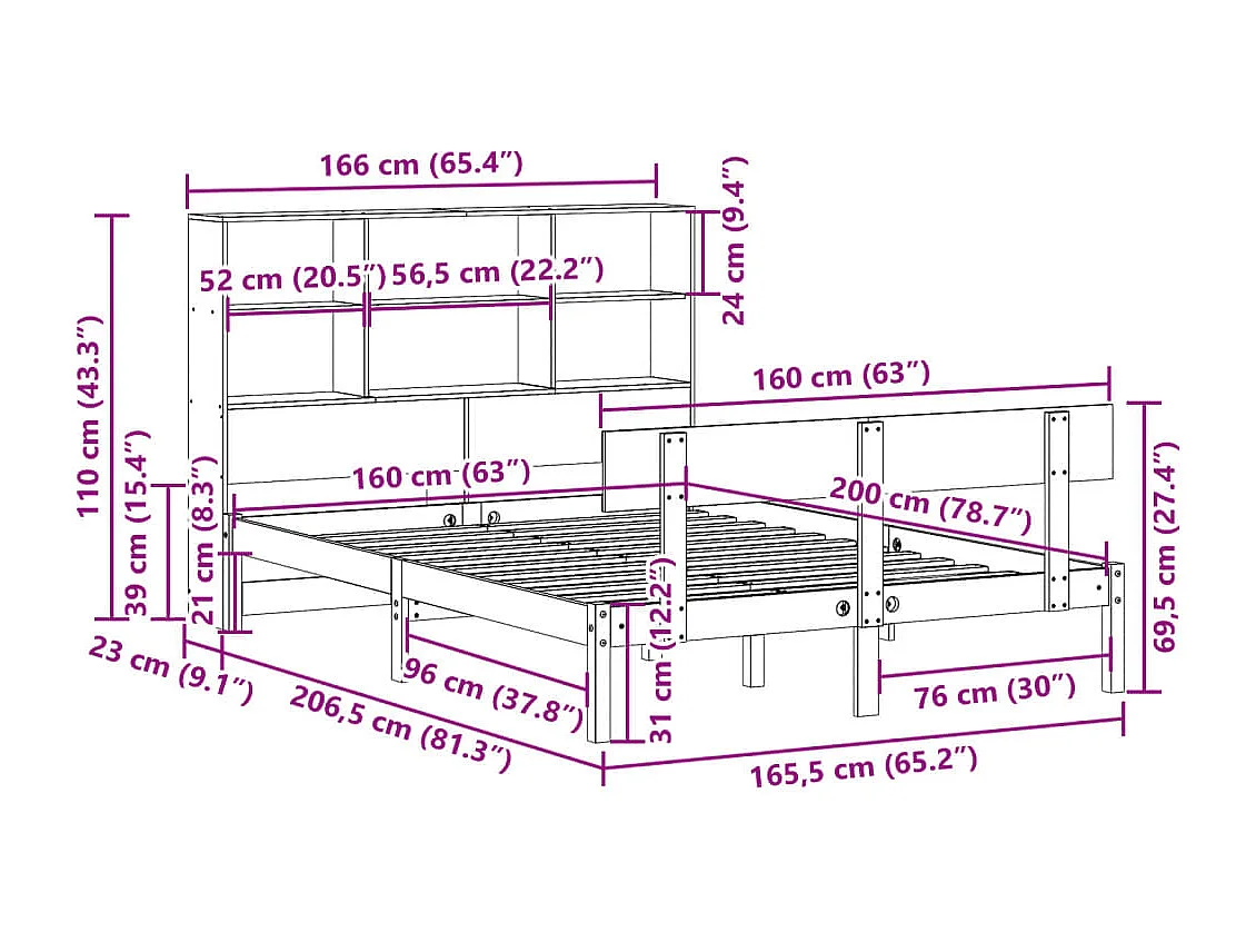 Lit bibliothèque sans matelas blanc 160x200 cm bois pin massif