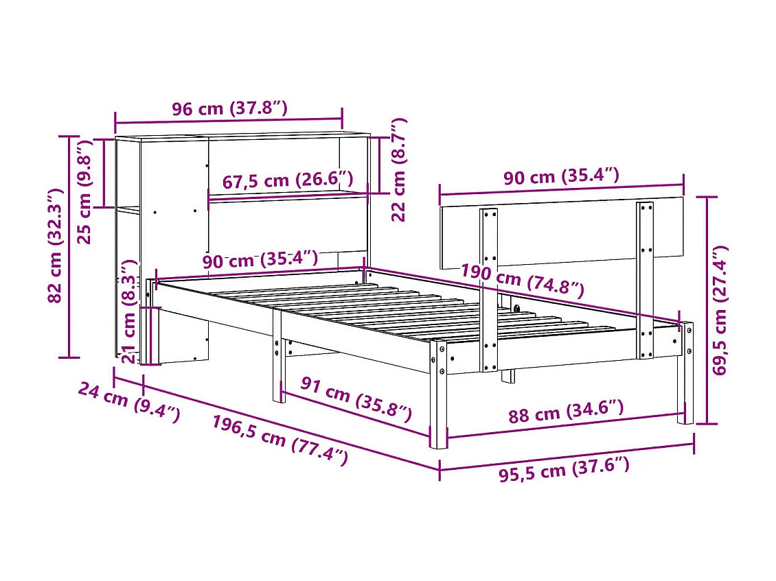 Lit bibliothèque sans matelas blanc 90x190cm bois de pin massif