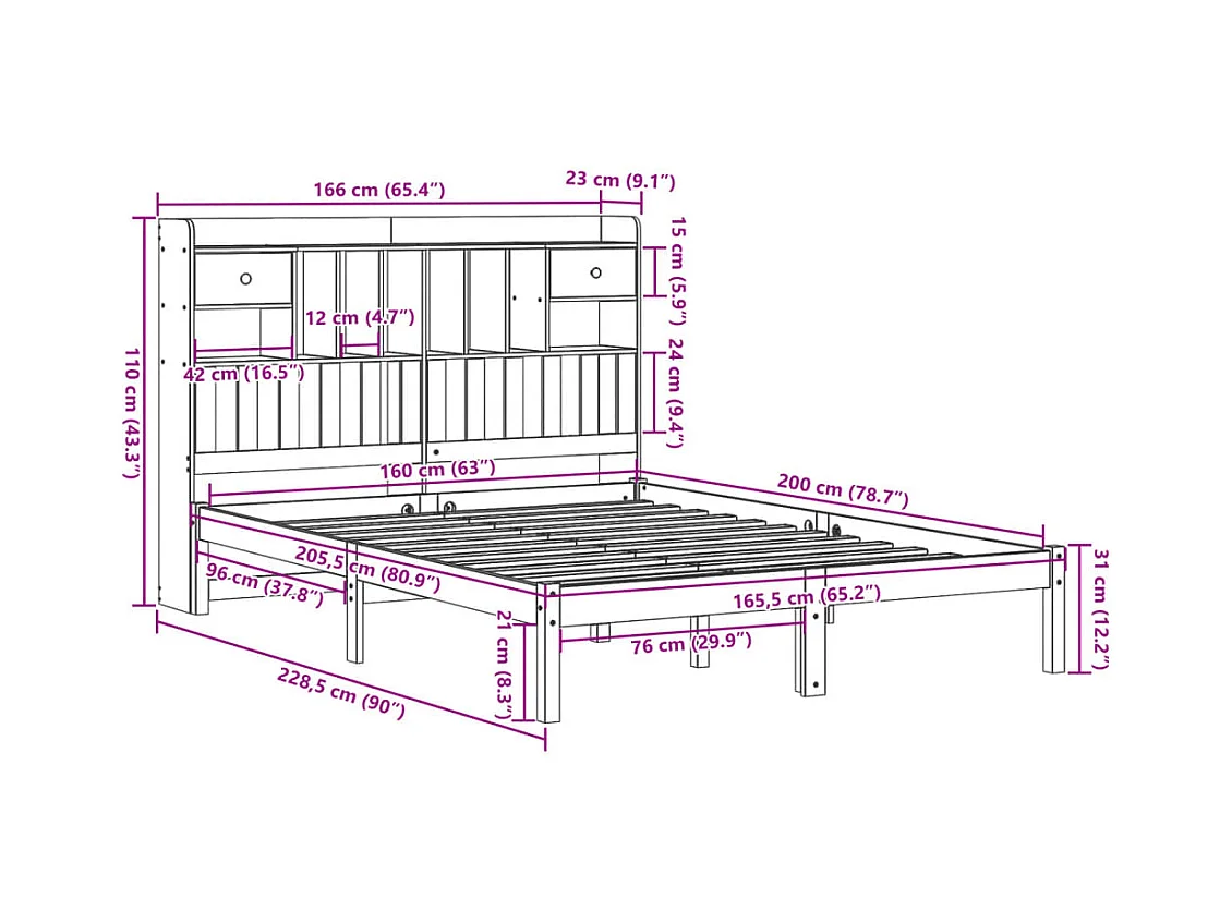 Lit bibliothèque sans matelas 160x200 cm bois massif de pin