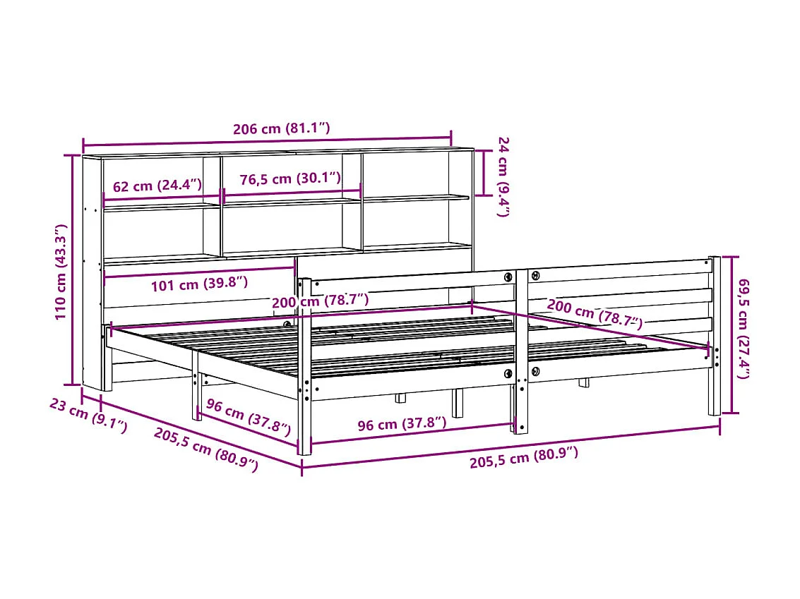 Lit bibliothèque sans matelas cire marron 200x200 cm pin massif