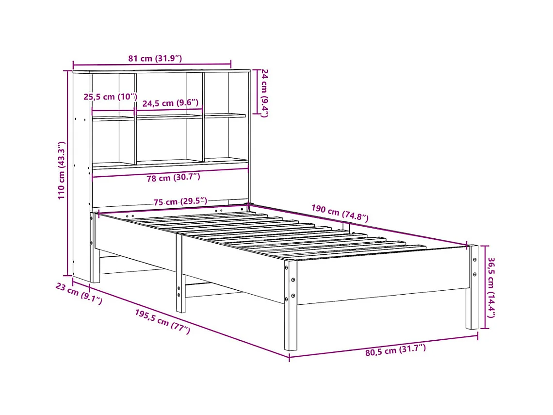 Lit bibliothèque sans matelas 75x190 cm bois de pin massif