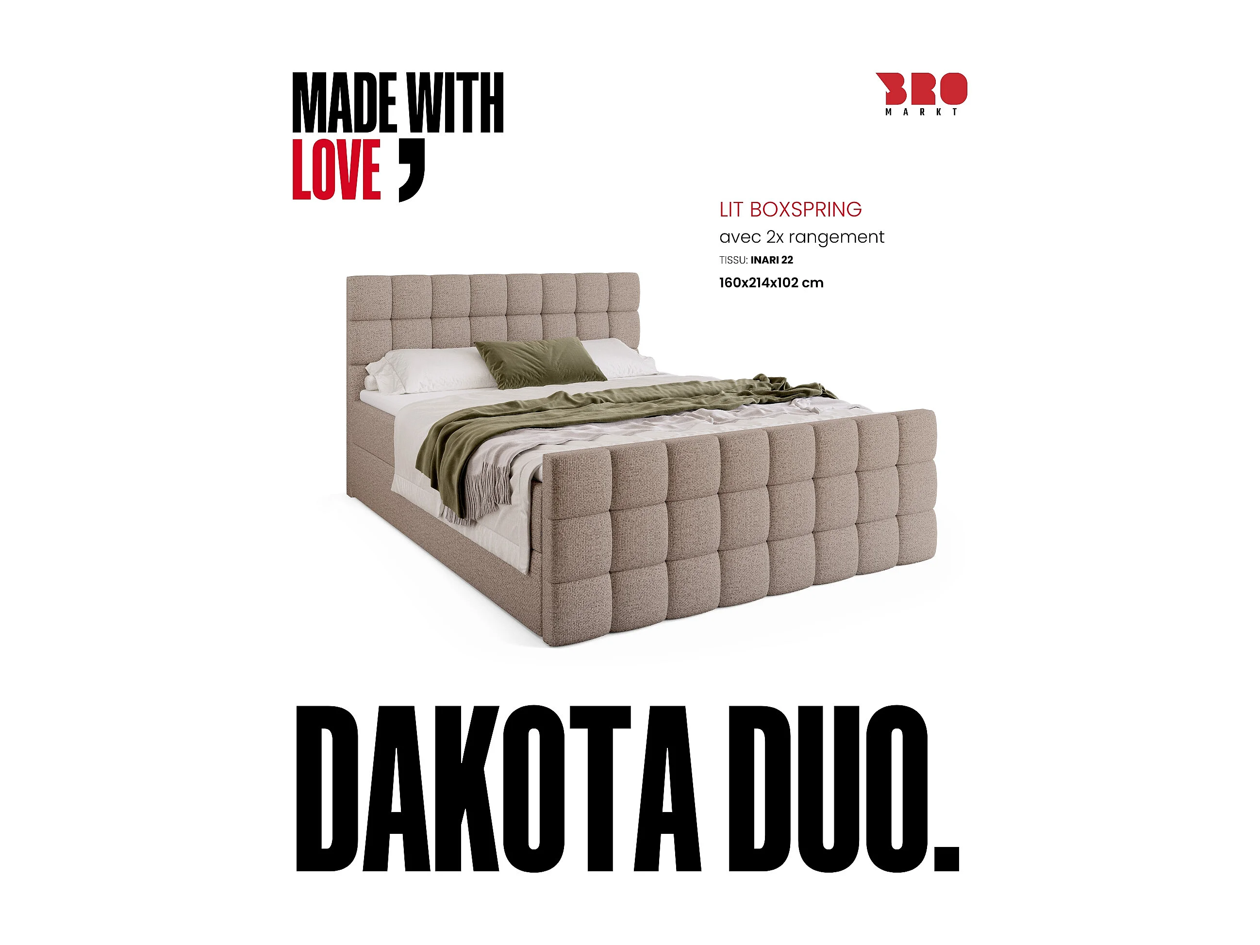 Lit boxspring avec rangement DAKOTA DUO - matelas - surmatelas - beige clair - 160x200 cm