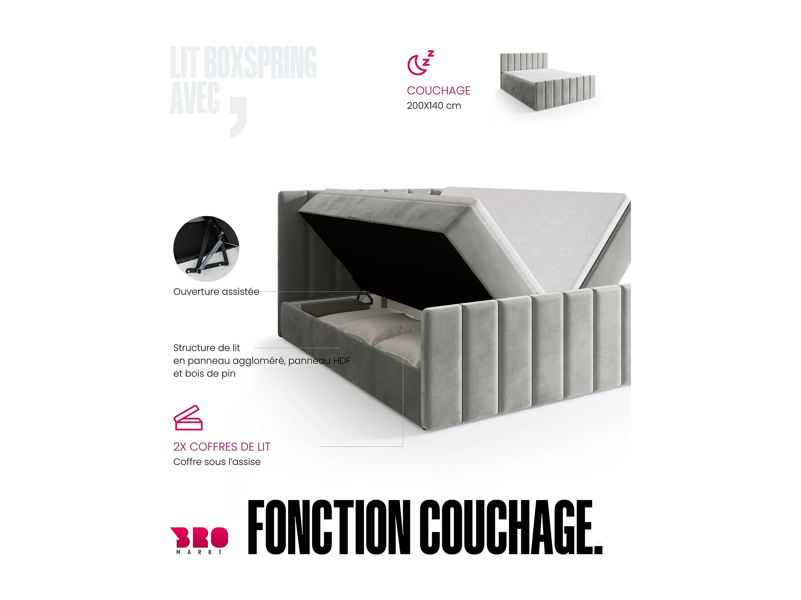 Lit boxspring avec rangement DENVER DUO - matelas - surmatelas - gris - 140x200 cm