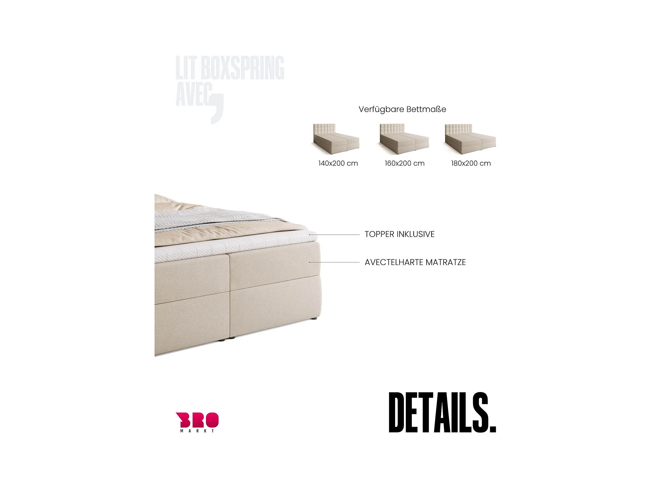 Lit boxspring 140x200 tissu beige Mador