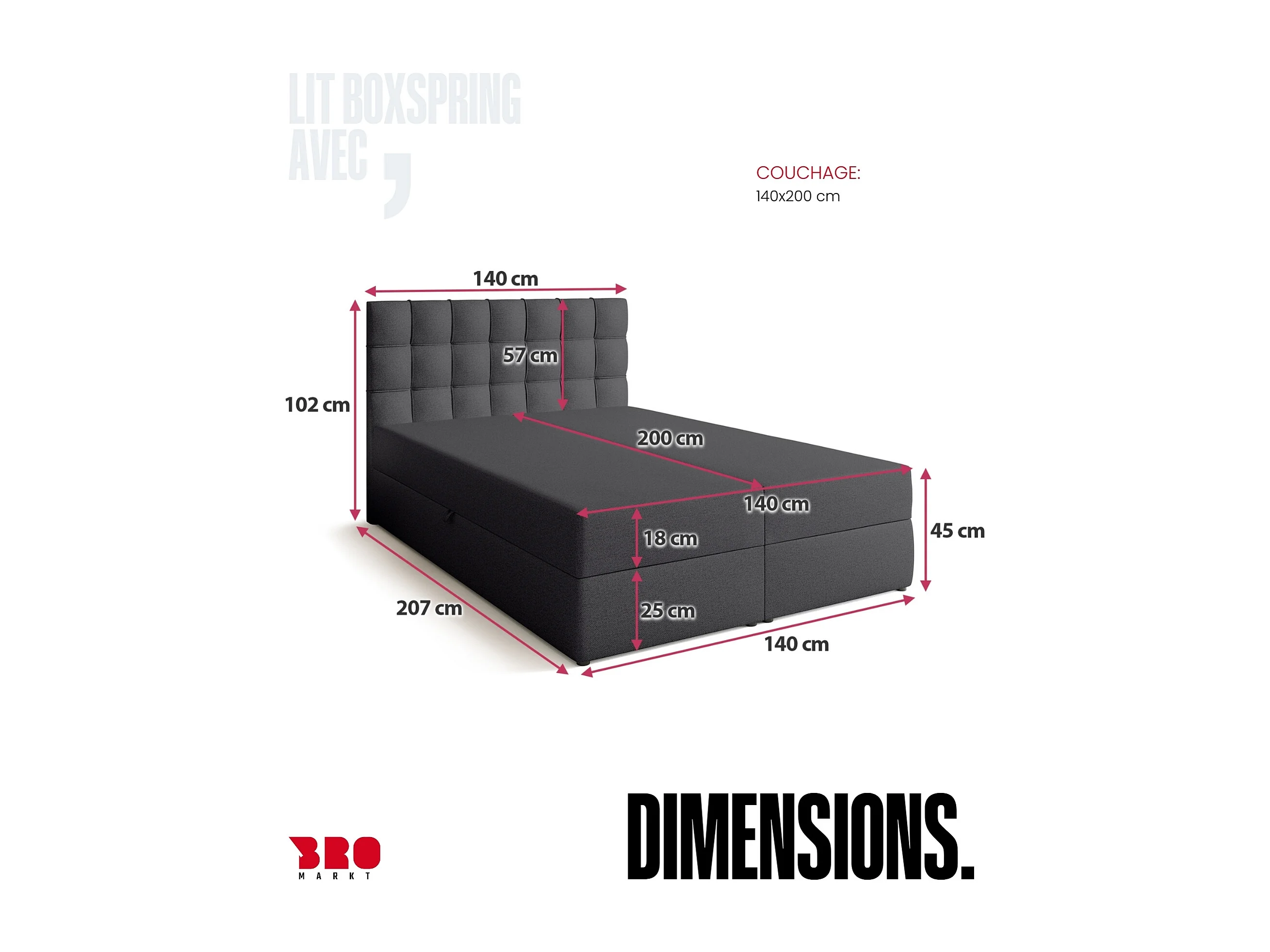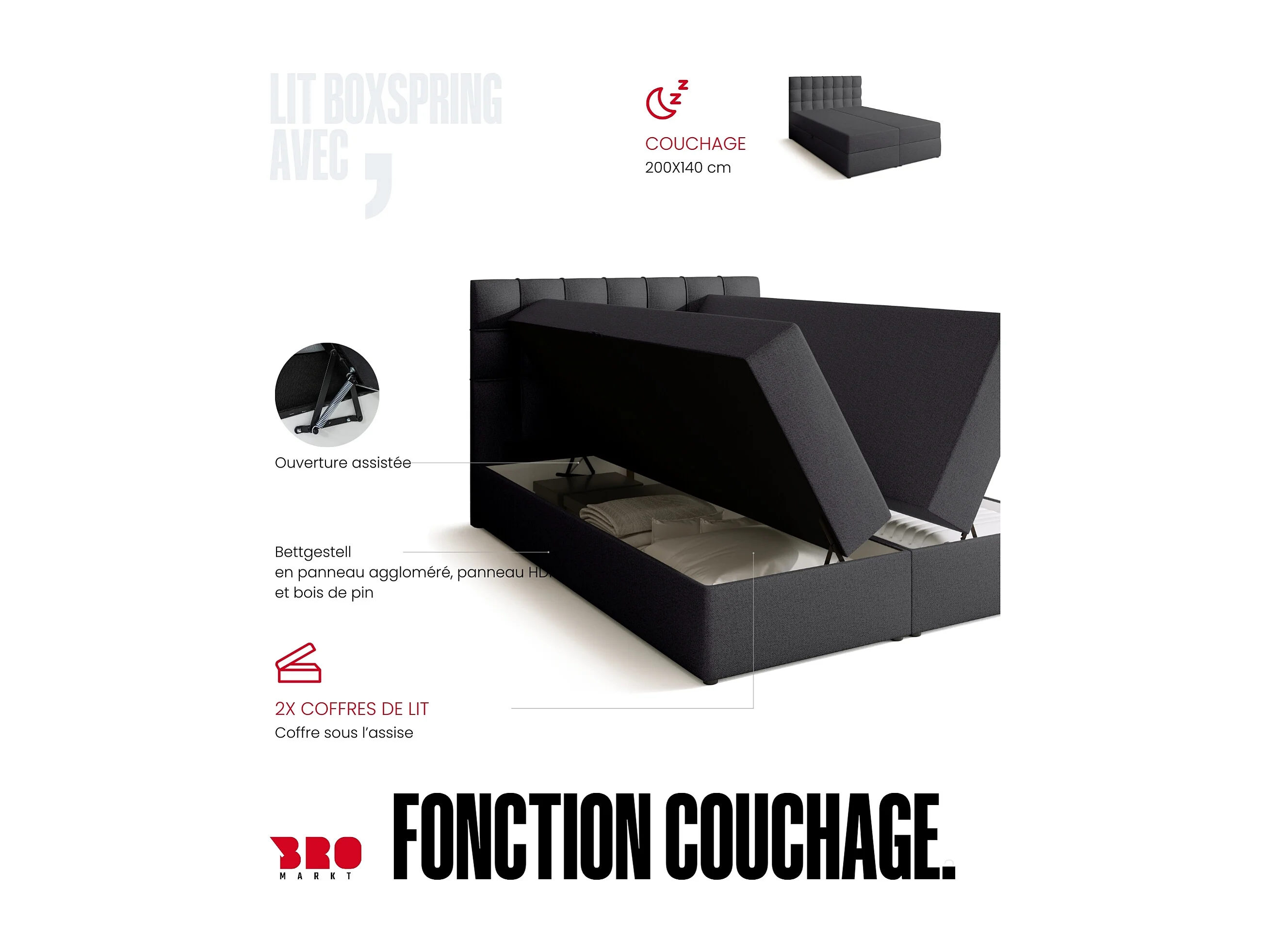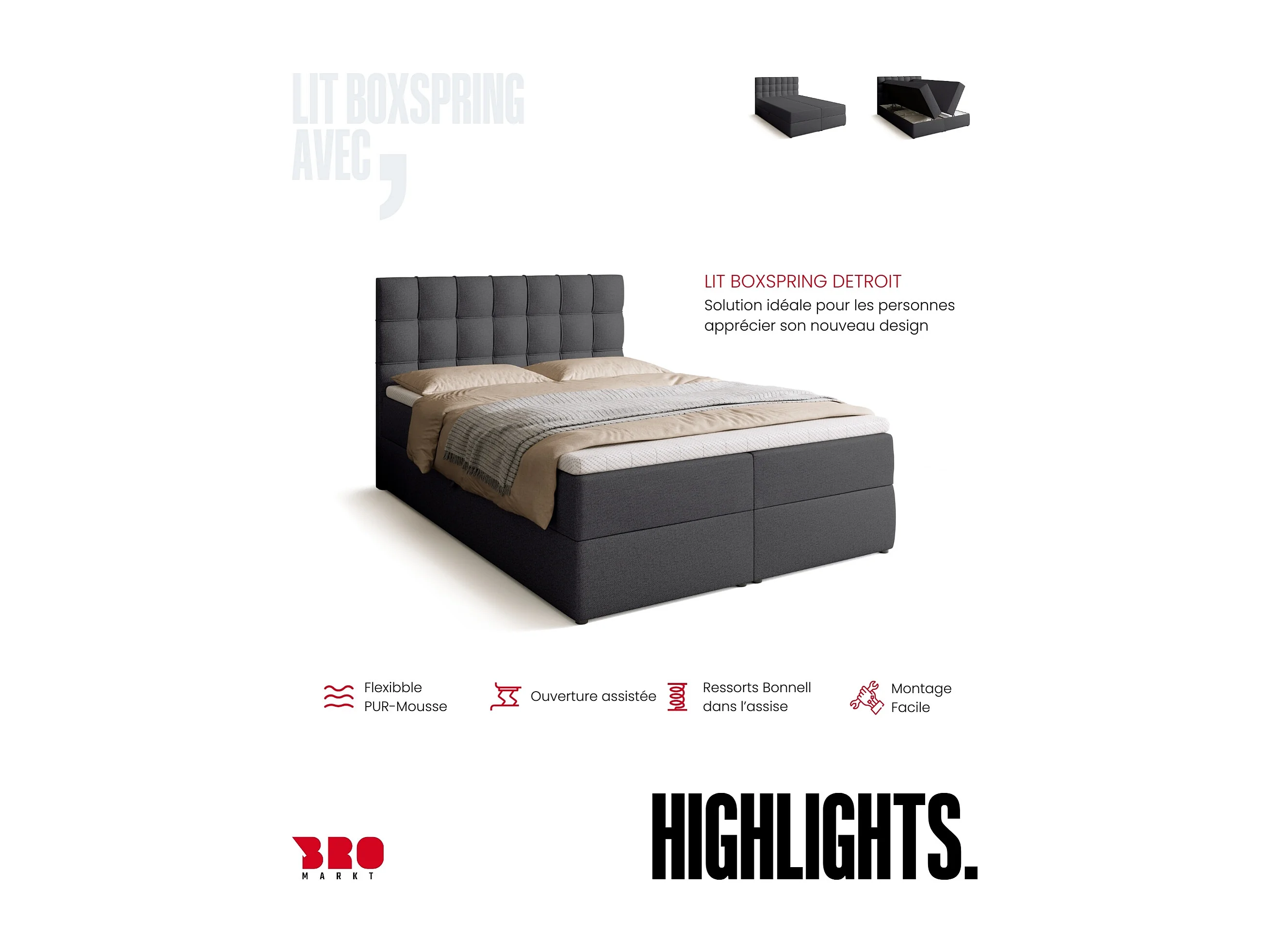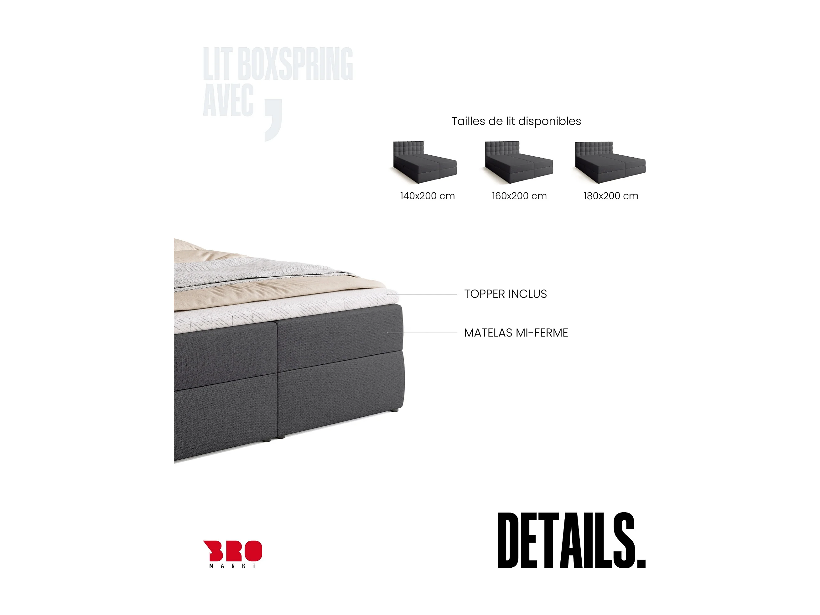 Lit boxspring avec rangement DETROIT - matelas - surmatelas - gris foncé - 140x200 cm