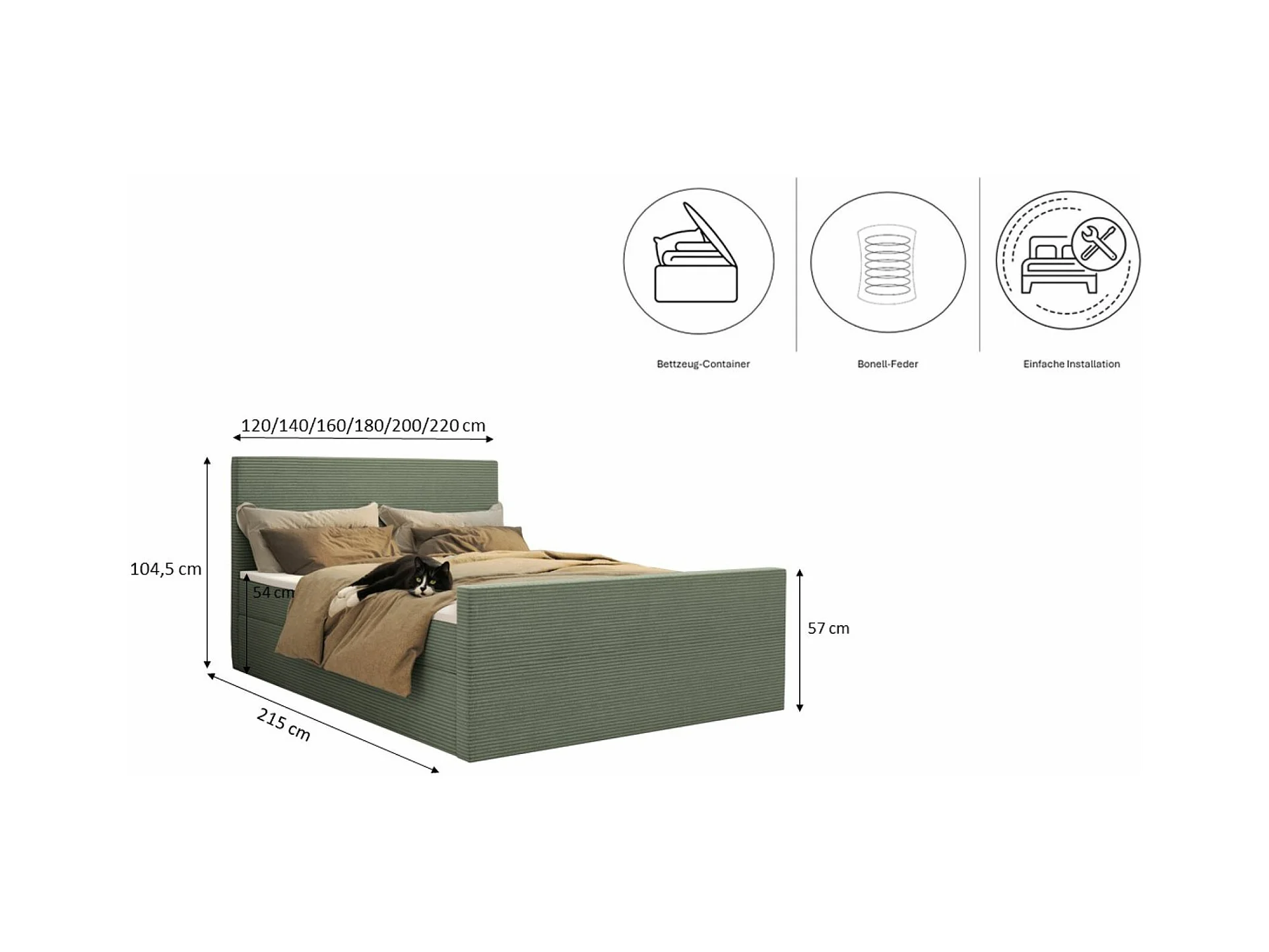 Lit à sommier tapissier avec sommier et surmatelas TRENTO en tissu peluche cordon 140x200 cm vert H3-Bonell