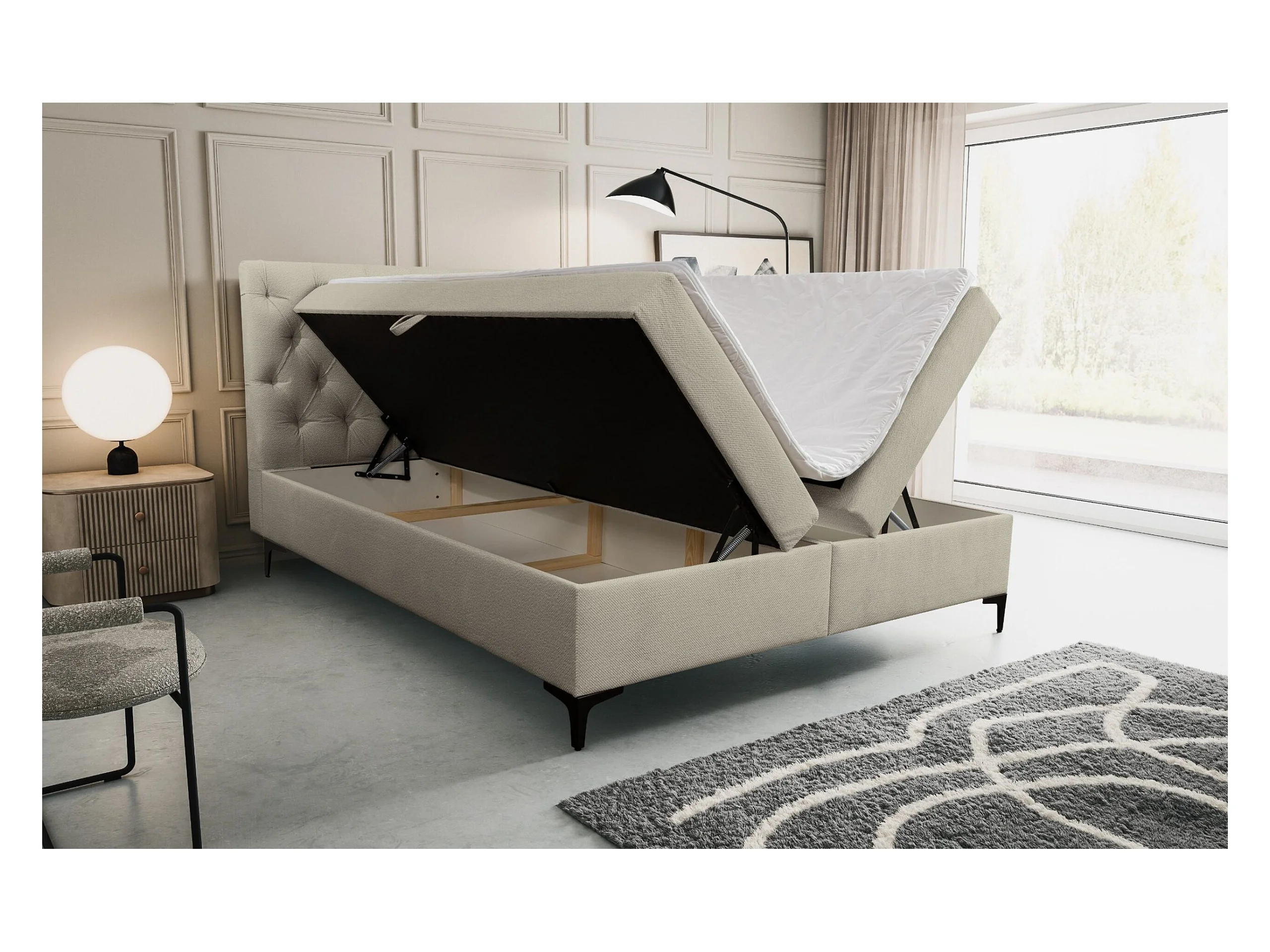 Lit boxspring GLORIA avec 2 coffres de rangement, lit rembourré Dimensions: 160x200, couleur: beige, tissu cordé