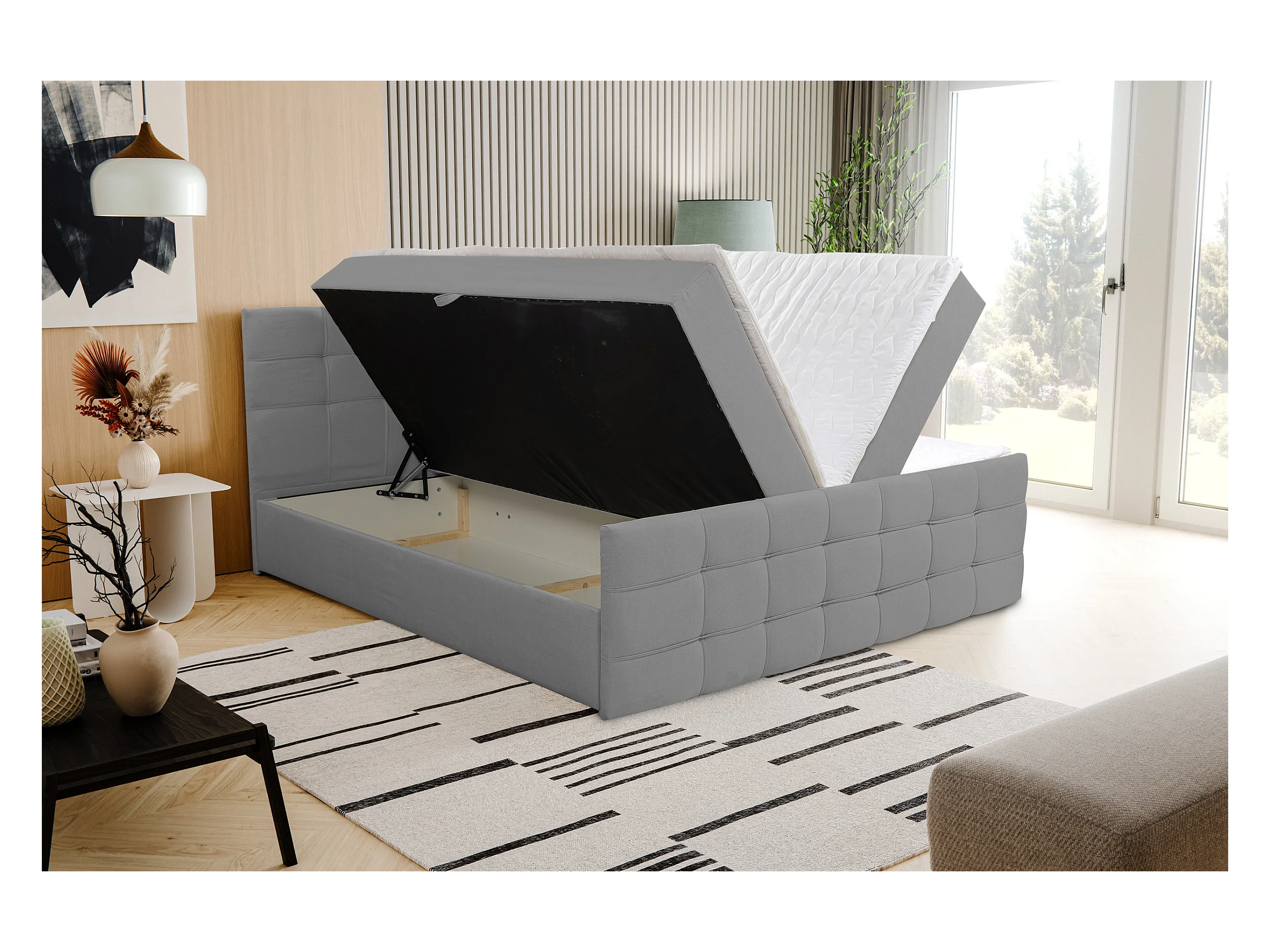 Lit boxspring LAMBI avec 2 coffres de rangement, lit rembourré Dimensions: 140x200, couleur: gris, tissu bouclé