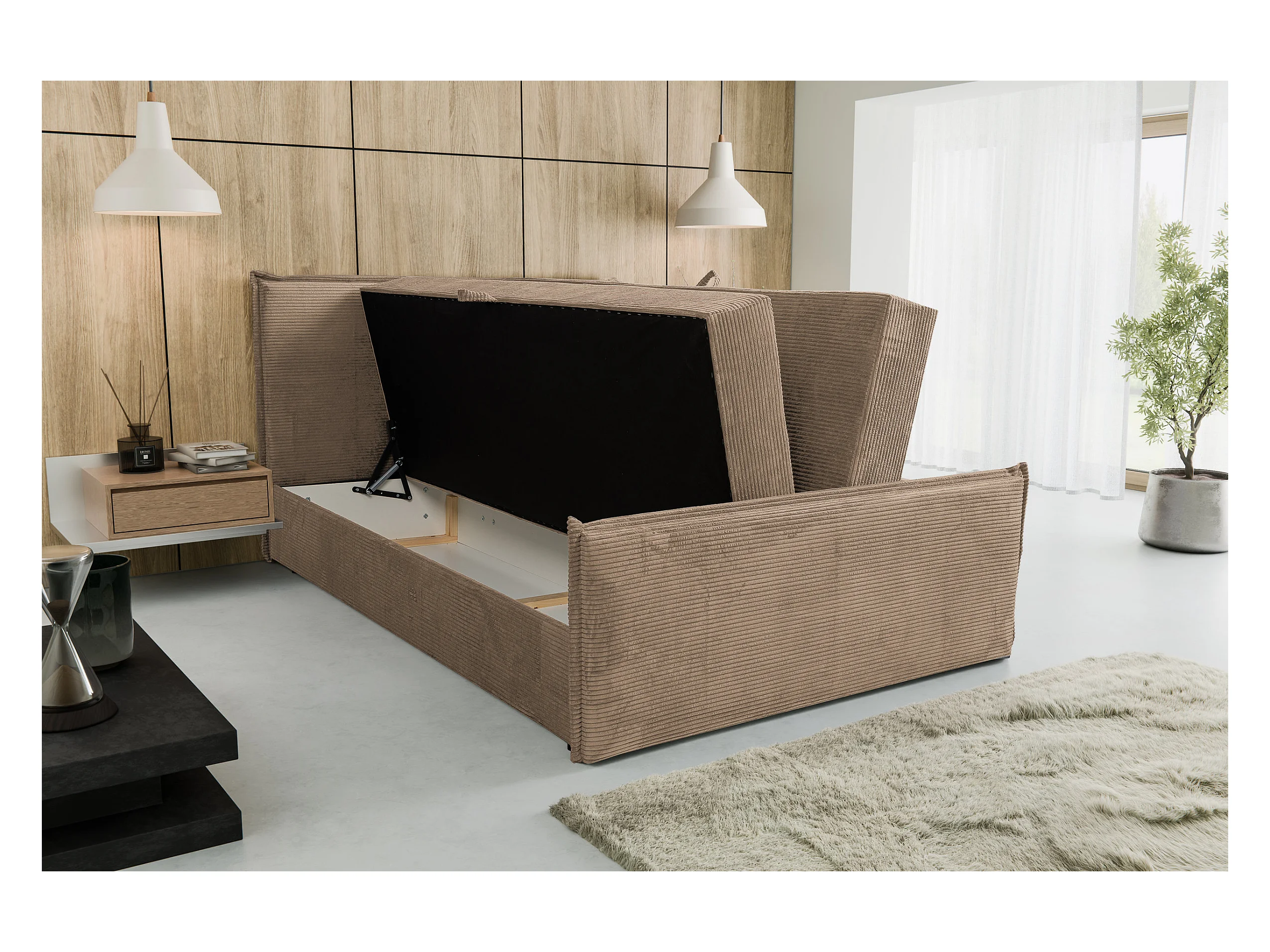 Lit boxspring Cimone avec 2 coffres de rangement, lit rembourré Dimensions: 160x200 cm, couleur: marron clair, tissu velours