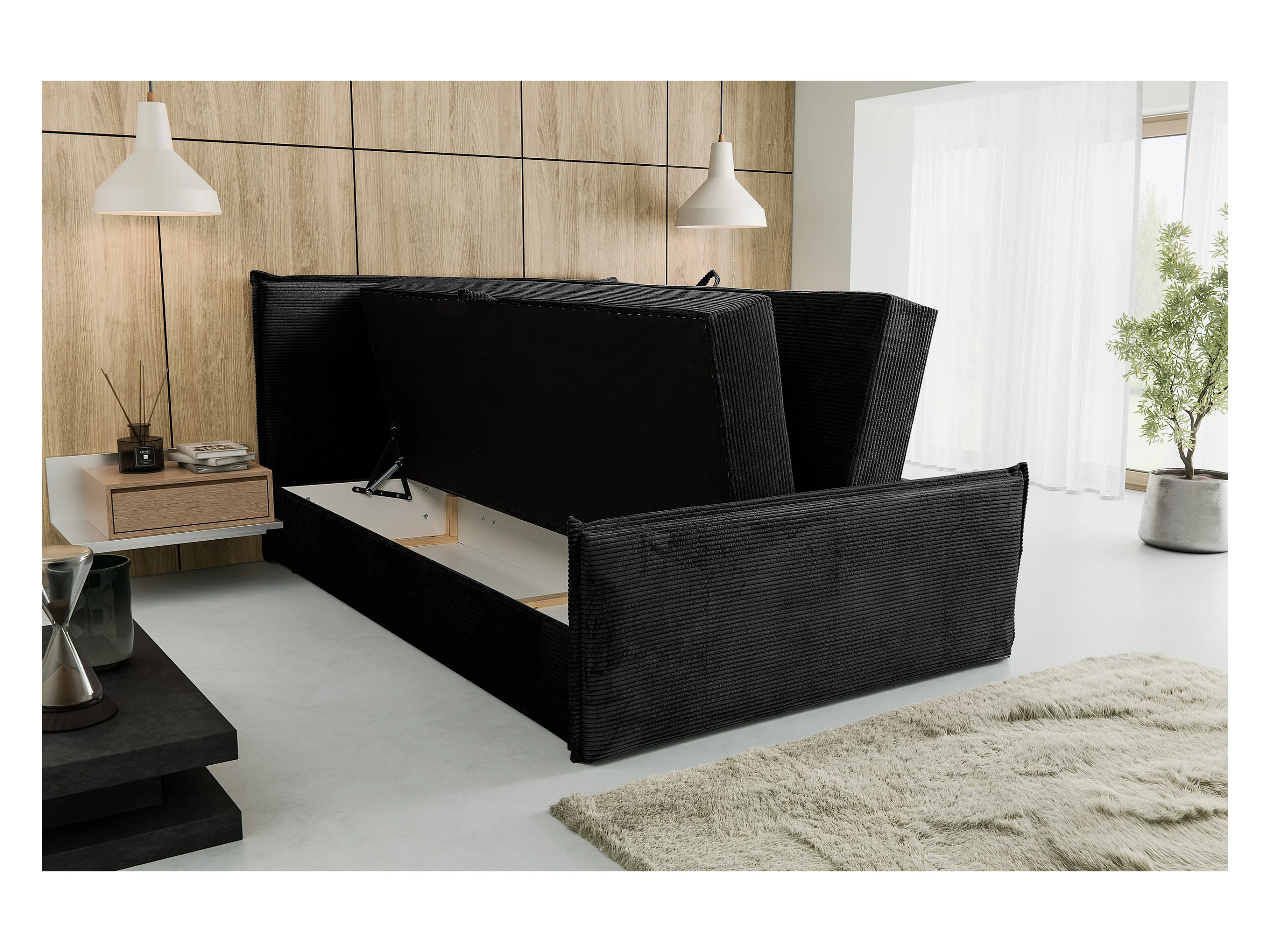 Lit boxspring Vanessa avec 2 coffres de rangement, lit rembourré Dimensions: 160x200, couleur: noir, tissu velours côtelé