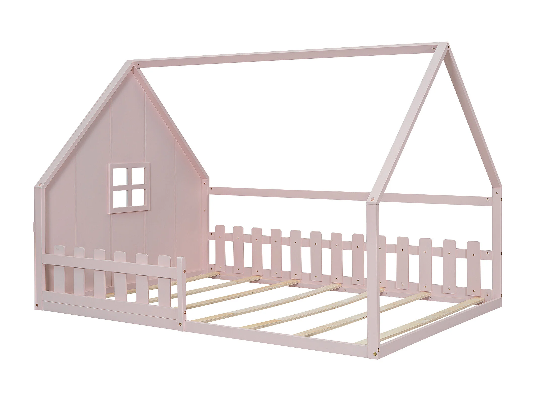 Lit cabane 140x200 cm, lit enfant avec barrières de sécurité et sommier à lattes en bois - pin - rose (sans matelas)