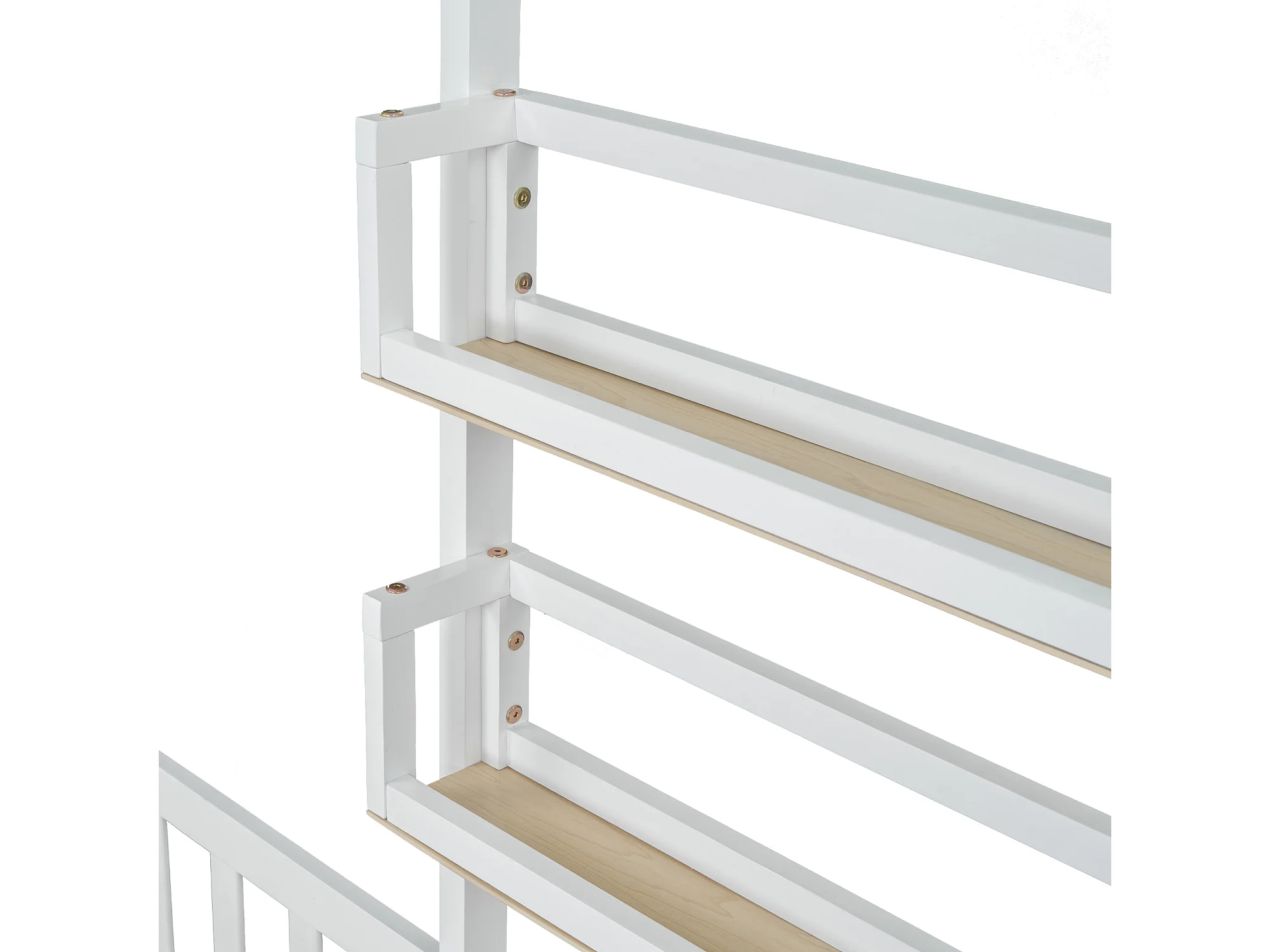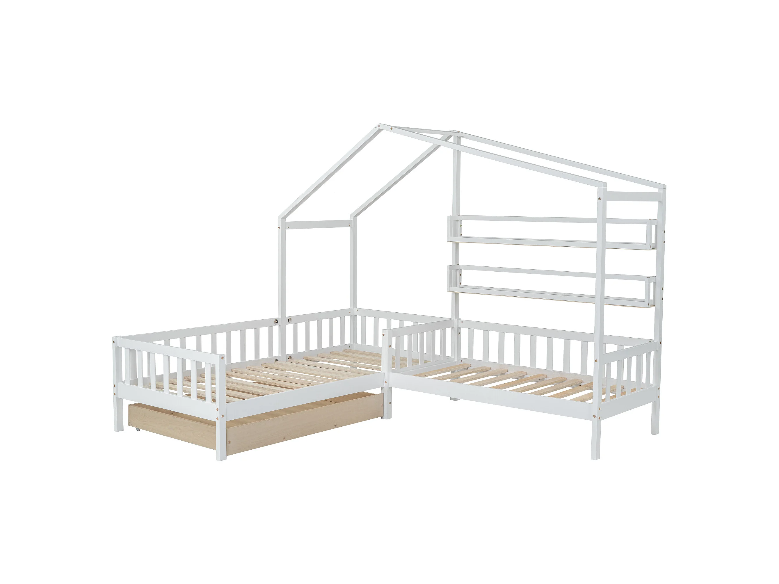 Lit cabane 90 x 200cm et 140 x 70cm - avec tiroirs et étagères de rangement - bois blanc - matelas non inclus