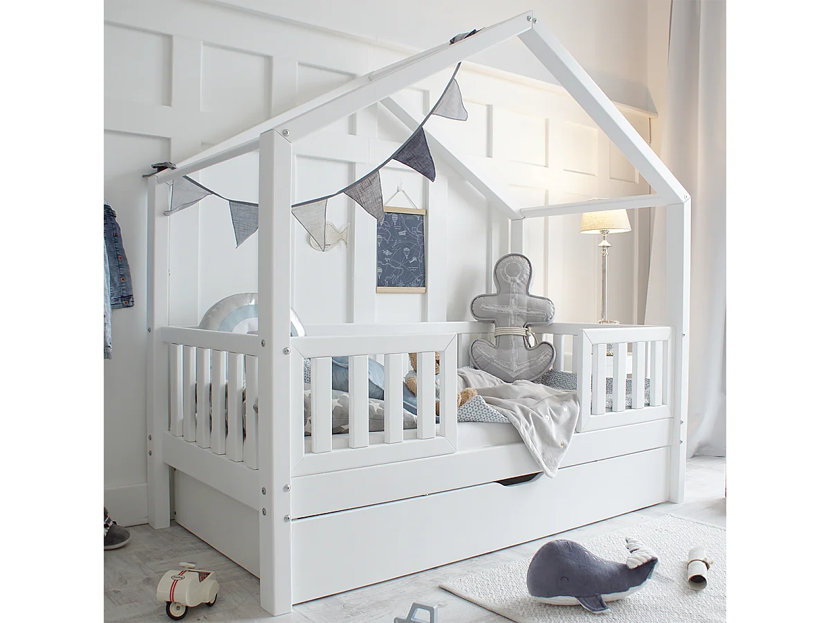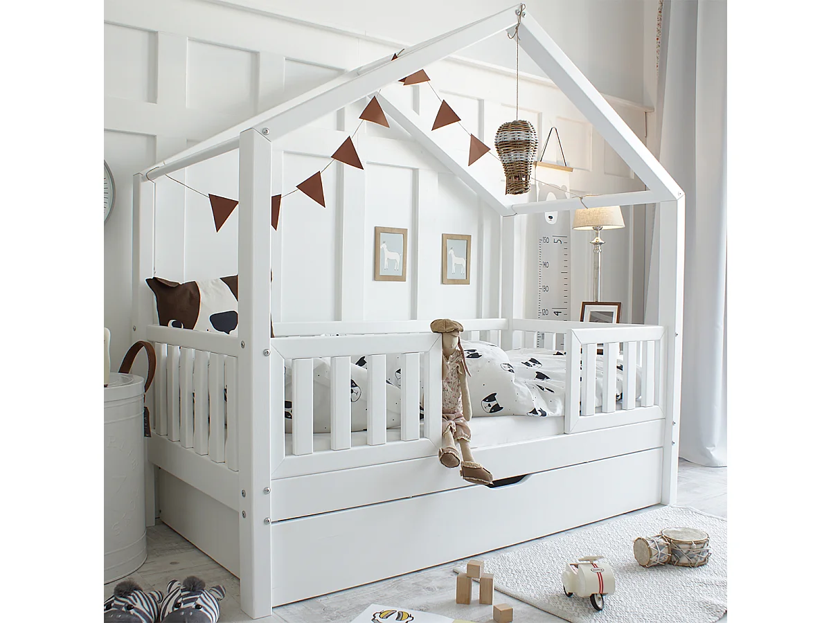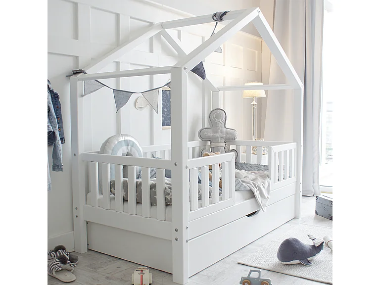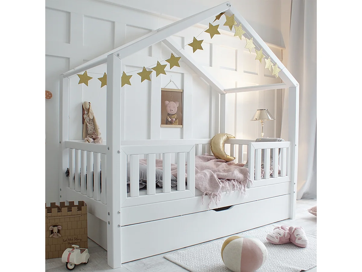 Lit cabane 90x190 barrières sommier et tiroir inclus Roxane Blanc