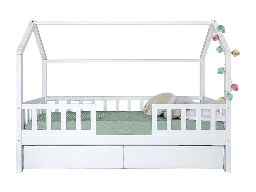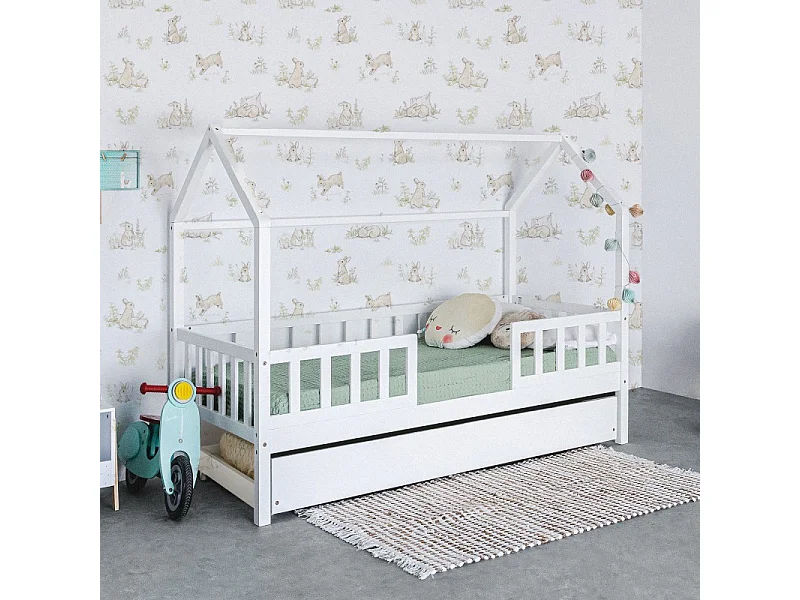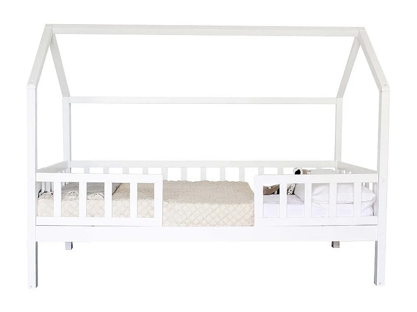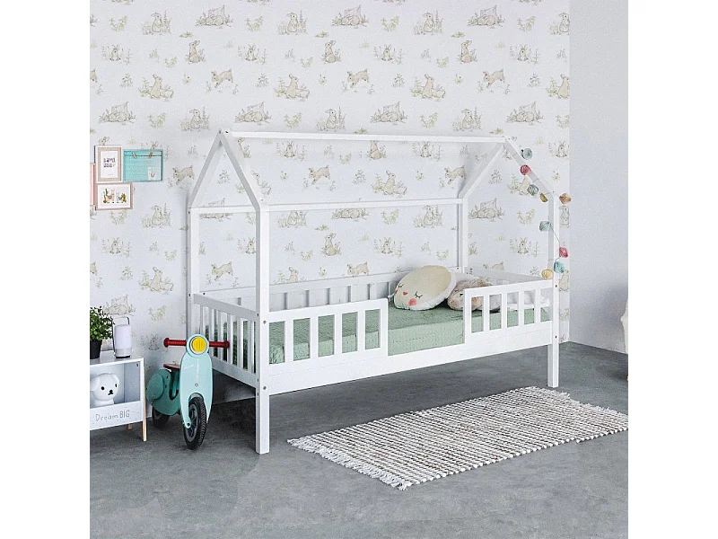 Lit petite maison avec barrièrre en bois blanc 150x200x98cm