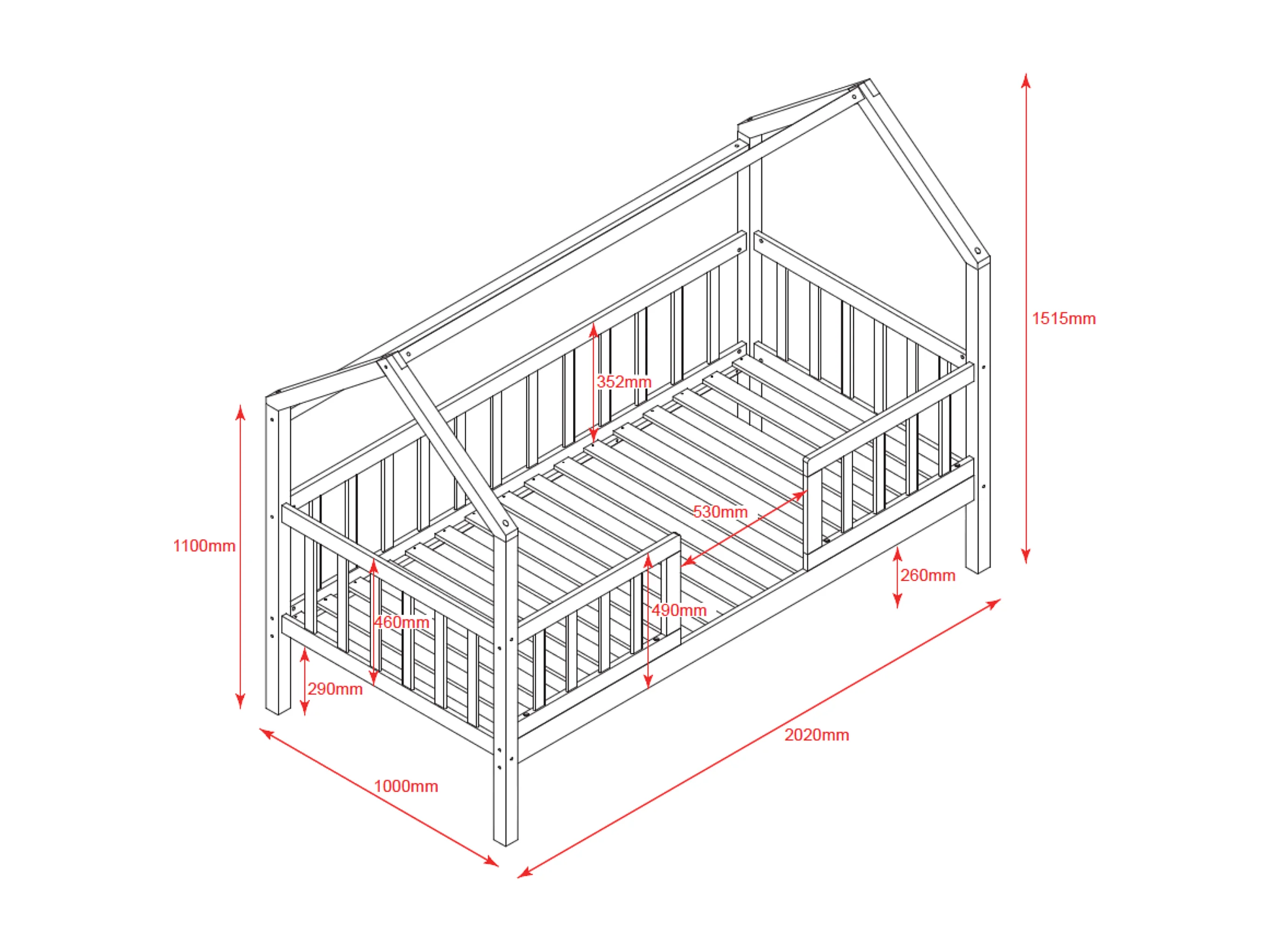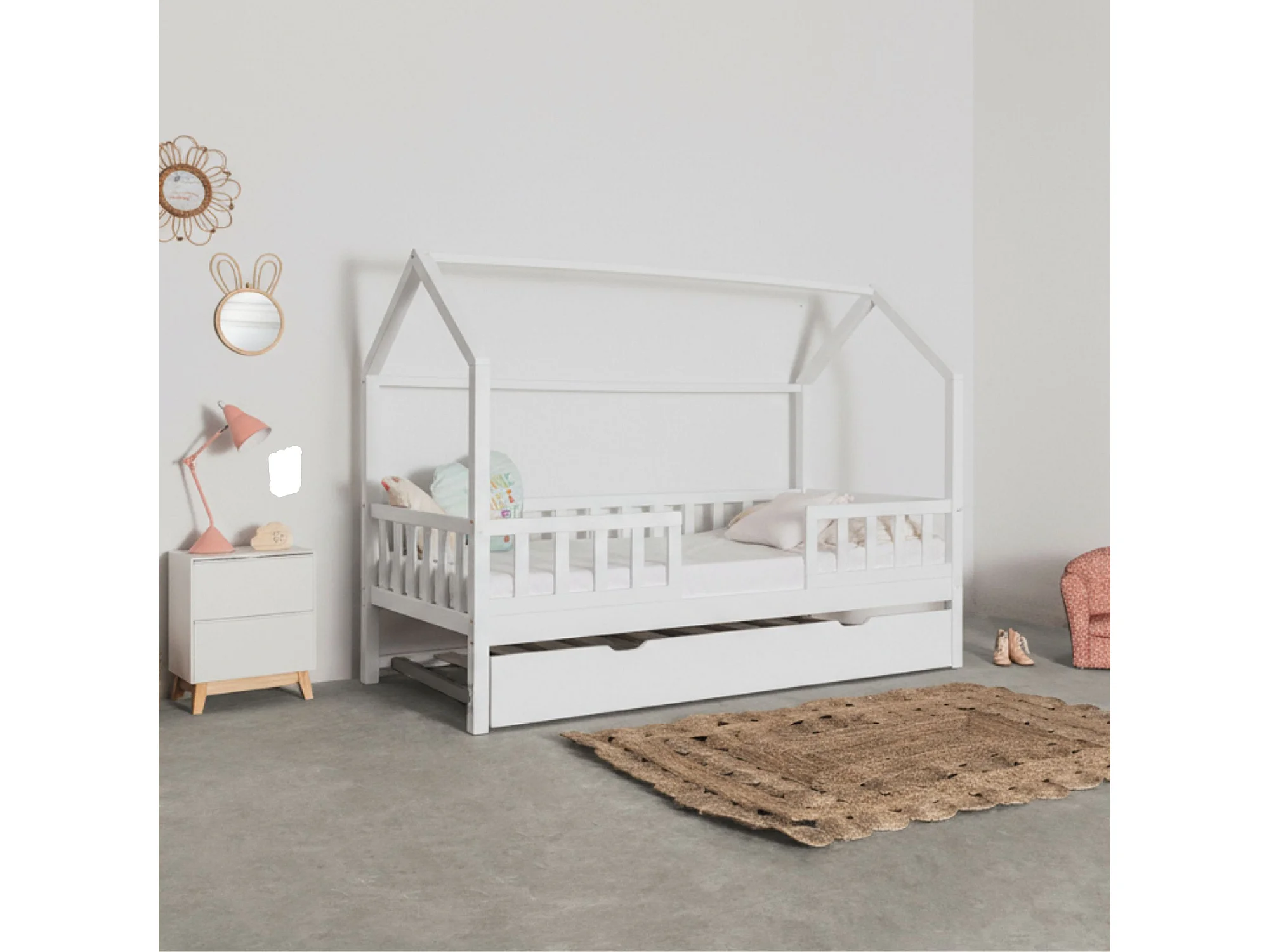 Lit cabane avec barrièrre + lit pieds pliants bois blanc 90x190cm