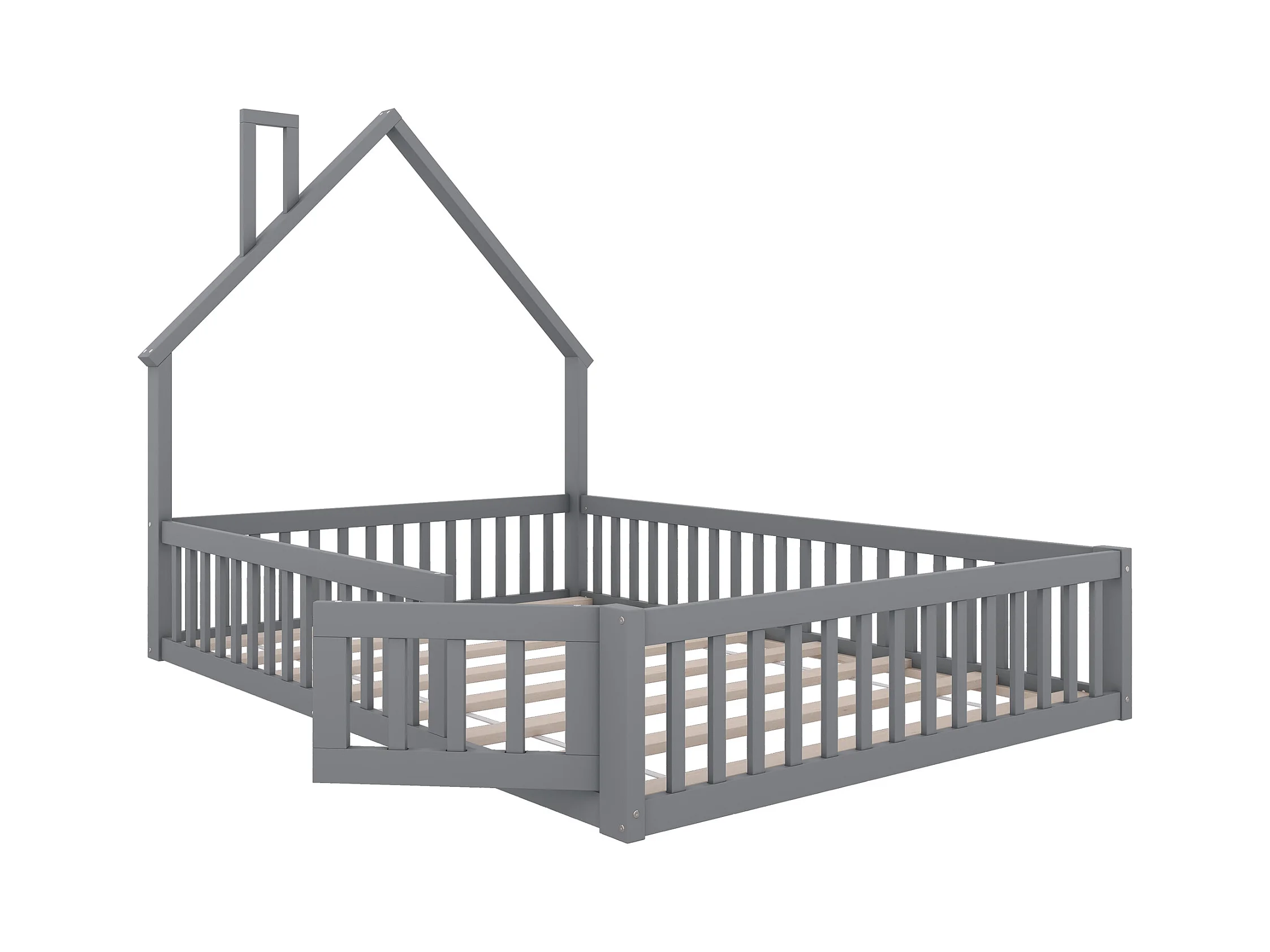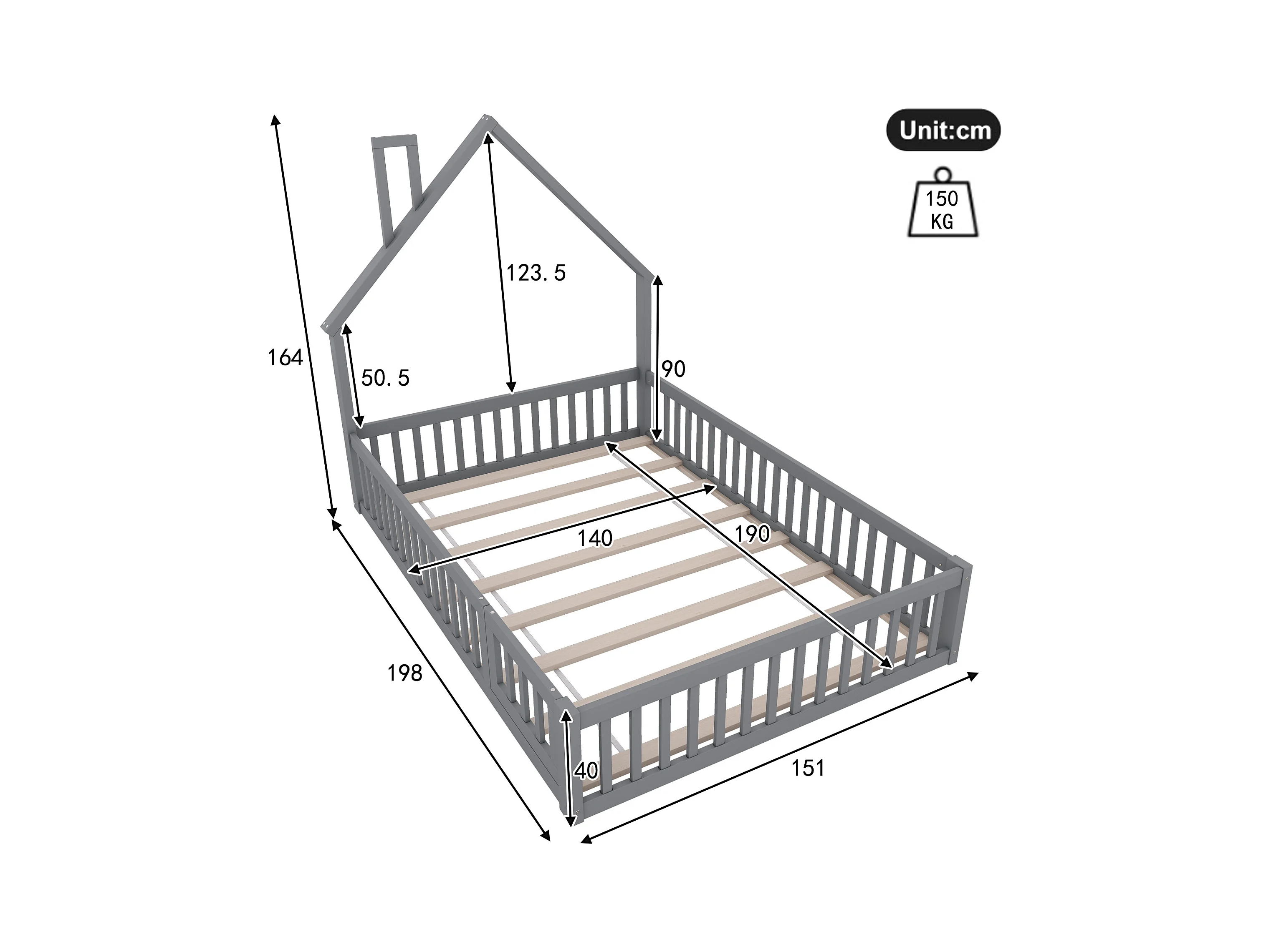 Lit cabane enfant 140x190cm - Lit avec sommier à lattes - Bois massif - Gris (sans matelas)