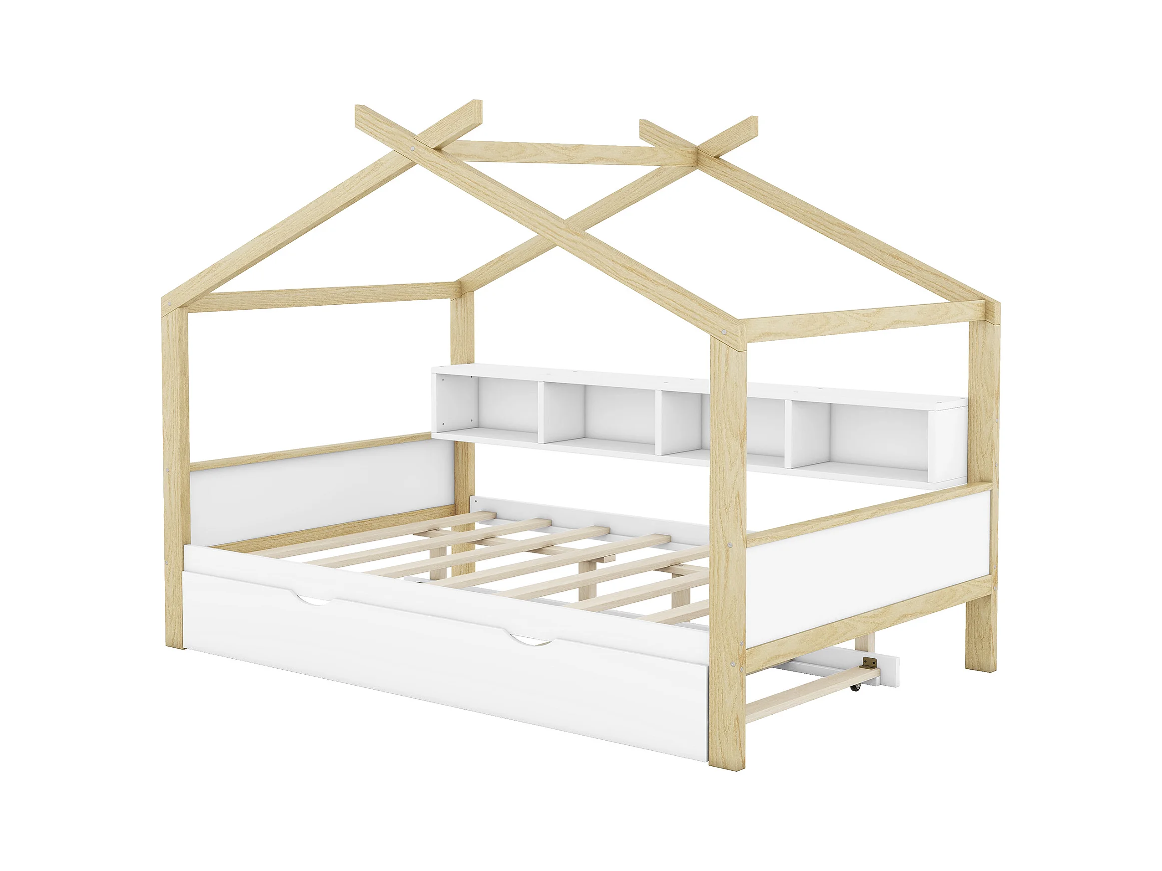 Lit cabane enfant 140x200 cm avec protection anti-chute - lit gigogne et rangements - bois - blanc (sans matelas)