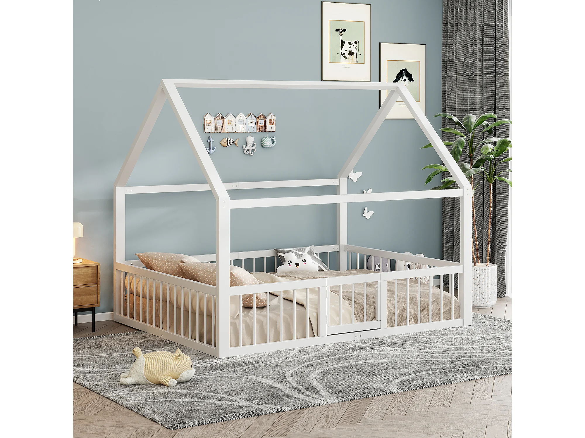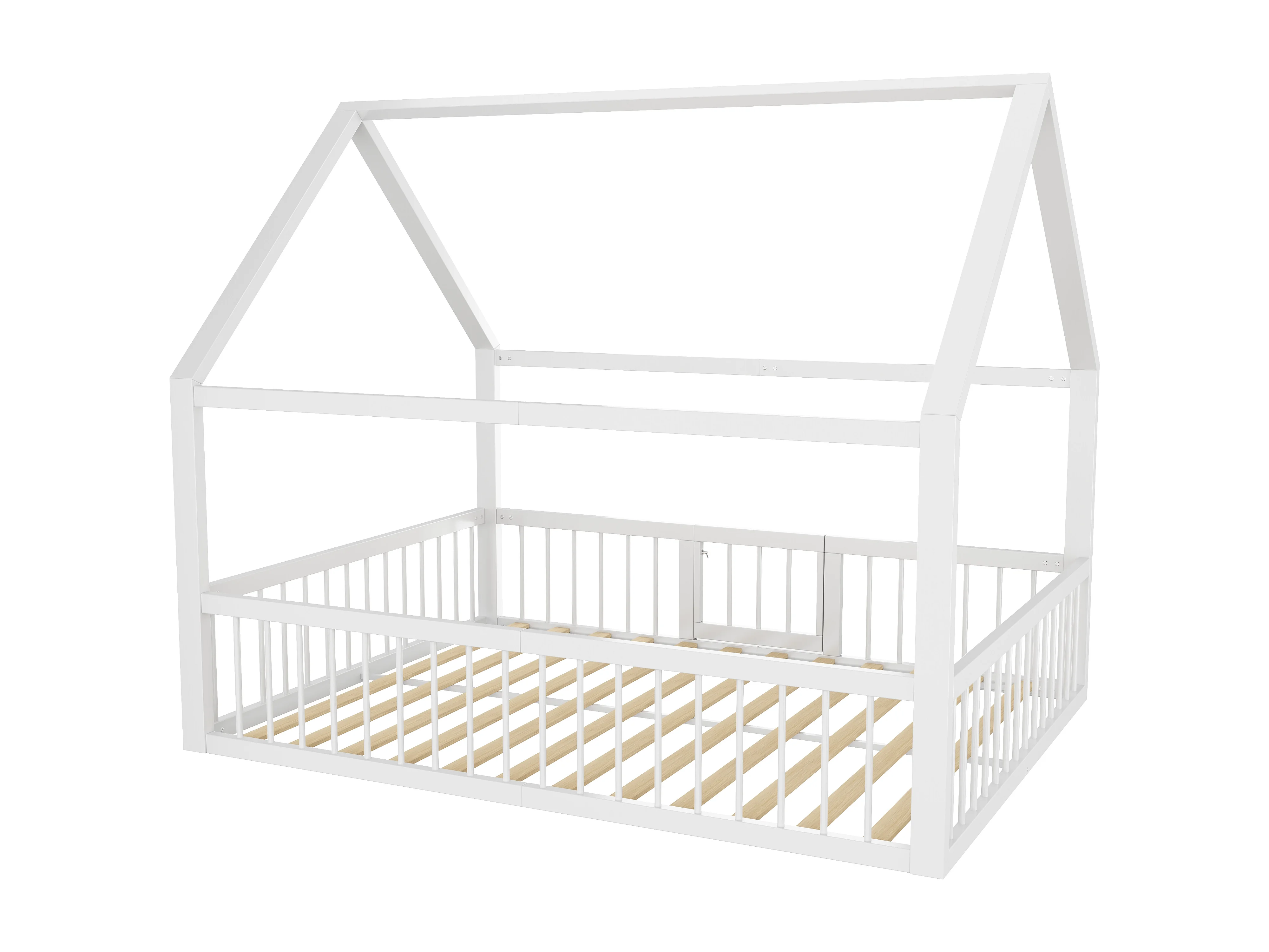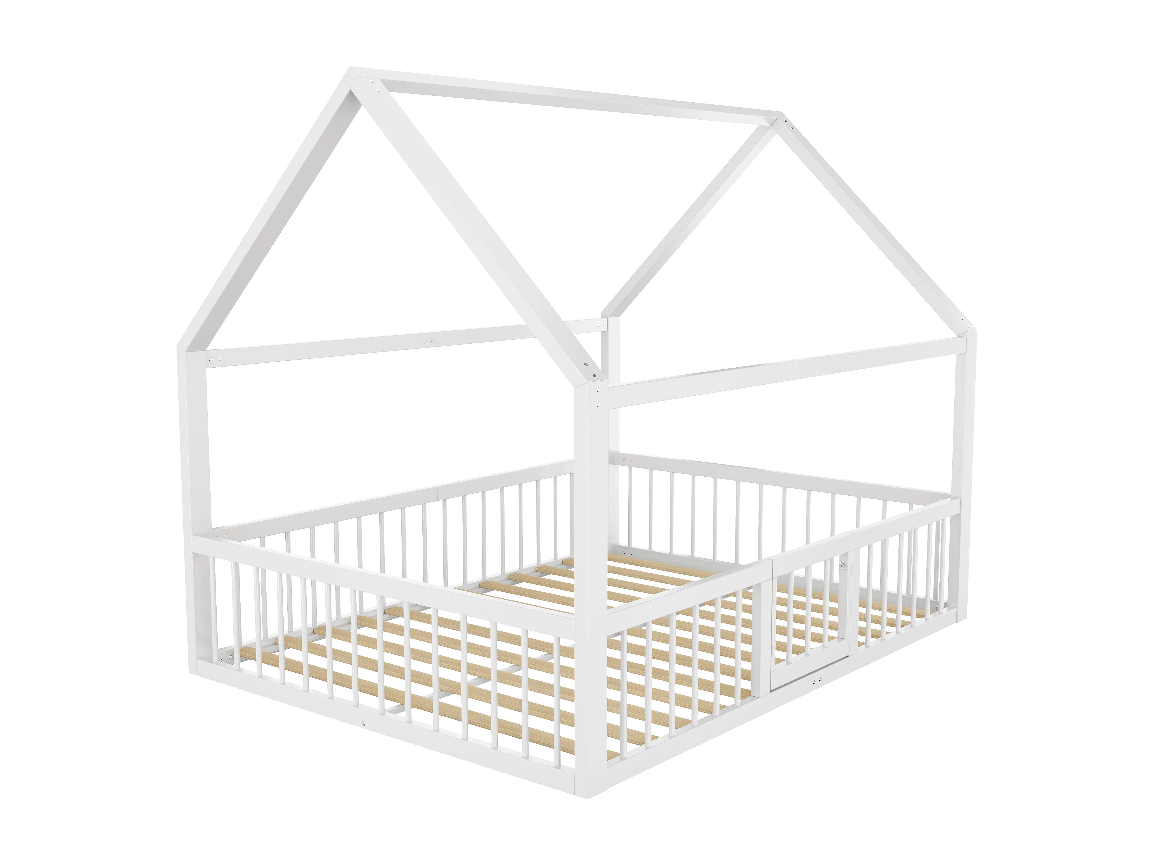 Lit cabane d'enfant 140x200cm, lit en bois massif, lit plat, avec sommier à lattes, barrière de lit avec porte, blanc