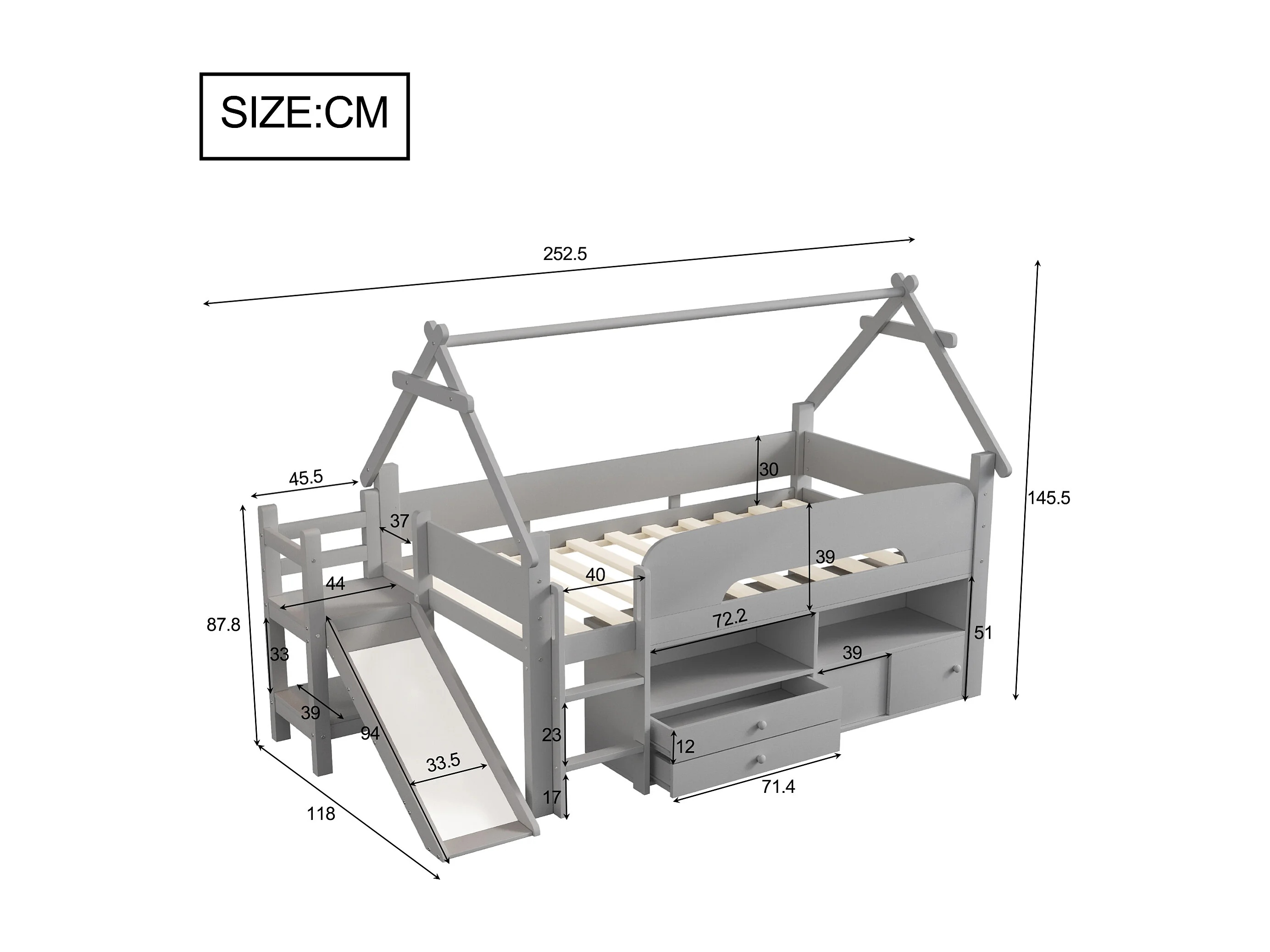 Lit cabane enfant 90x200 cm - avec toboggan de sécurité - avec 2 tiroirs - avec barrières de sécurité - gris (matelas non inclus)