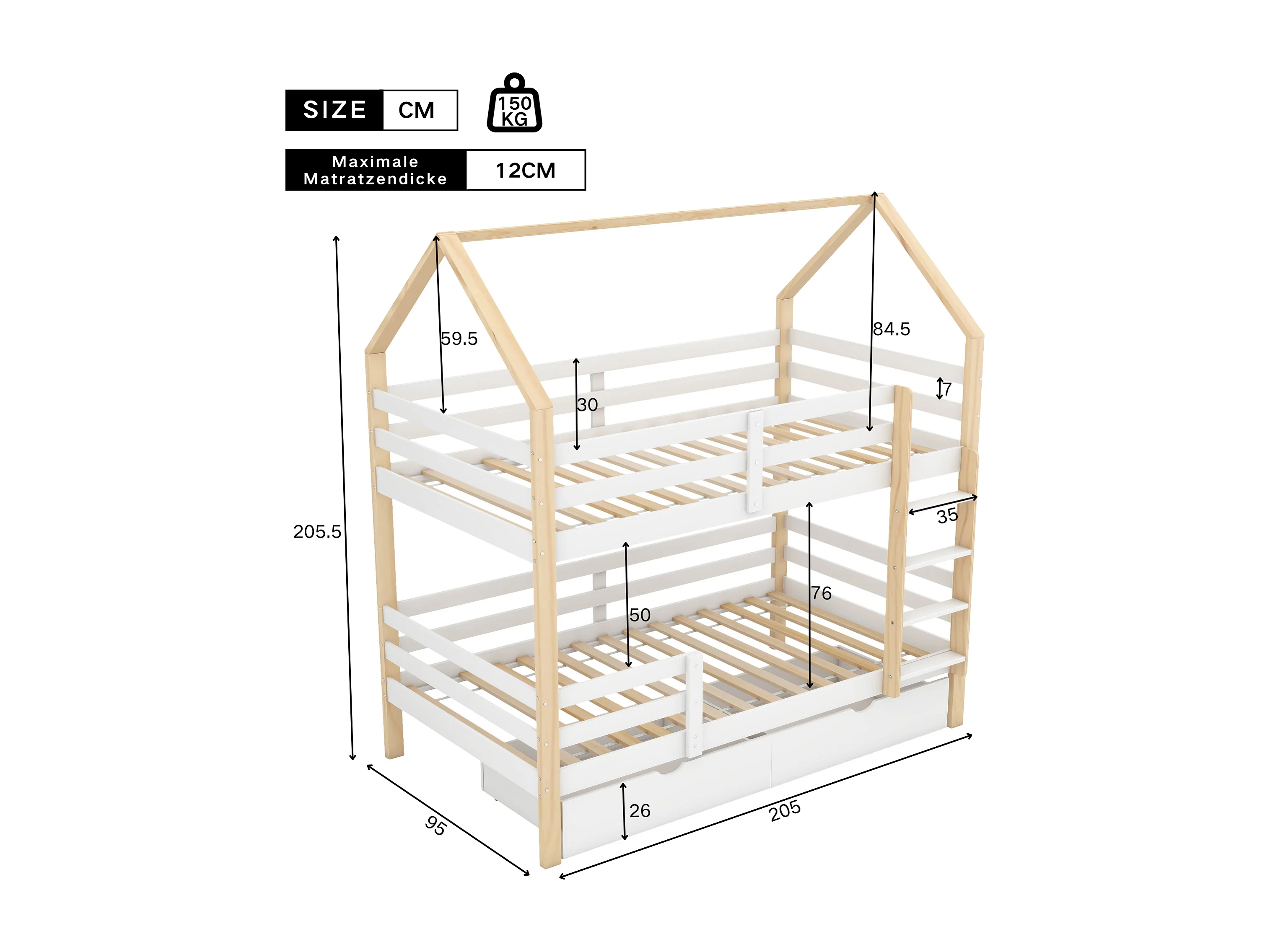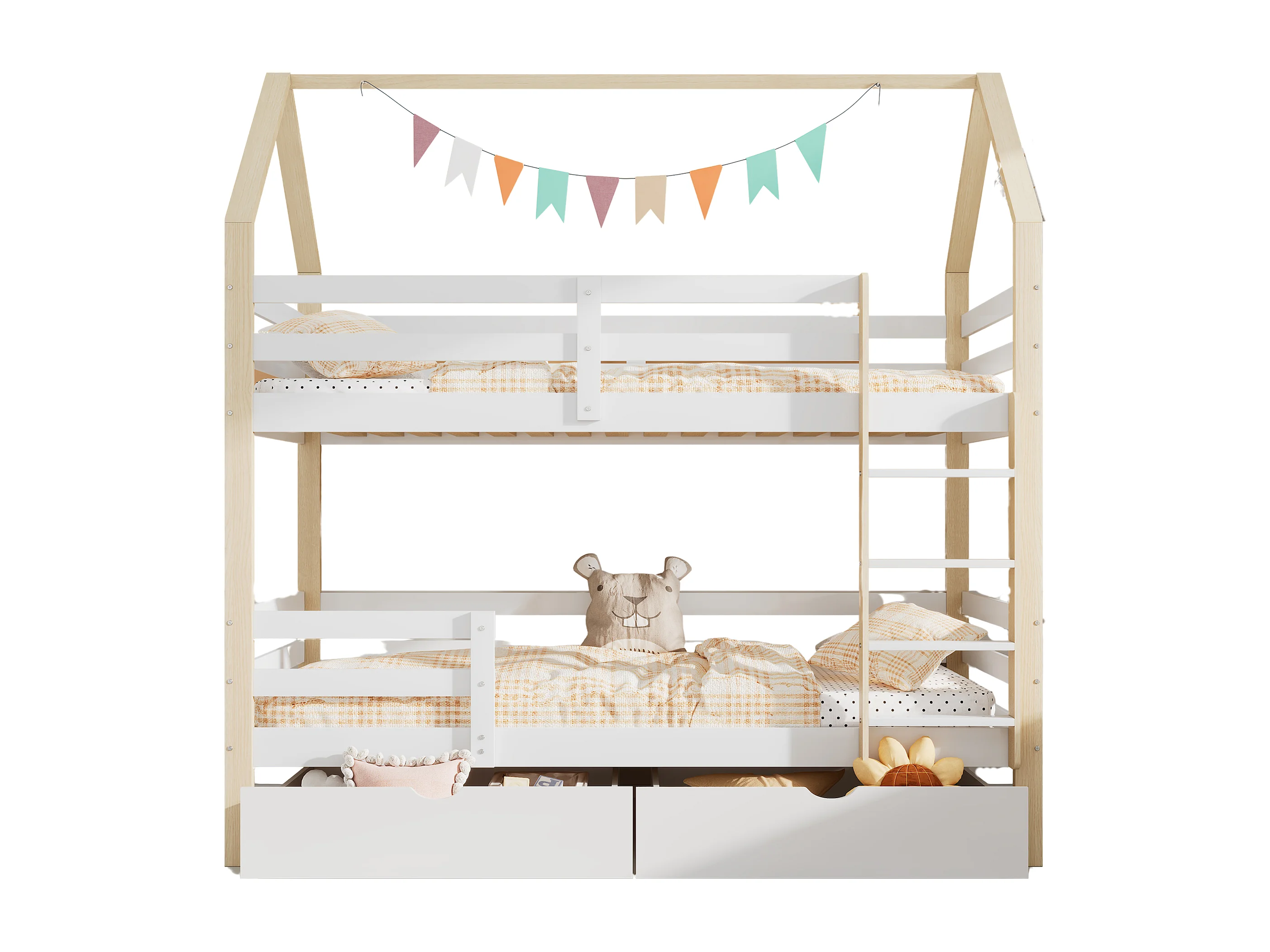 Lit cabane enfant 90×200 cm blanc et bois naturel, avec grands tiroirs, sommier en pin massif