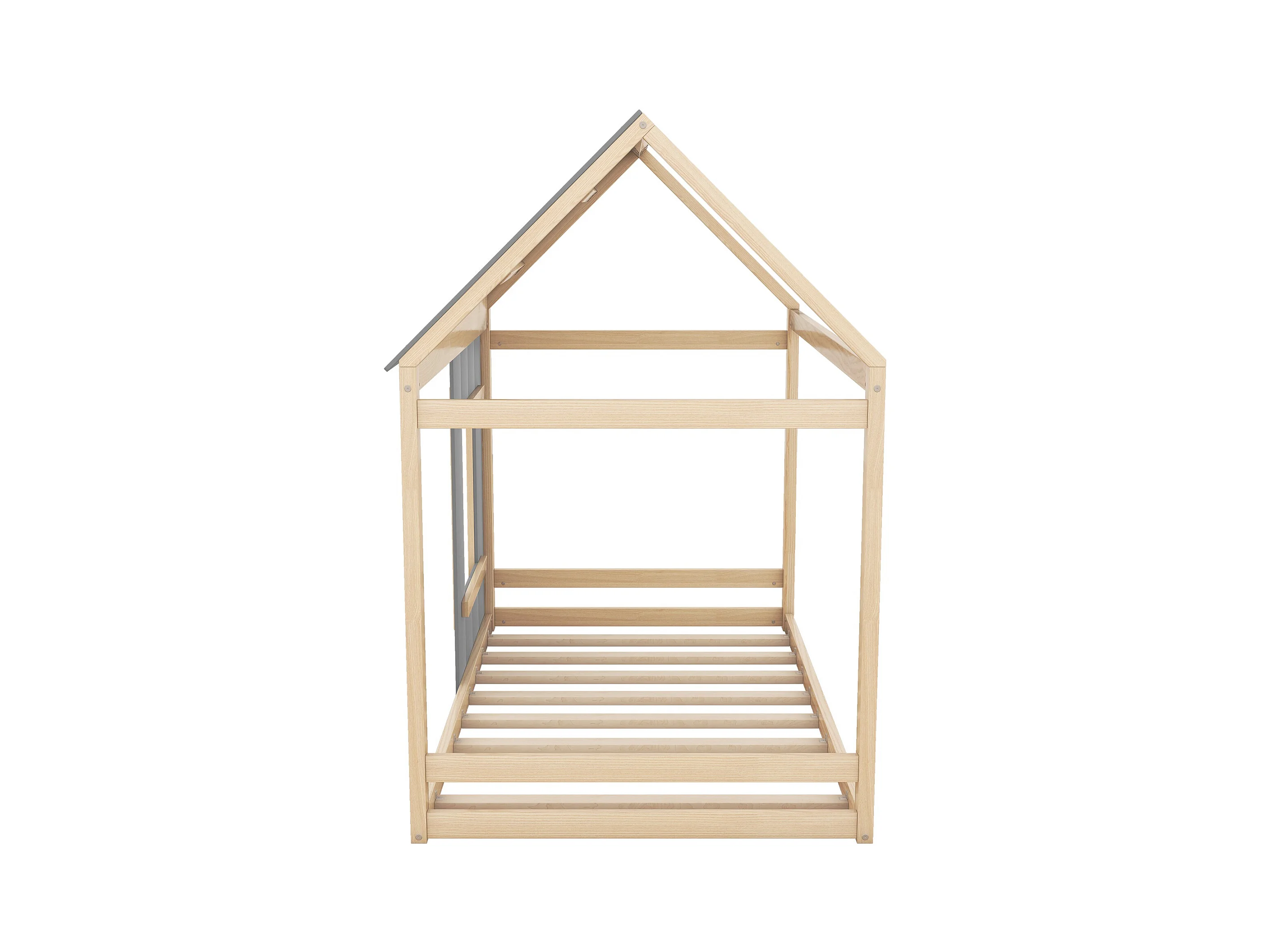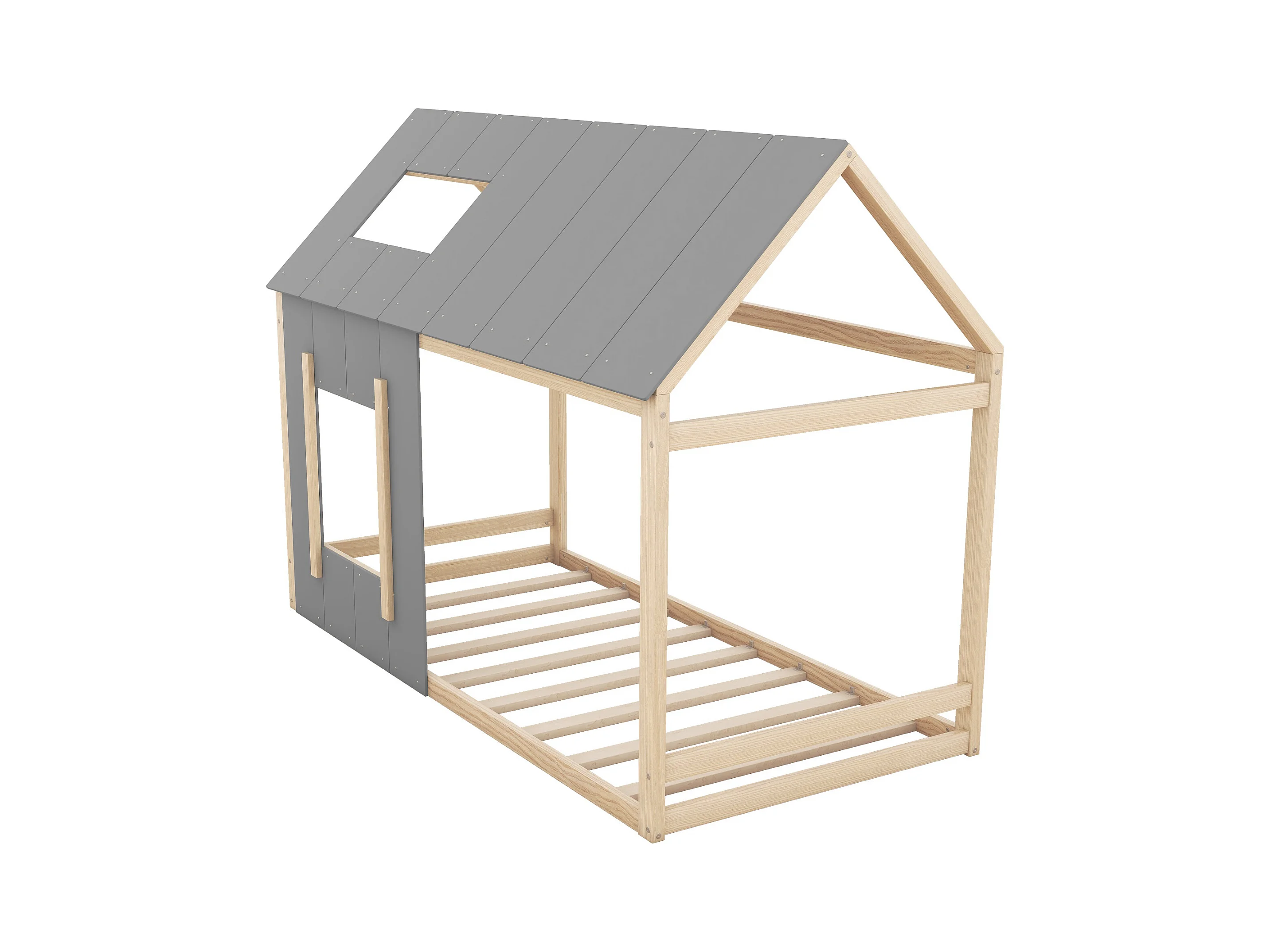Lit cabane en bois de pin 90x200cm - lit enfant avec toit et fenêtre et sommier à lattes - Naturel