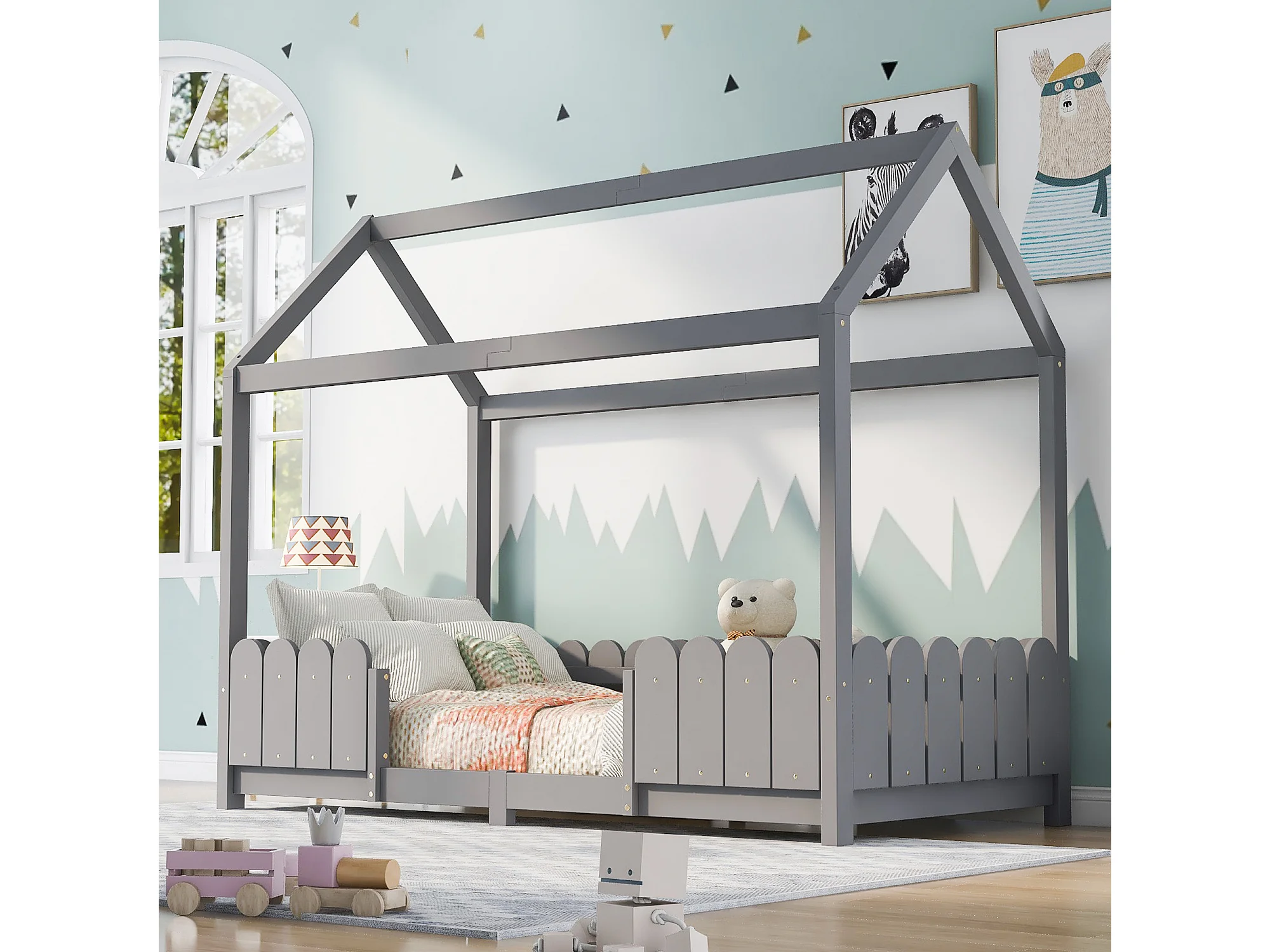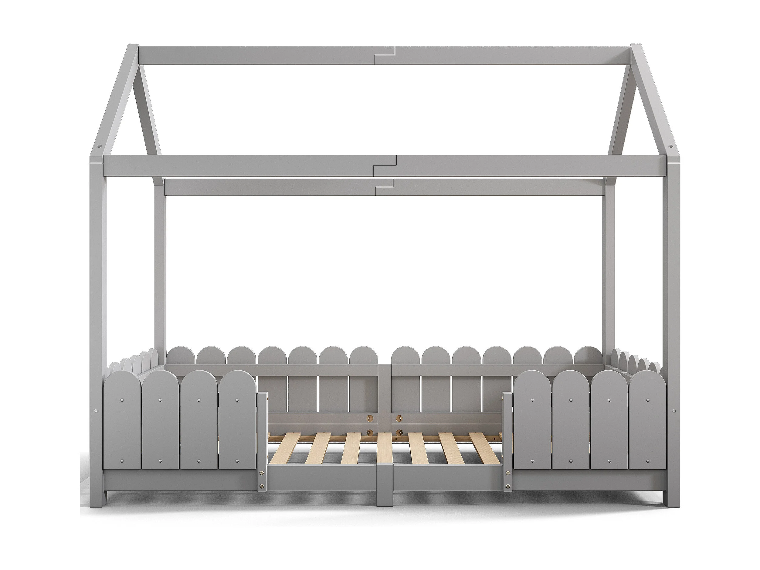 Lit cabane 90x200cm 2 en 1, en bois avec barrières de sécurité et toit décoratif, gris, sans matelas