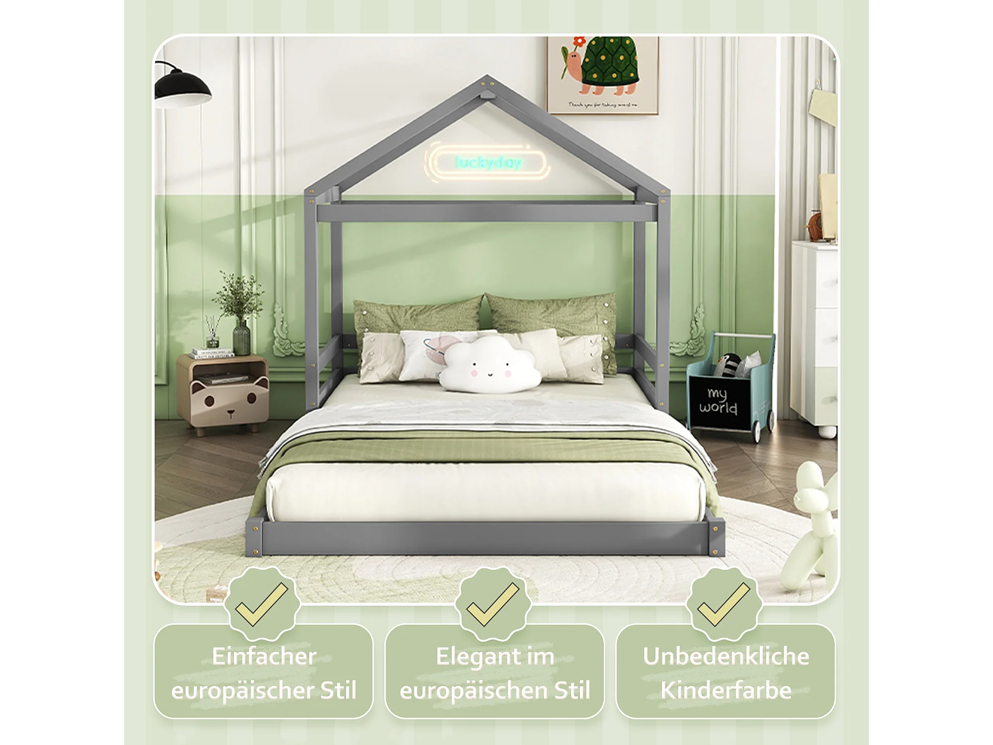 Lit cabane enfant, style minimaliste, pin massif, gris (206x149x160 cm)