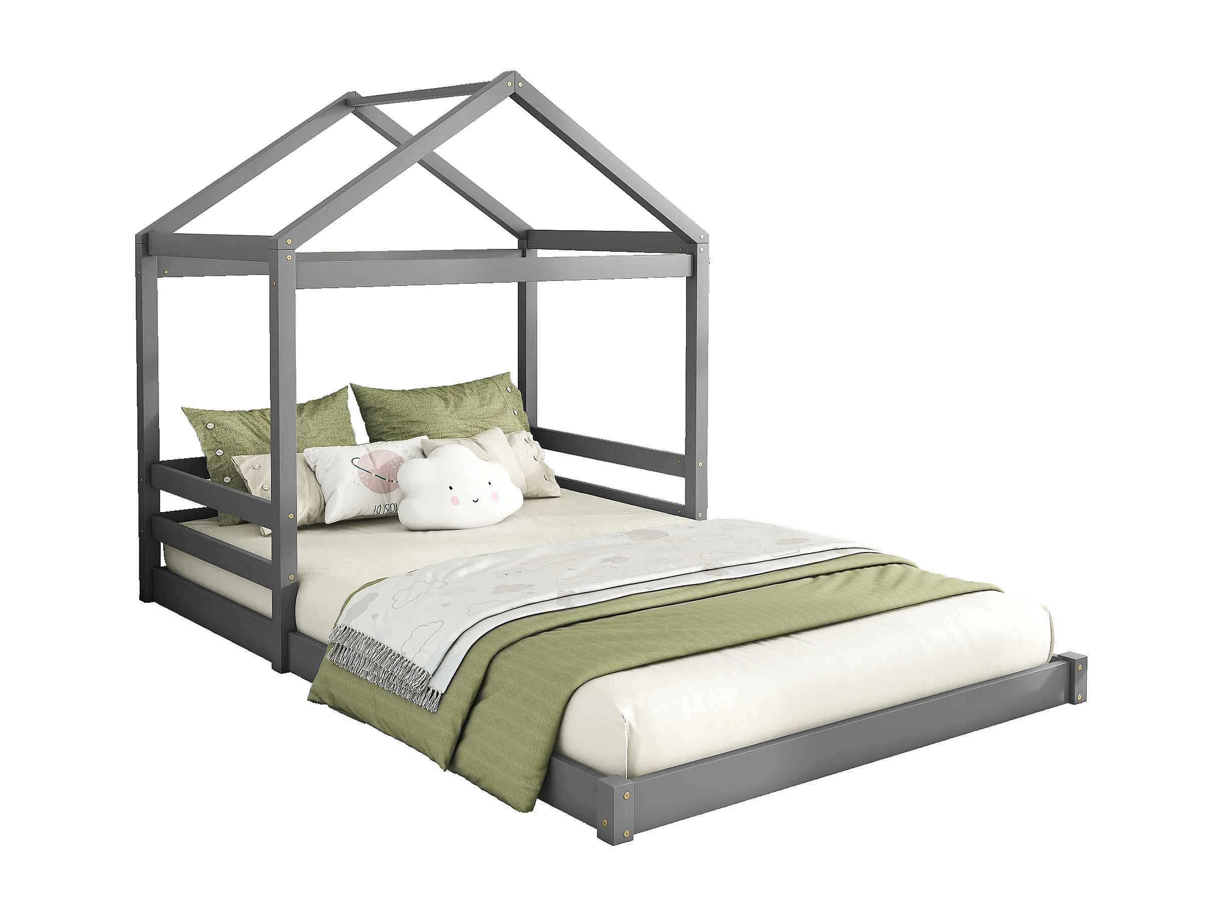 Lit enfant cabane 140x200cm avec une table de chevet et barrières de sécurité - sommier à lattes - Gris