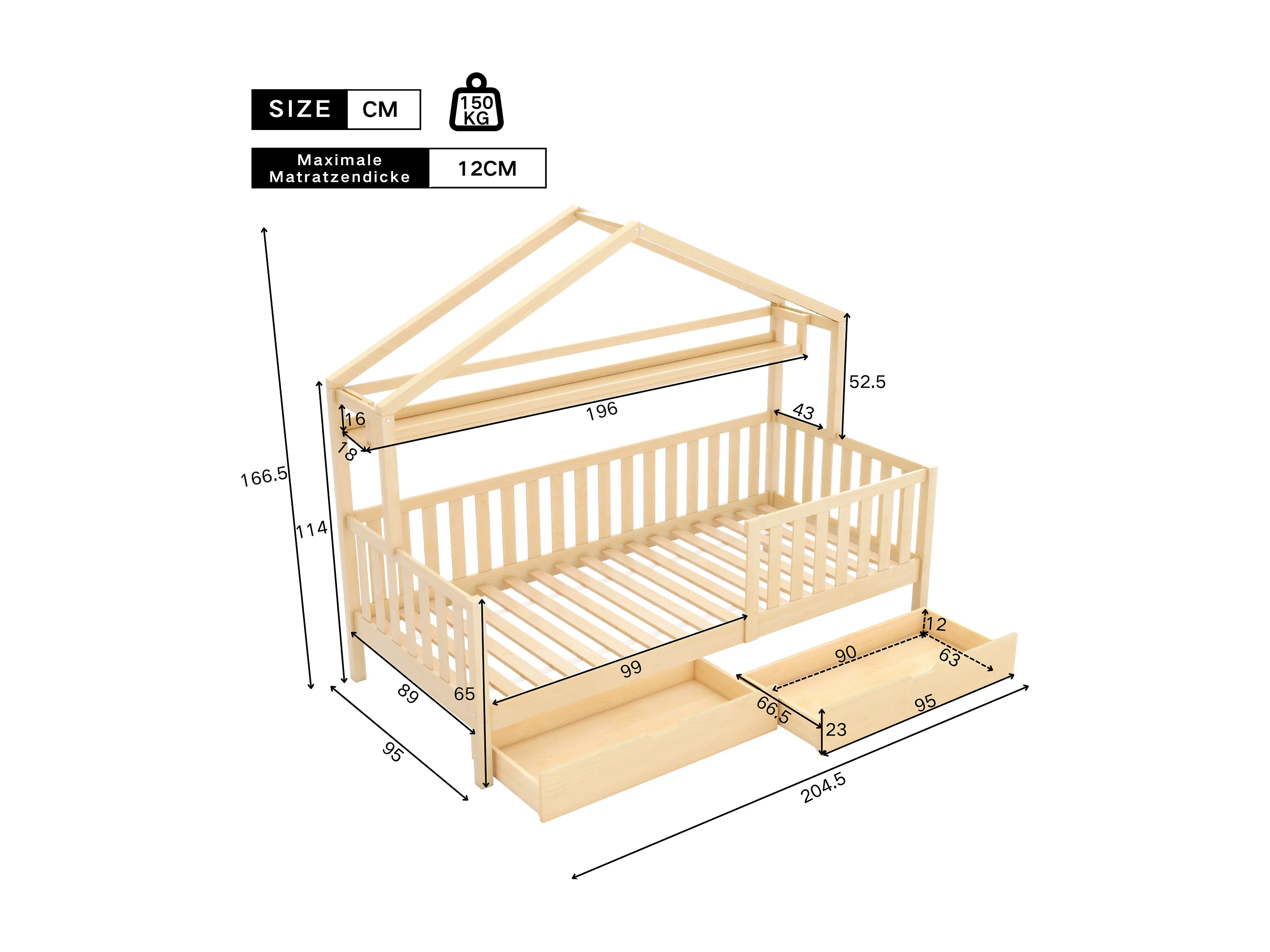 Lit cabane pour enfant - 90 x 200 cm - avec 2 tiroirs + sommier à lattes - bois - naturel