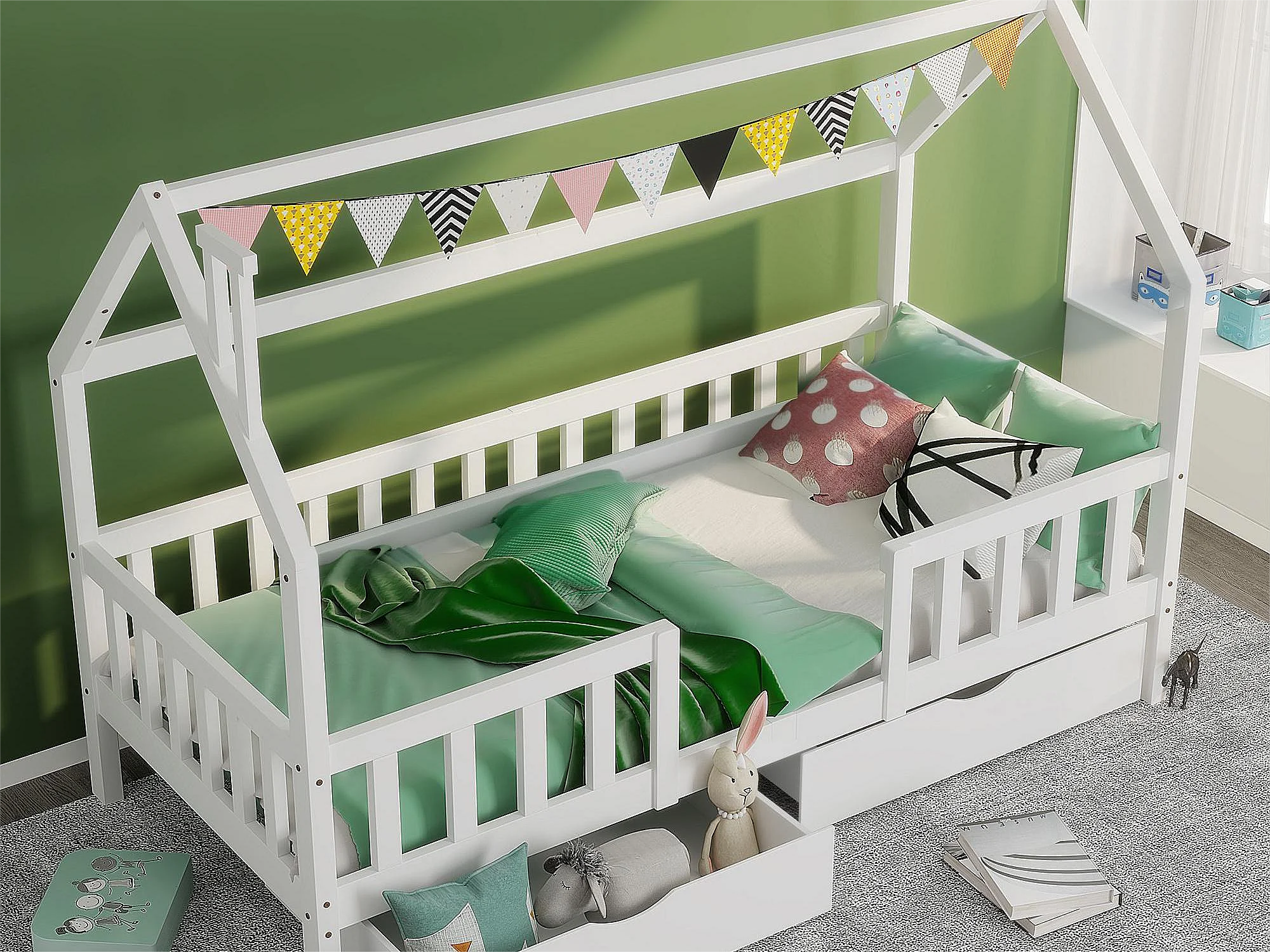Lit cabane pour enfant 90x200cm - Bois pin massif - 2 Tiroirs espace de rangement - avec sommier à lattes et barrière - Blanc
