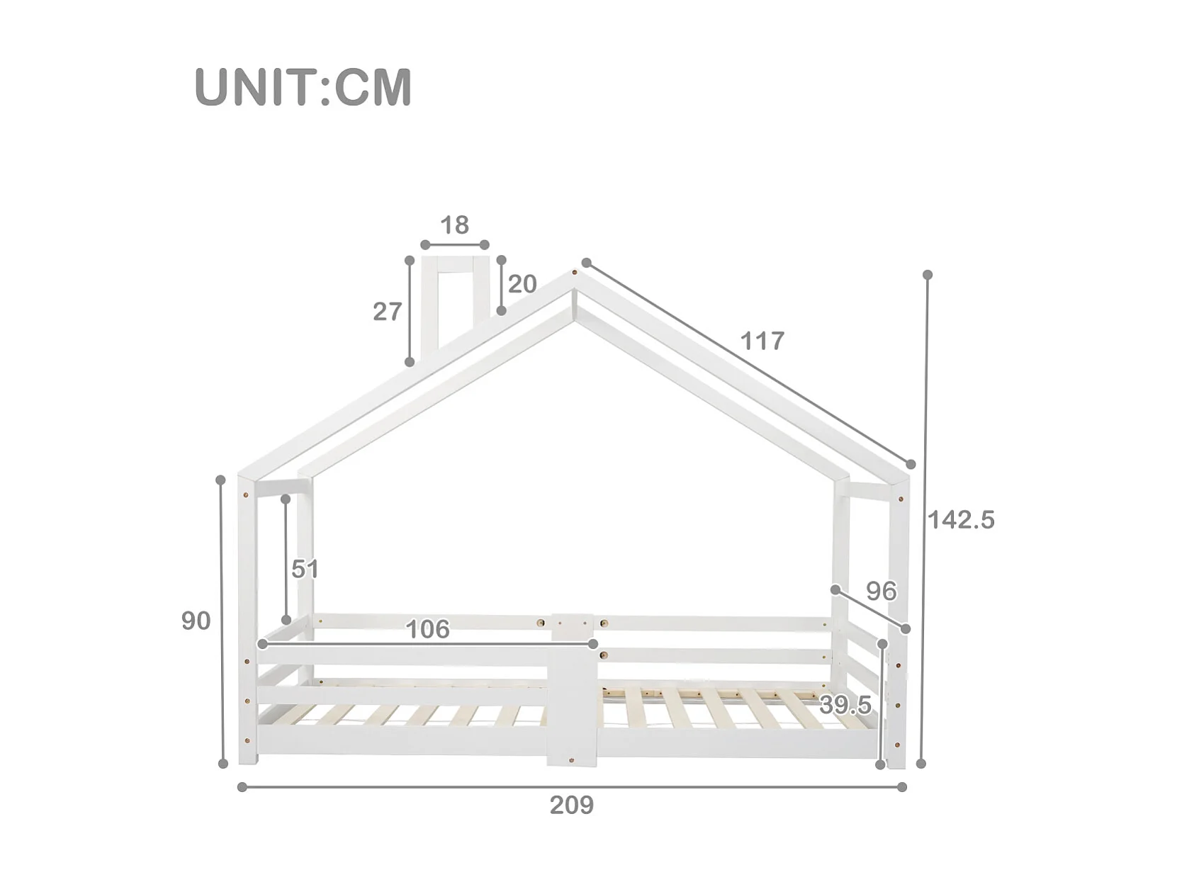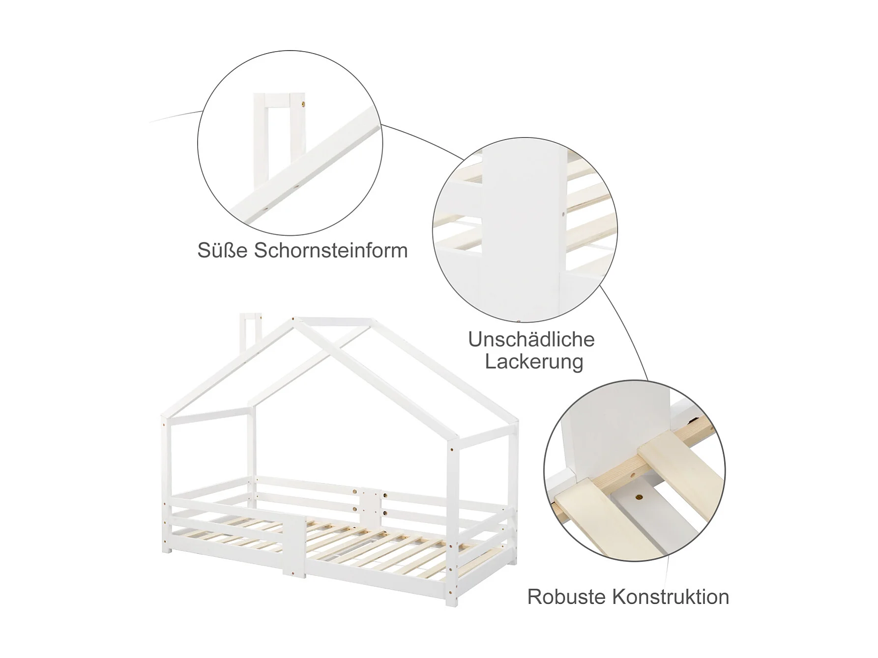 Lit cabane pour enfant avec cheminée, protection antichute, cadre à lattes robuste, bois de pin, 90x200 cm, blanc (sans matelas)
