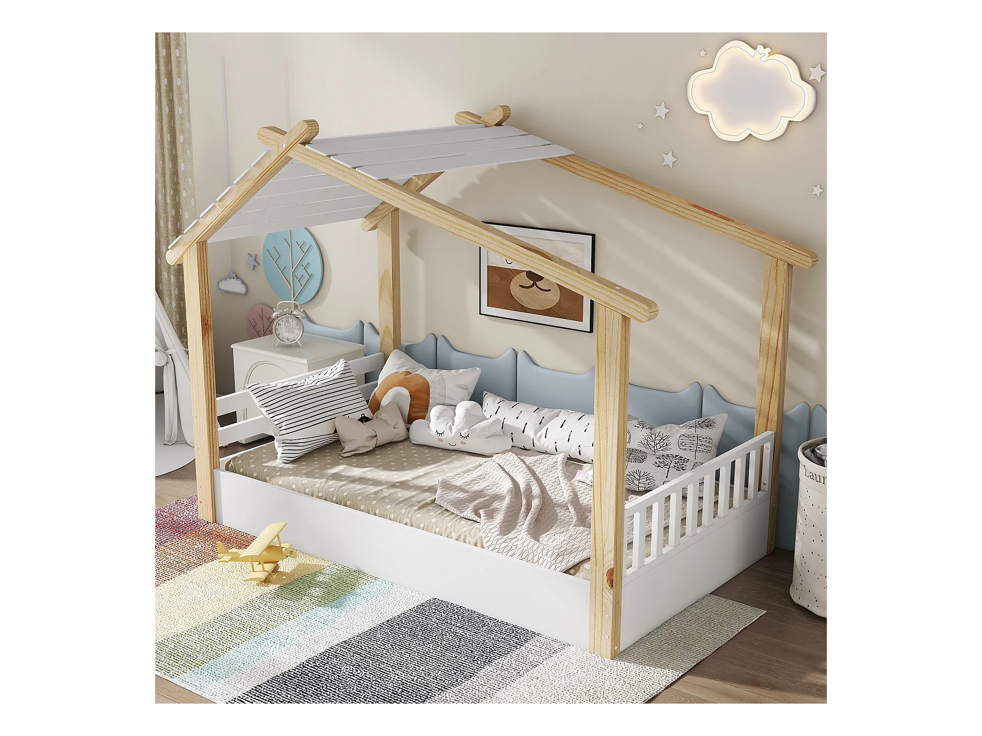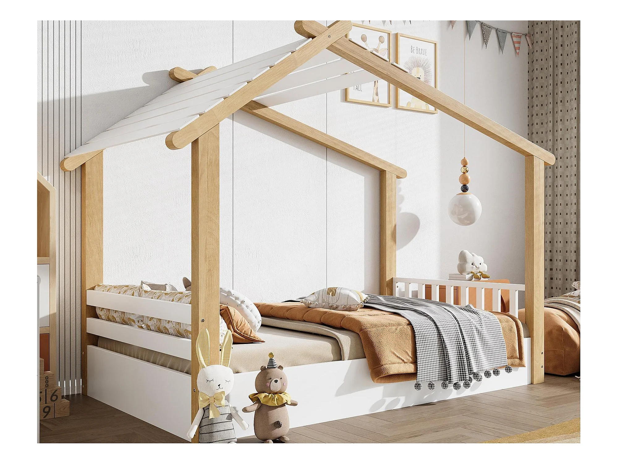 Lit cabane 90x190 barrières et sommier inclus pieds 1 cm Lucile Bois et blanc