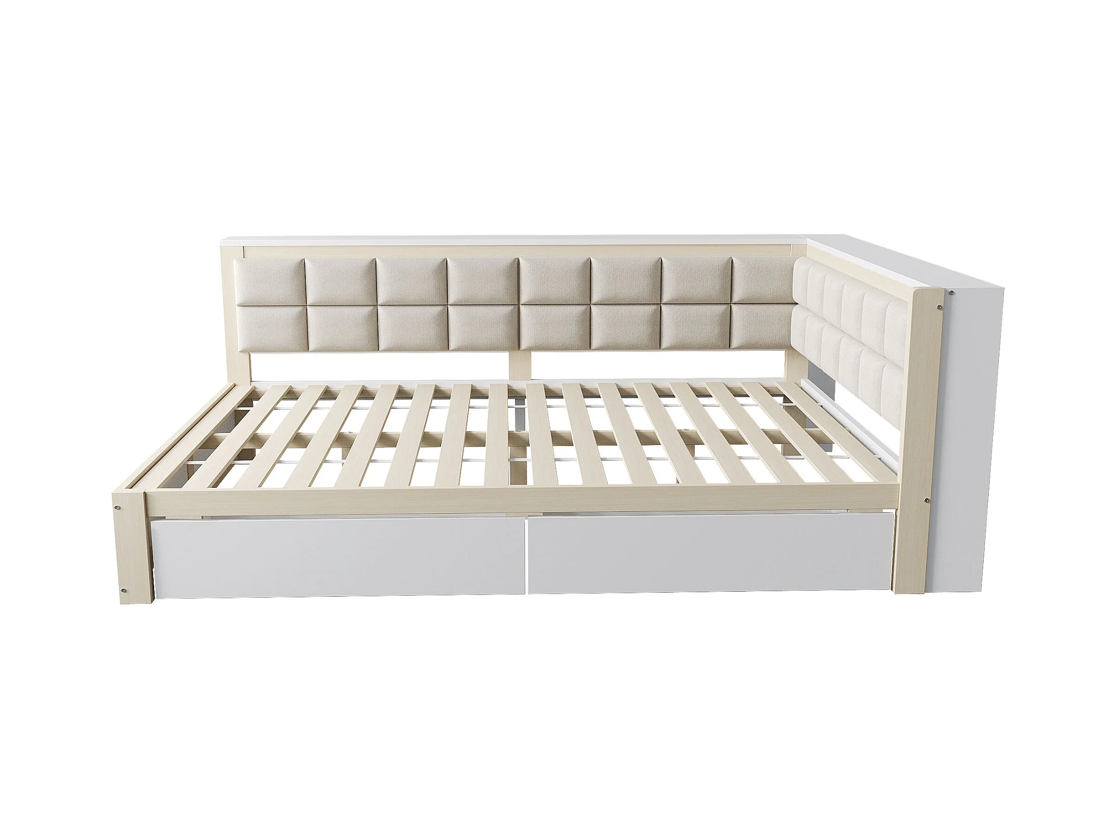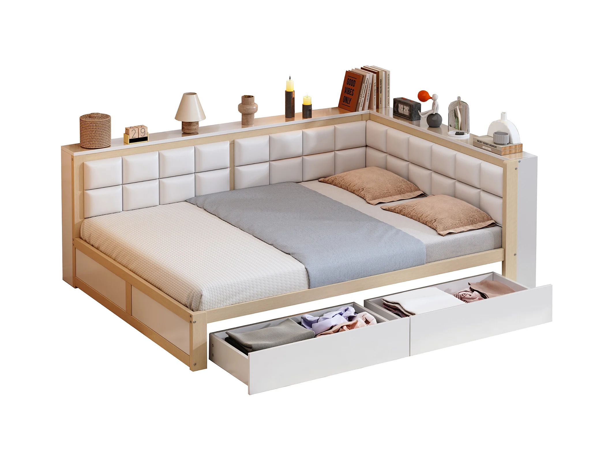 Lit-canapé en bois multifonctionnel, dossier rembourré, avec tiroirs de rangement, pin naturel (140x200 cm)