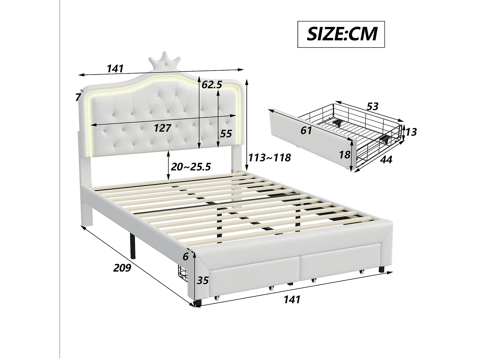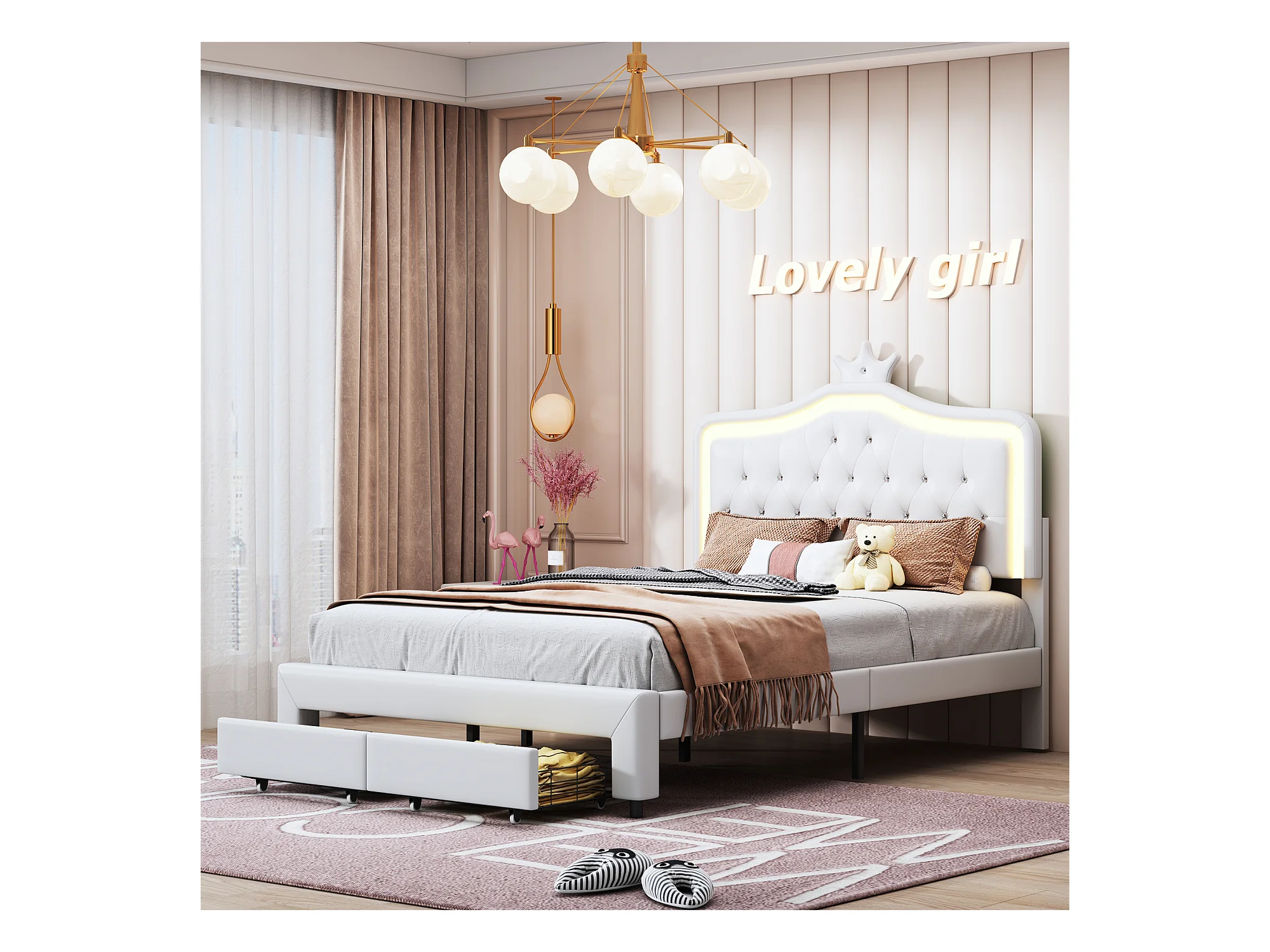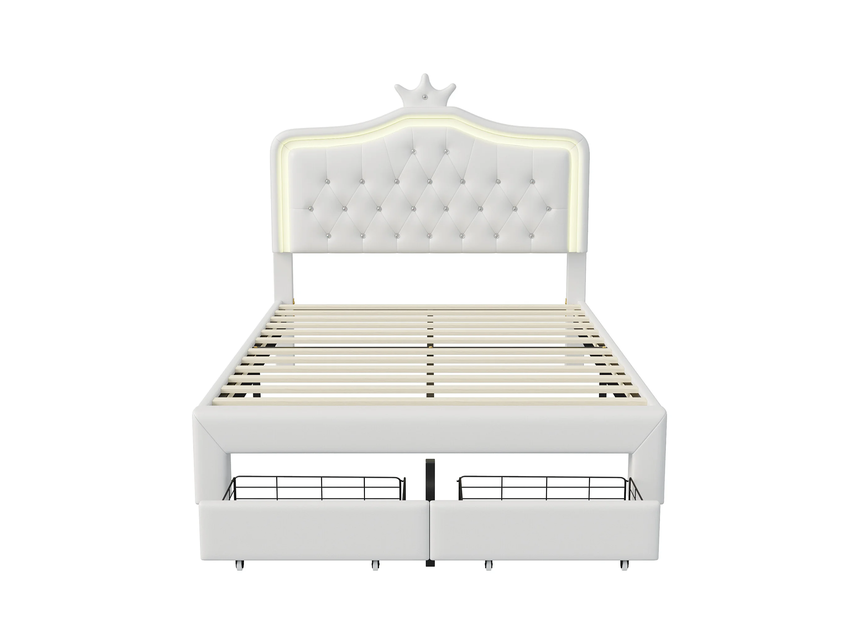 Lit capitonné 140 x 200 cm avec 2 tiroirs et lumières LED - motif en couronne - sommier à lattes - blanc