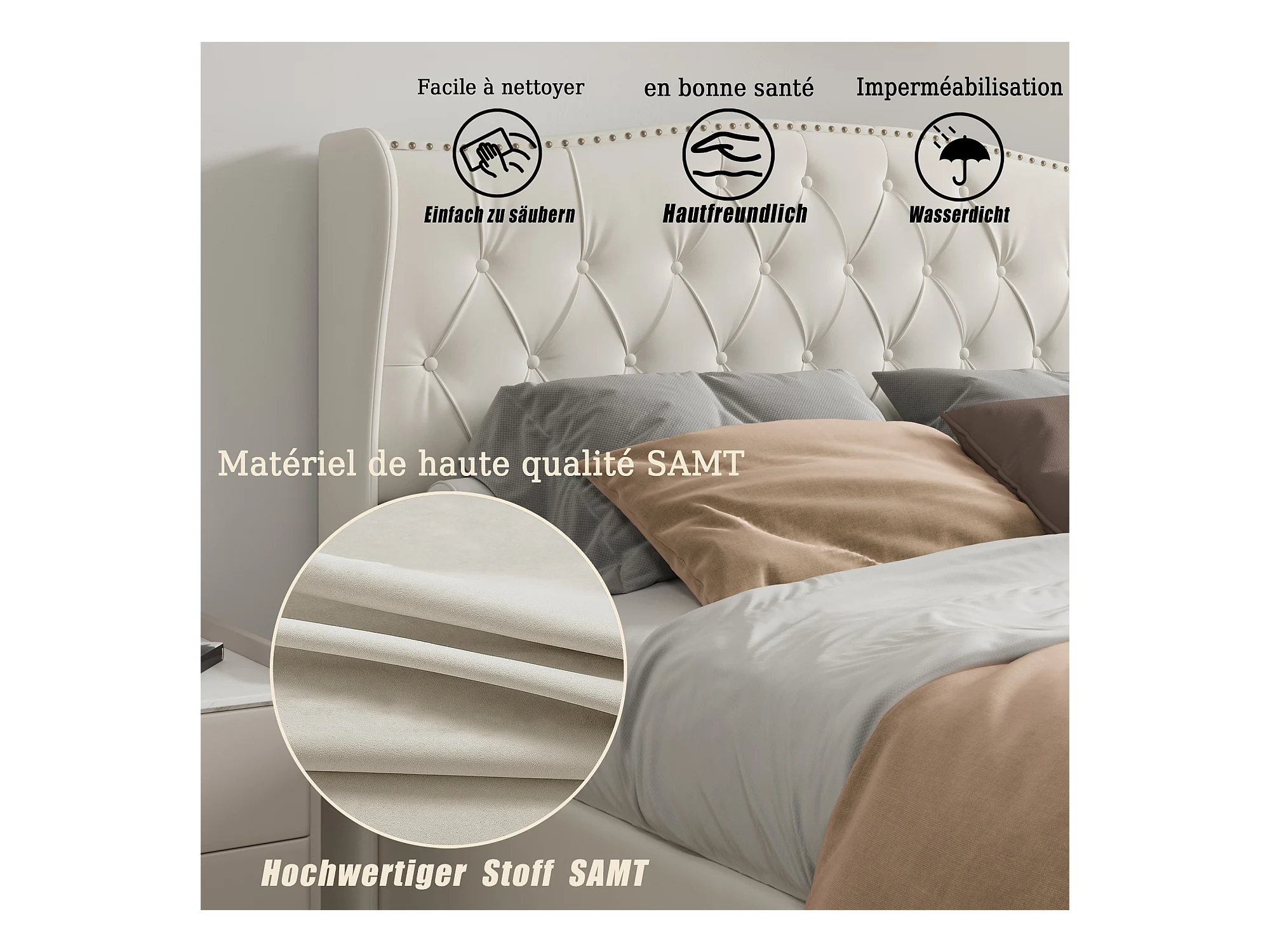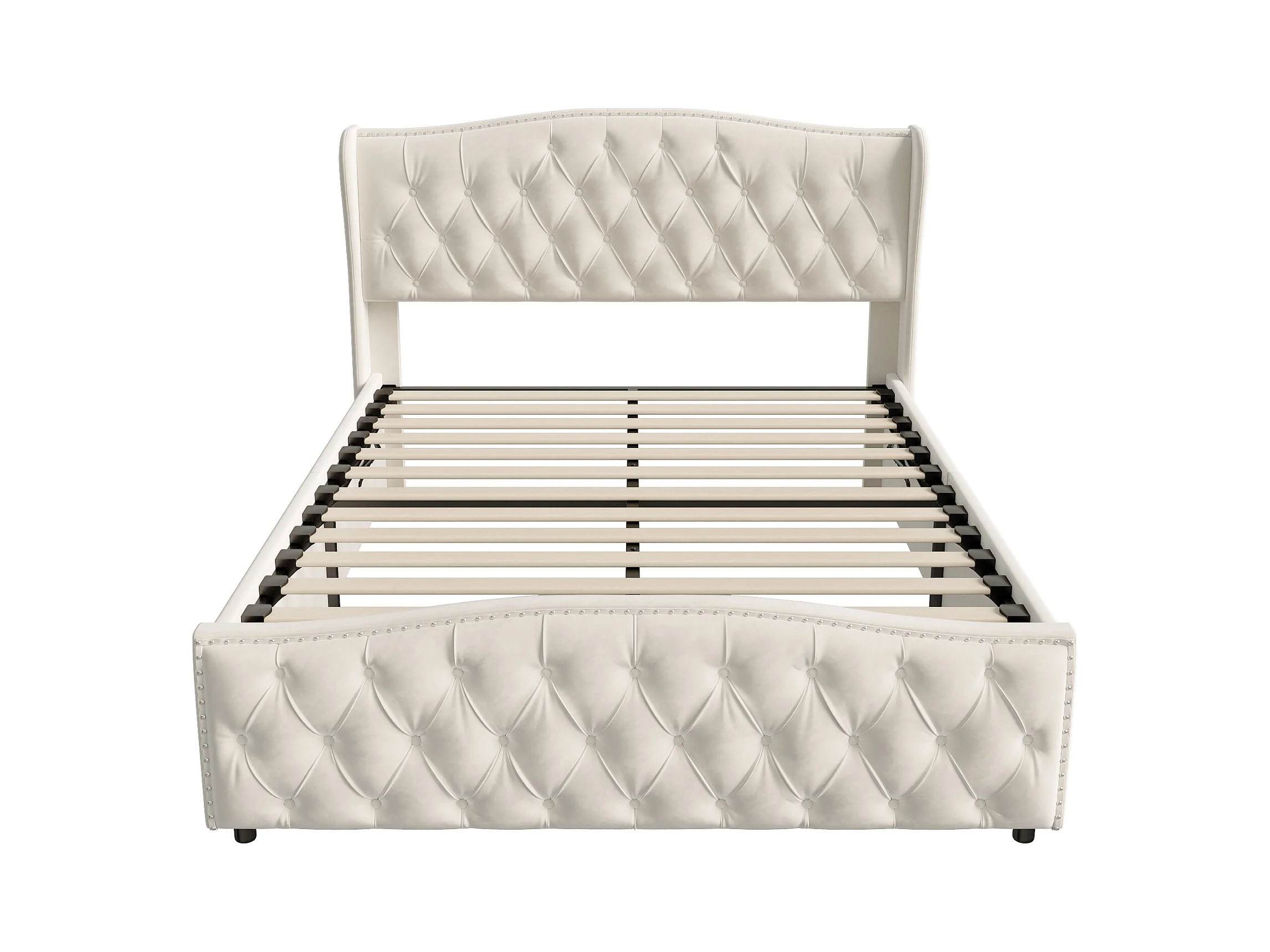 lit coffre 140x200,lit capitonné avec sommier à lattes,tête de lit ondulée,design rivet,velours,beige