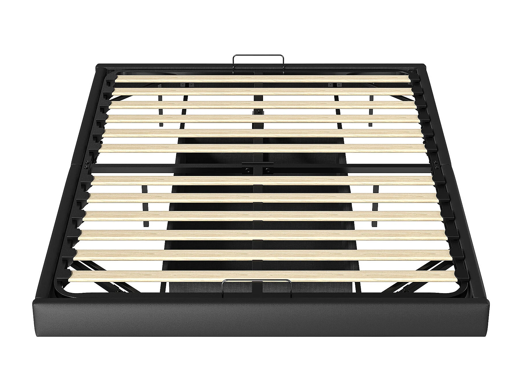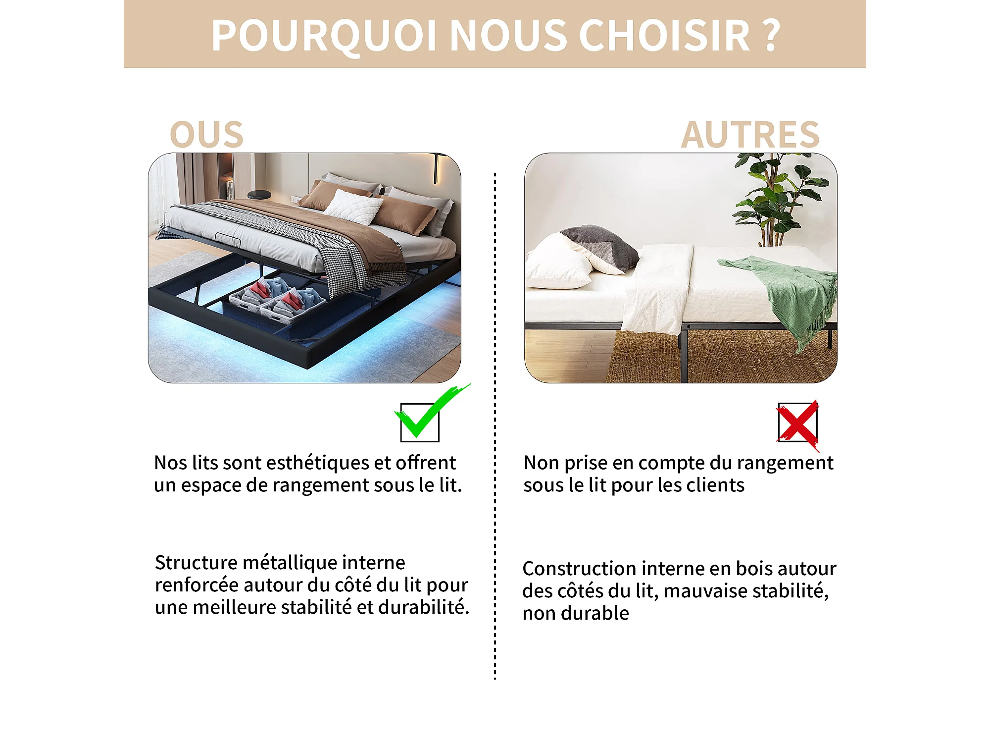 Lit 160x200 cm design flottant avec LED, avec sommier à lattes en bois et structure en métal, lit double sans tête de lit, espace de rangement, Noir