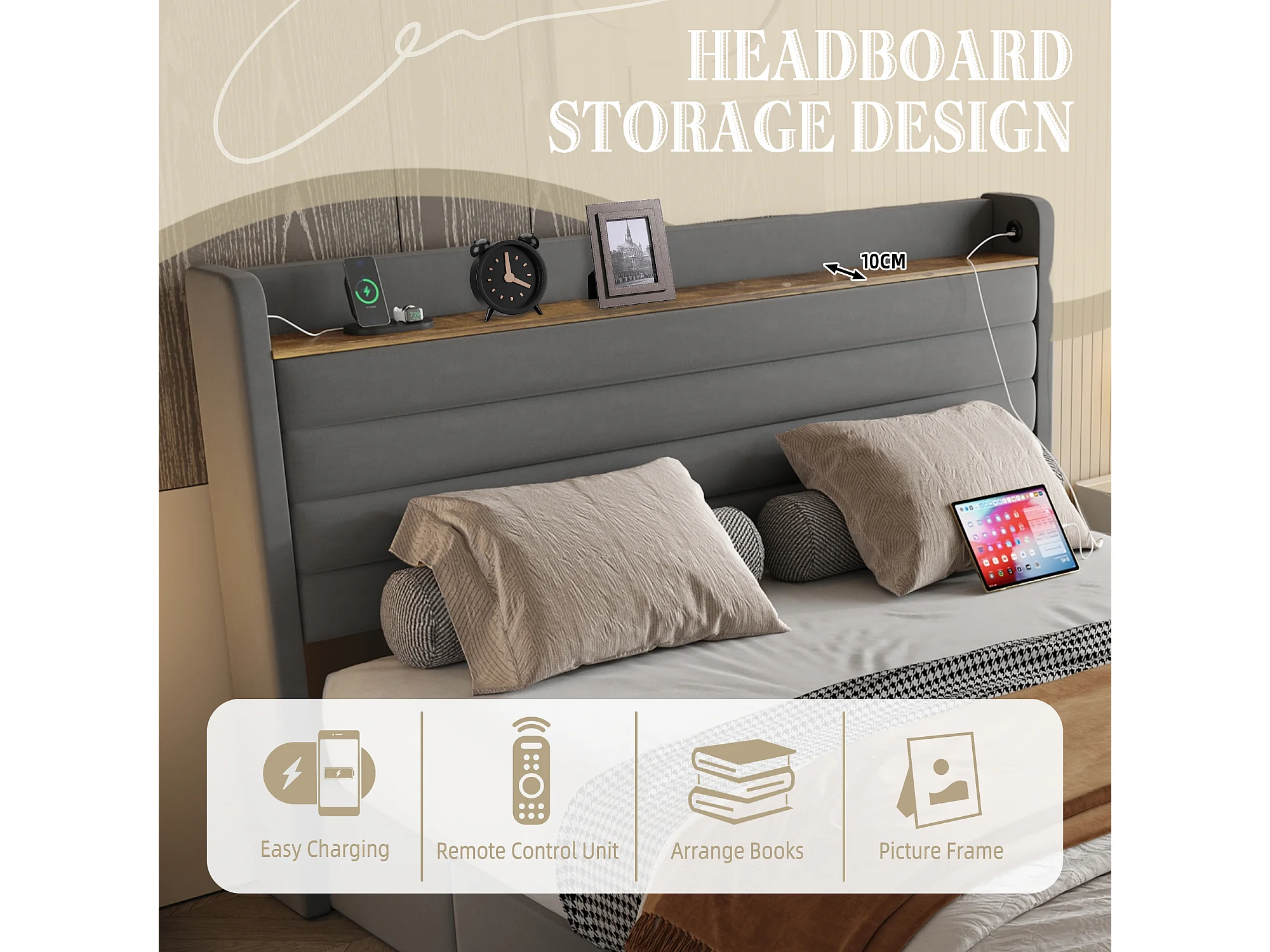 Lit Coffre 160x200 cm - Lit Rembourré en Velours Gris - avec Étagère de Tête de Lit- 4 tiroirs et port USB