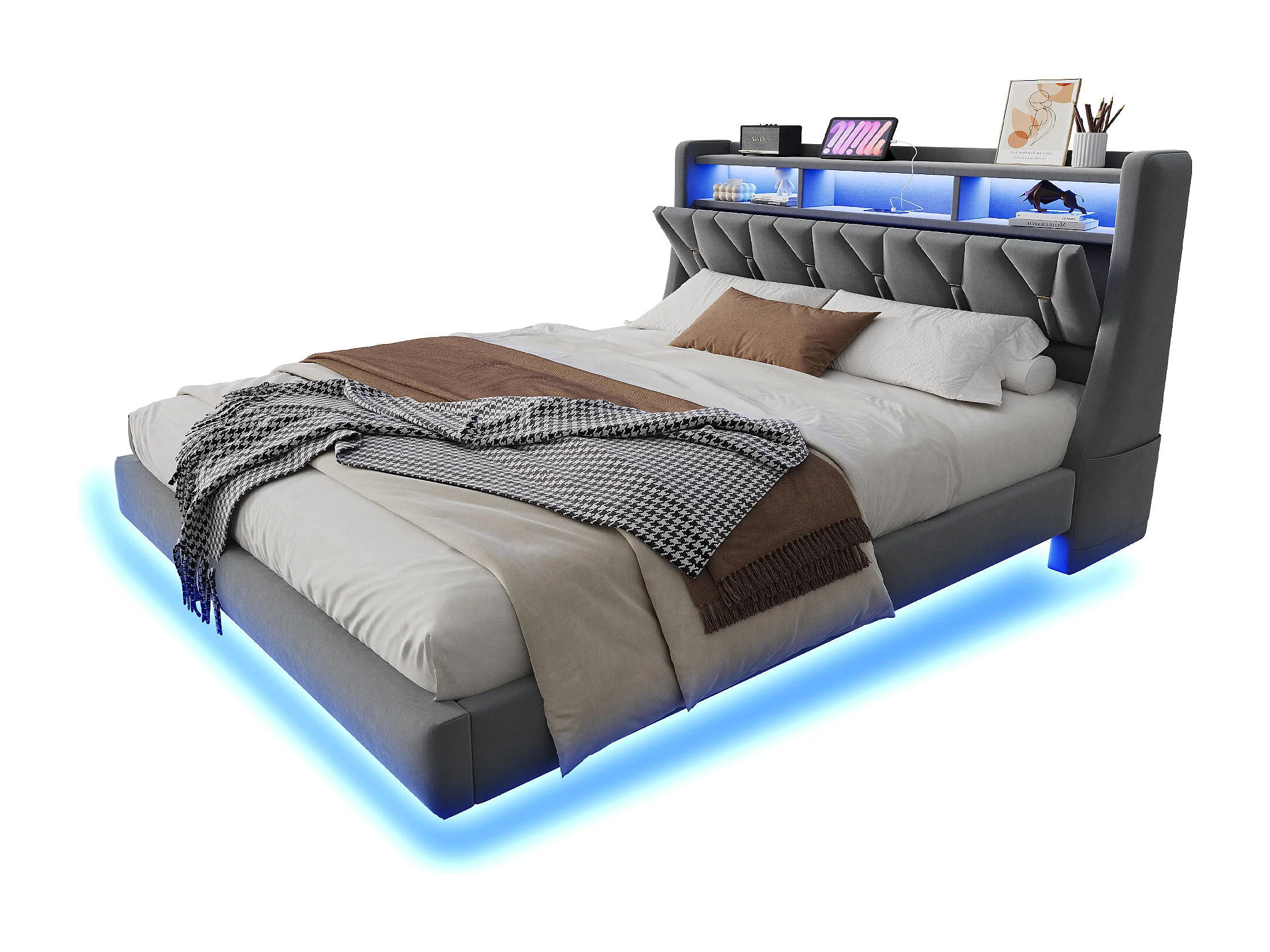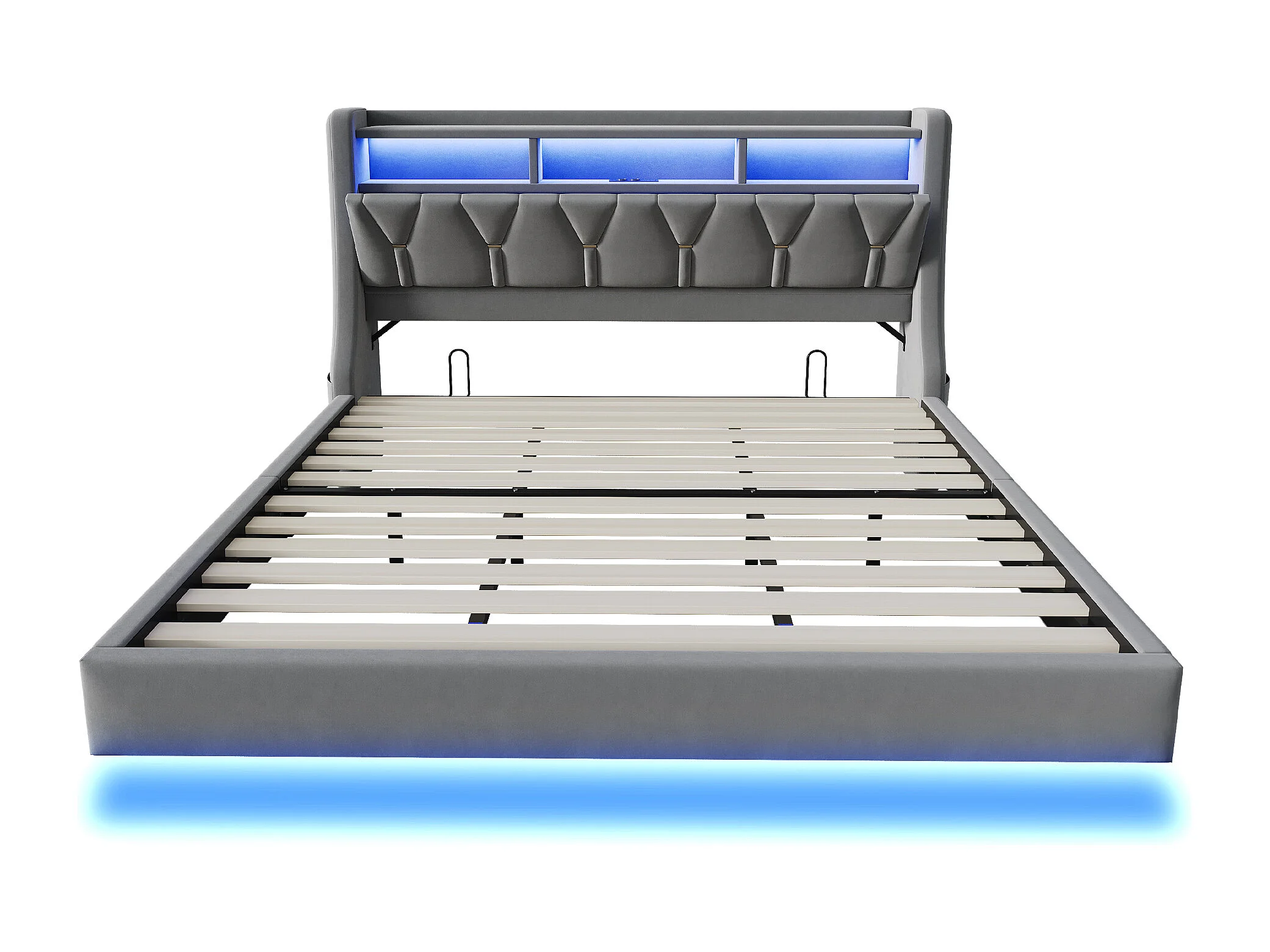 Lit capitonné 180 x 200 cm - tête de lit rabattable - avec prise de courant - avec LED - tissu velours - gris (matelas non inclus)