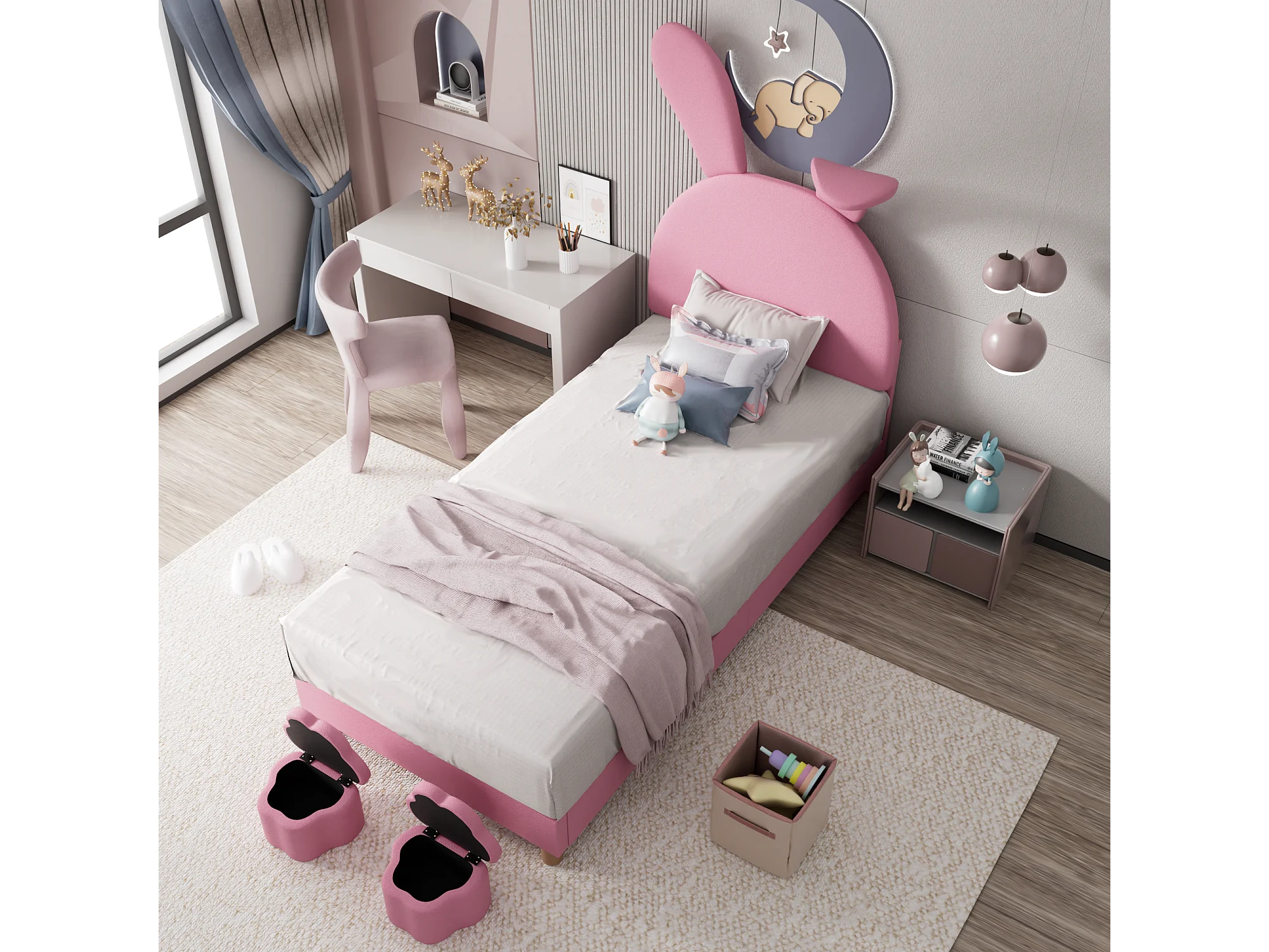 Lit capitonné 90 x 200 cm avec 2 tabourets de rangement pour enfant - chevet LEDs - tête de lit réglable - velours - rose