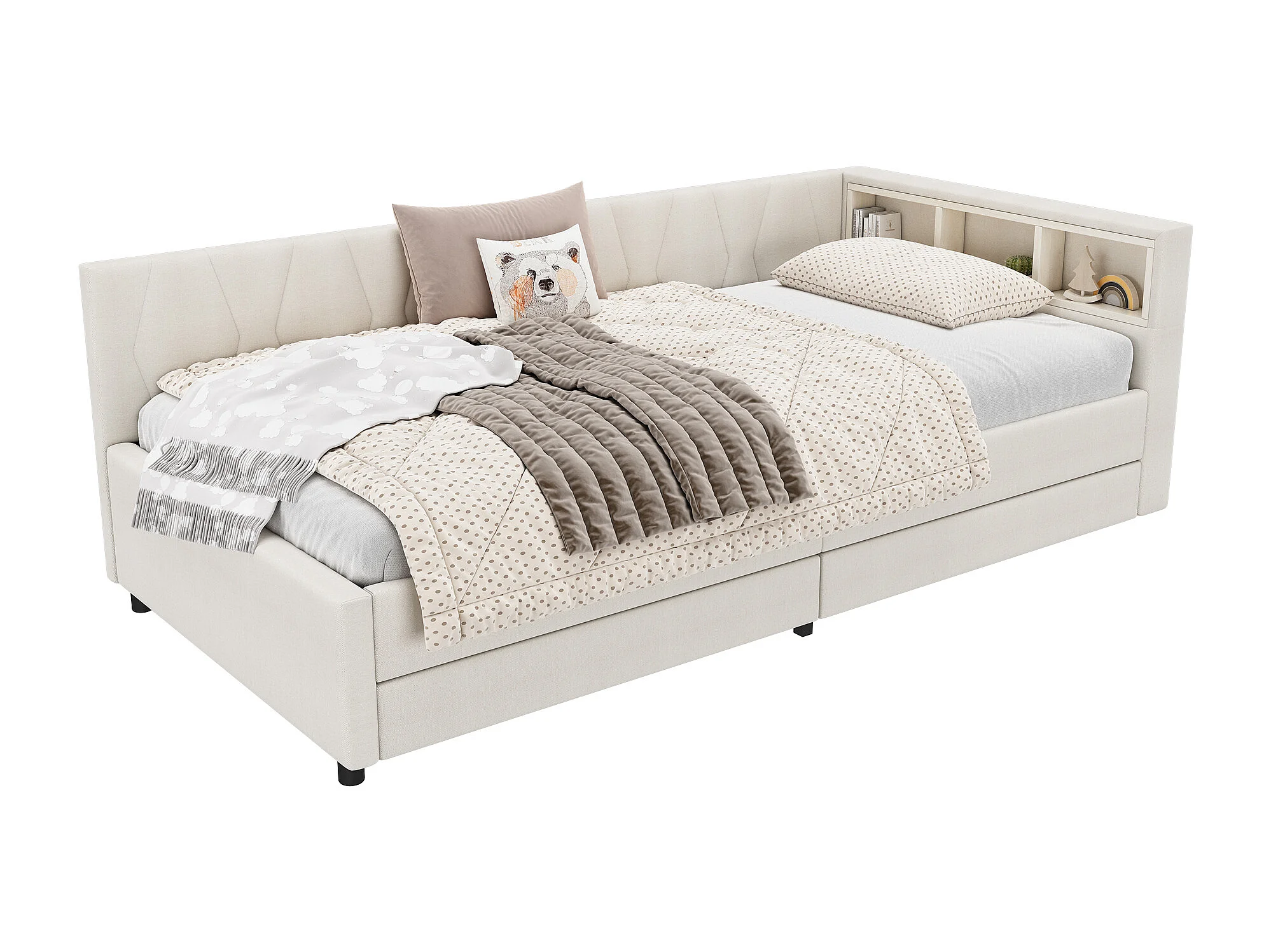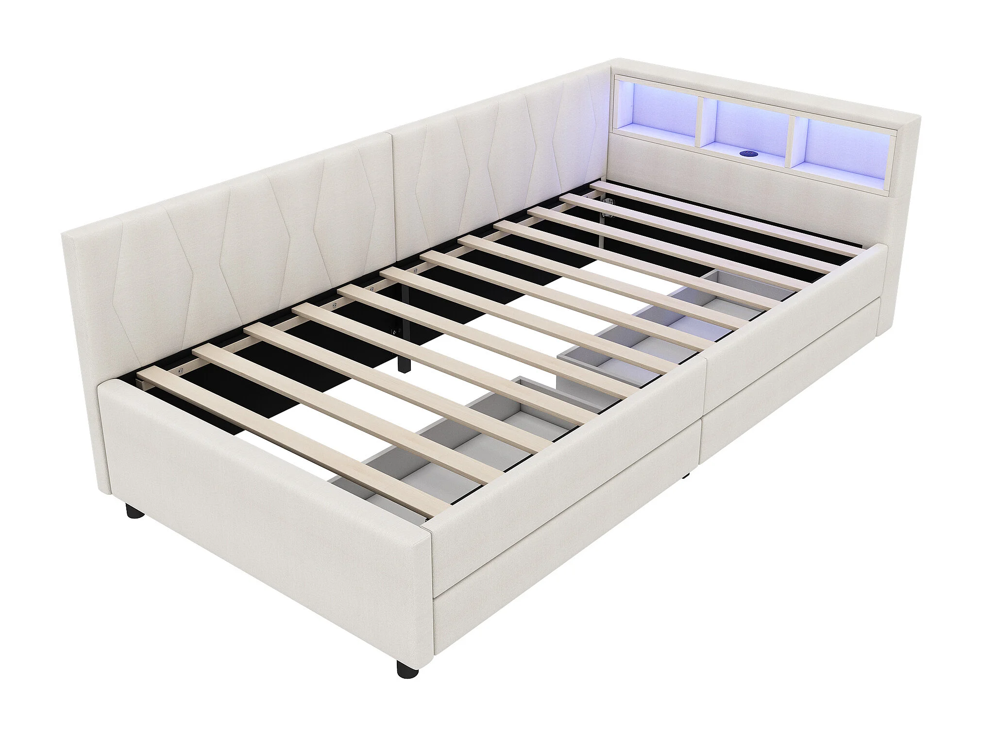 Lit capitonné 90 x 200 cm avec tête de lit et 2 tiroirs - LEDs, Prise USB + Type C - Tissu en lin - Beige (sans matelas)