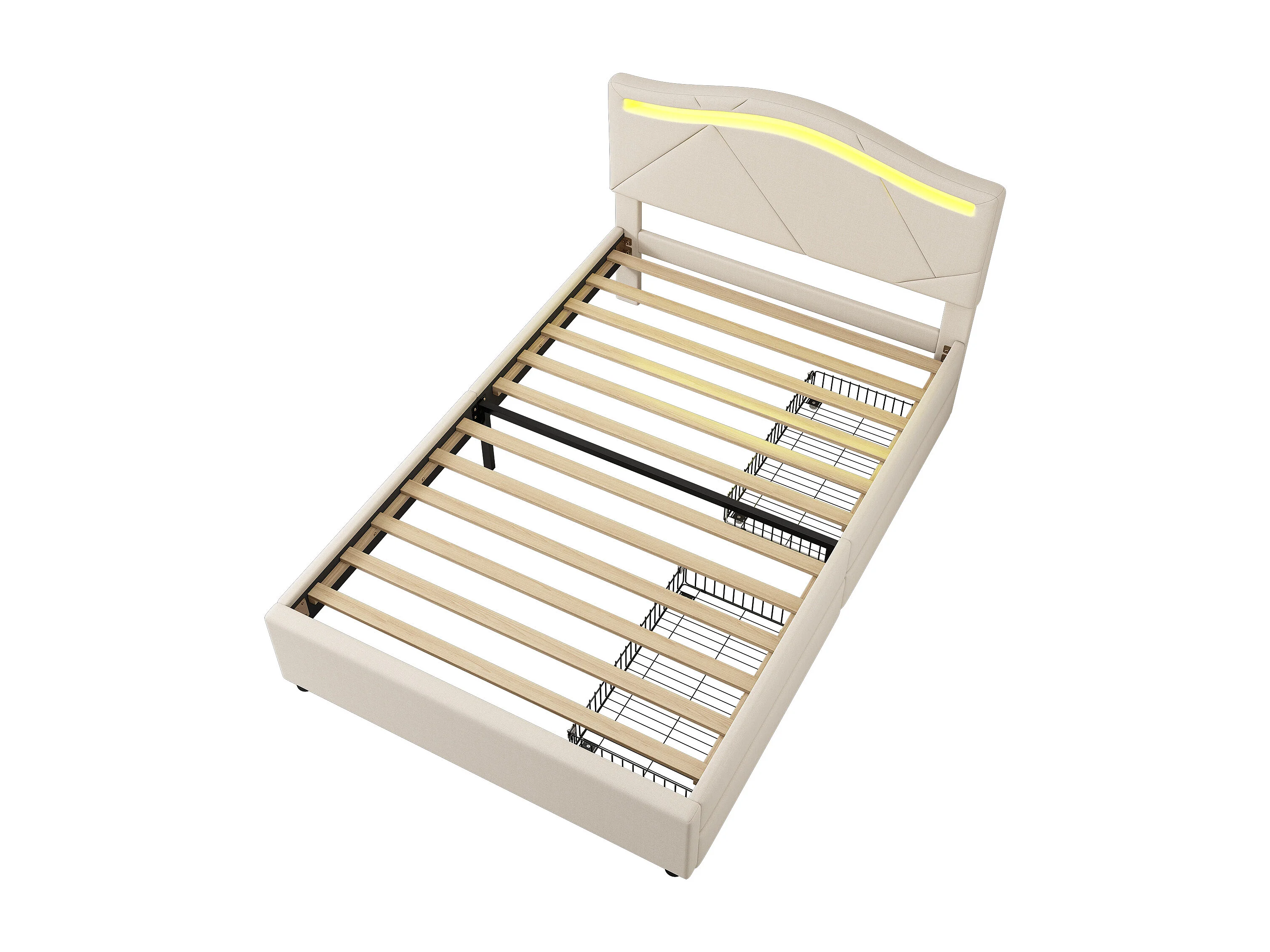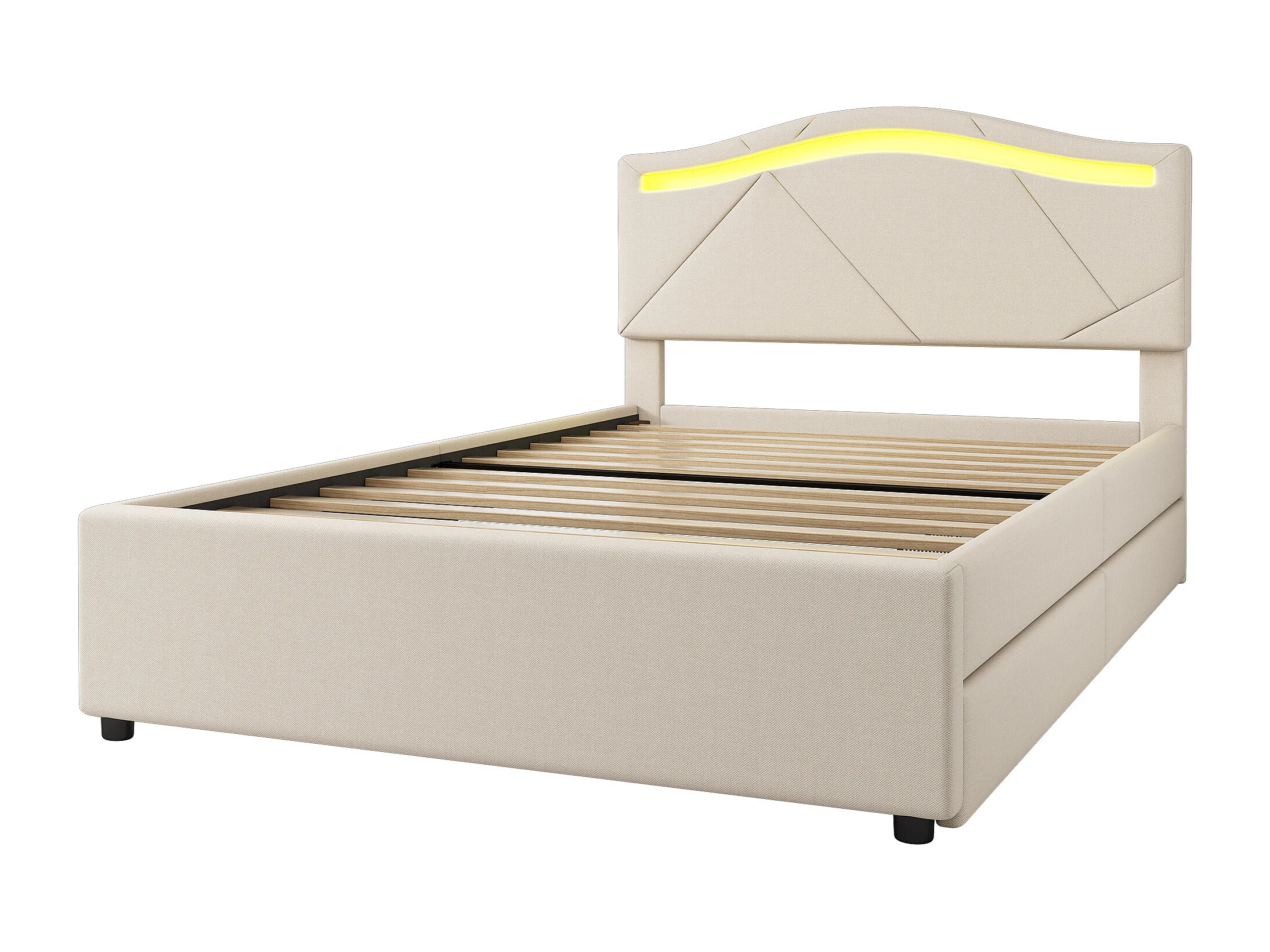 Lit capitonné - 90 x 200 cm - avec tête de lit réglable et 2 tiroirs - tissu en lin - LEDs - coloris beige