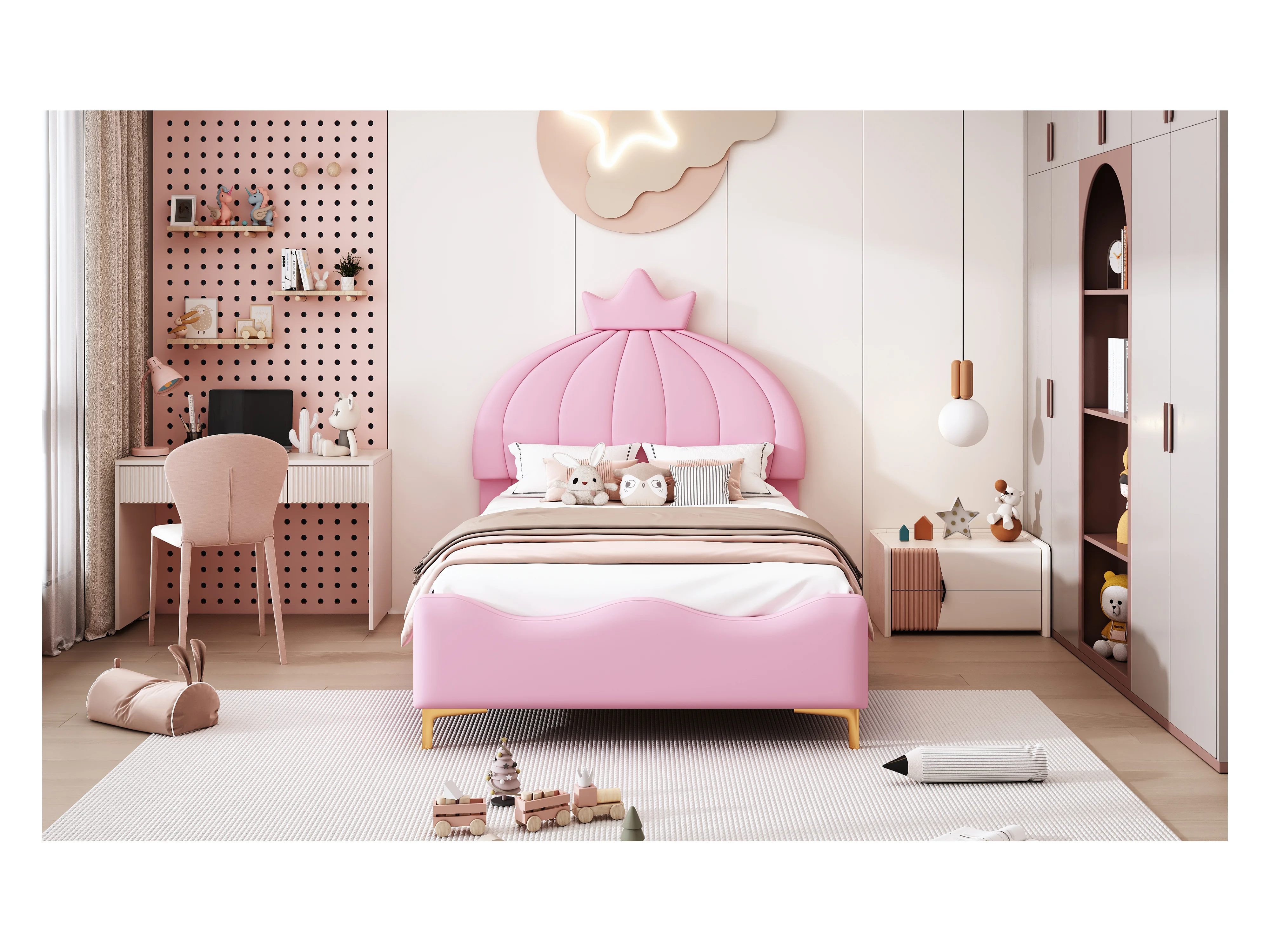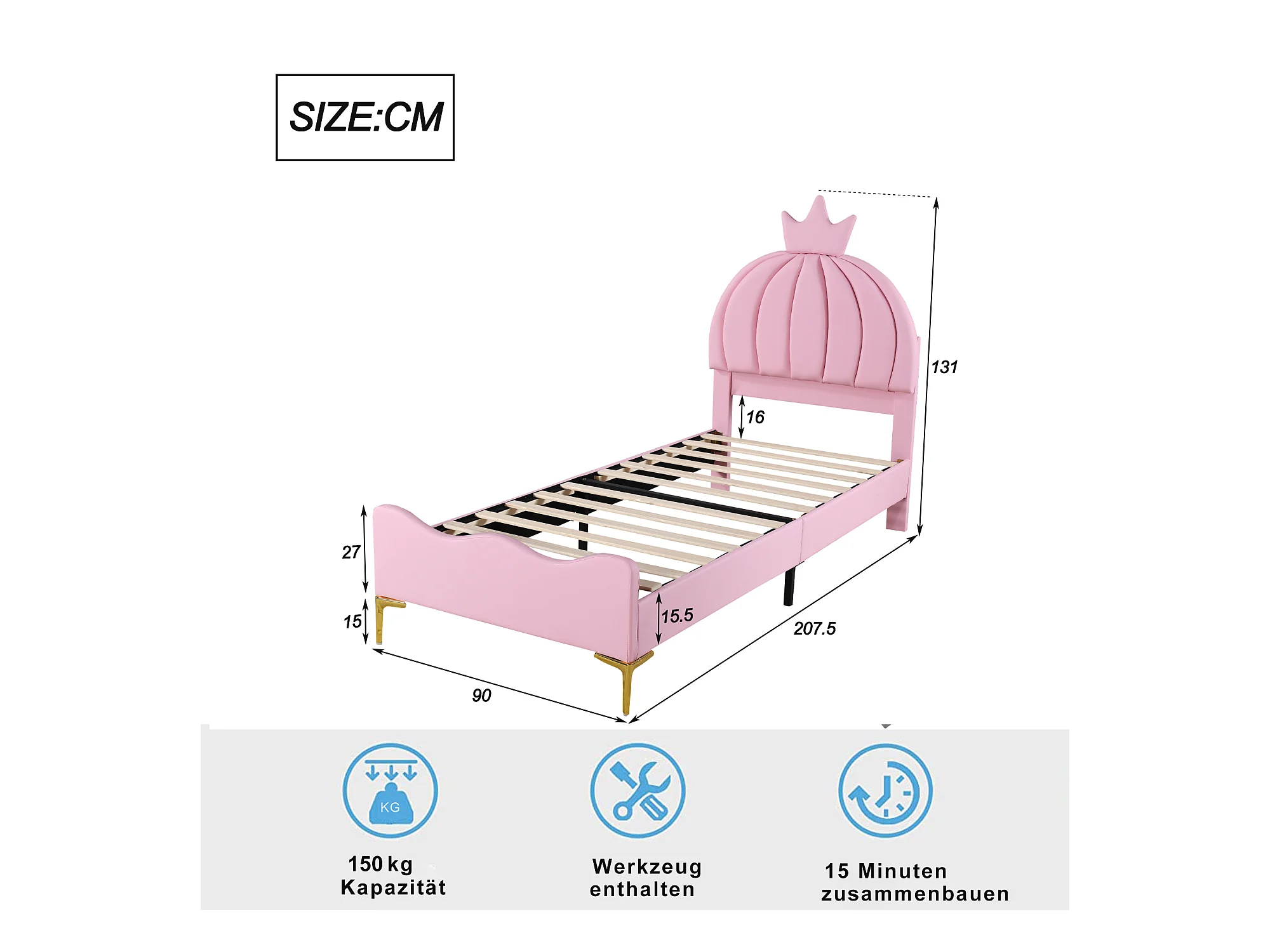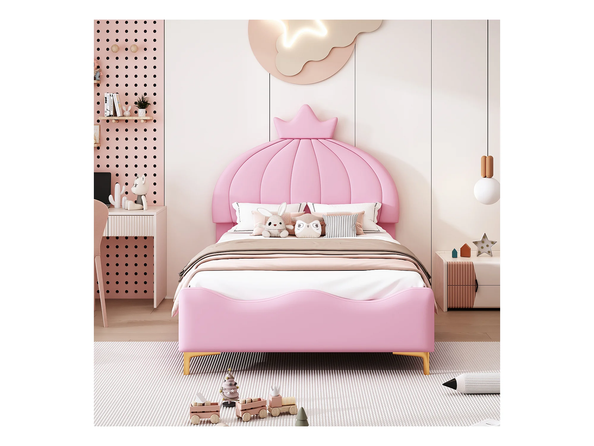 Lit capitonné 90 x 200 cm - Simili cuir et métal - Tête de lit en forme de couronne - Coloris rose