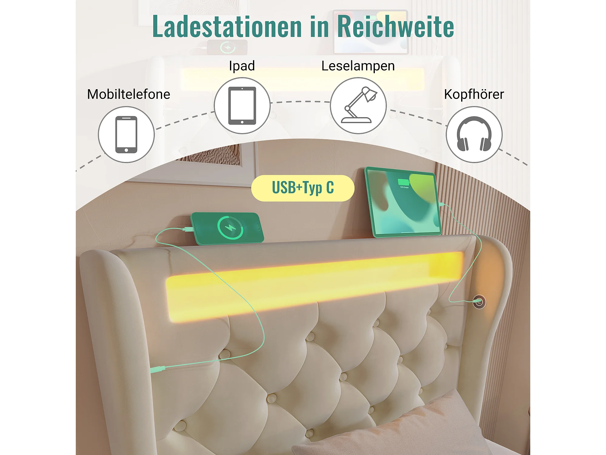 Lit Capitonné 90x200 cm avec LED, Tête de Lit avec USB + Type-C, Lit Hydraulique de Rangement, Velours Beige (220x96x110 cm)