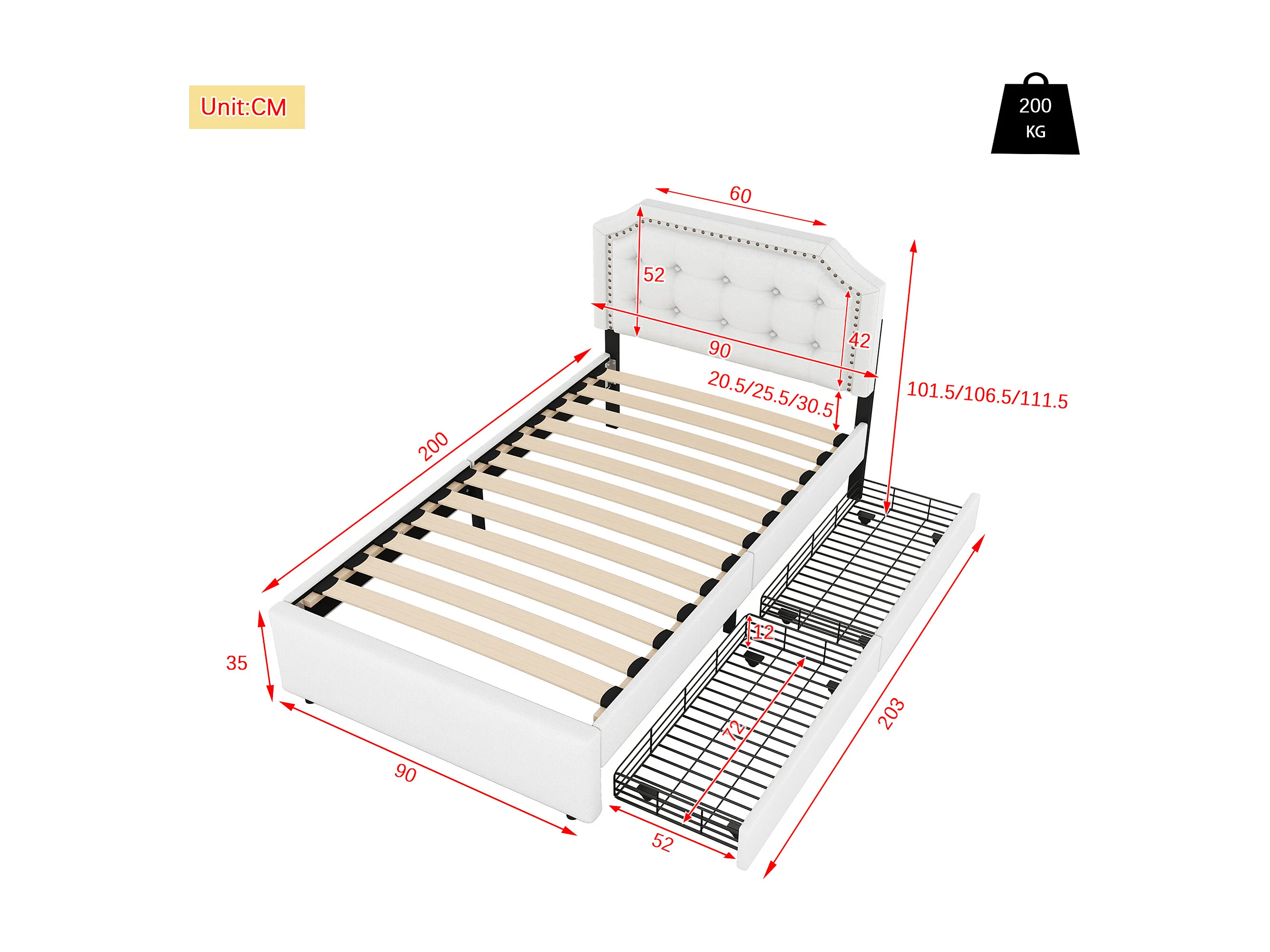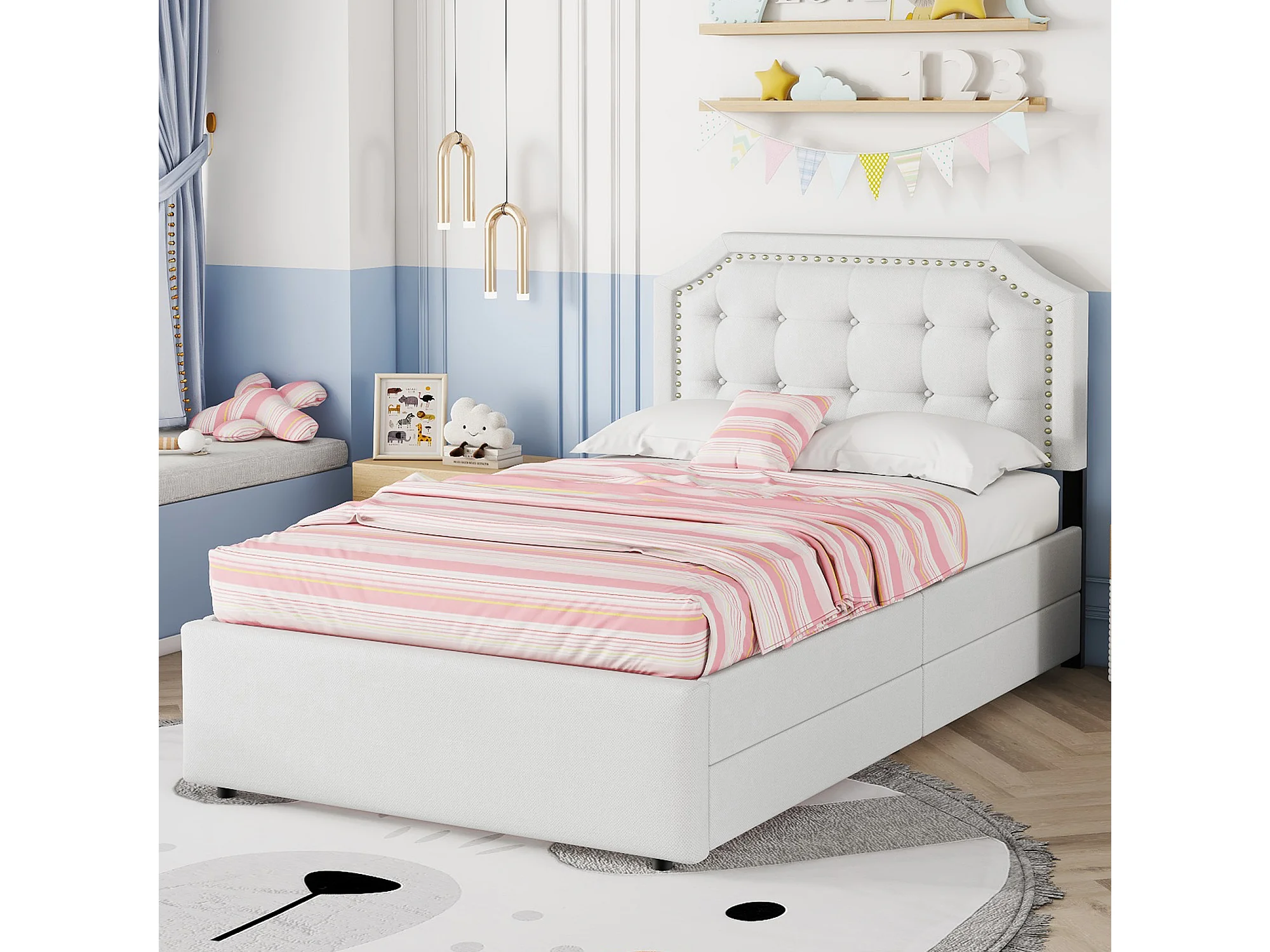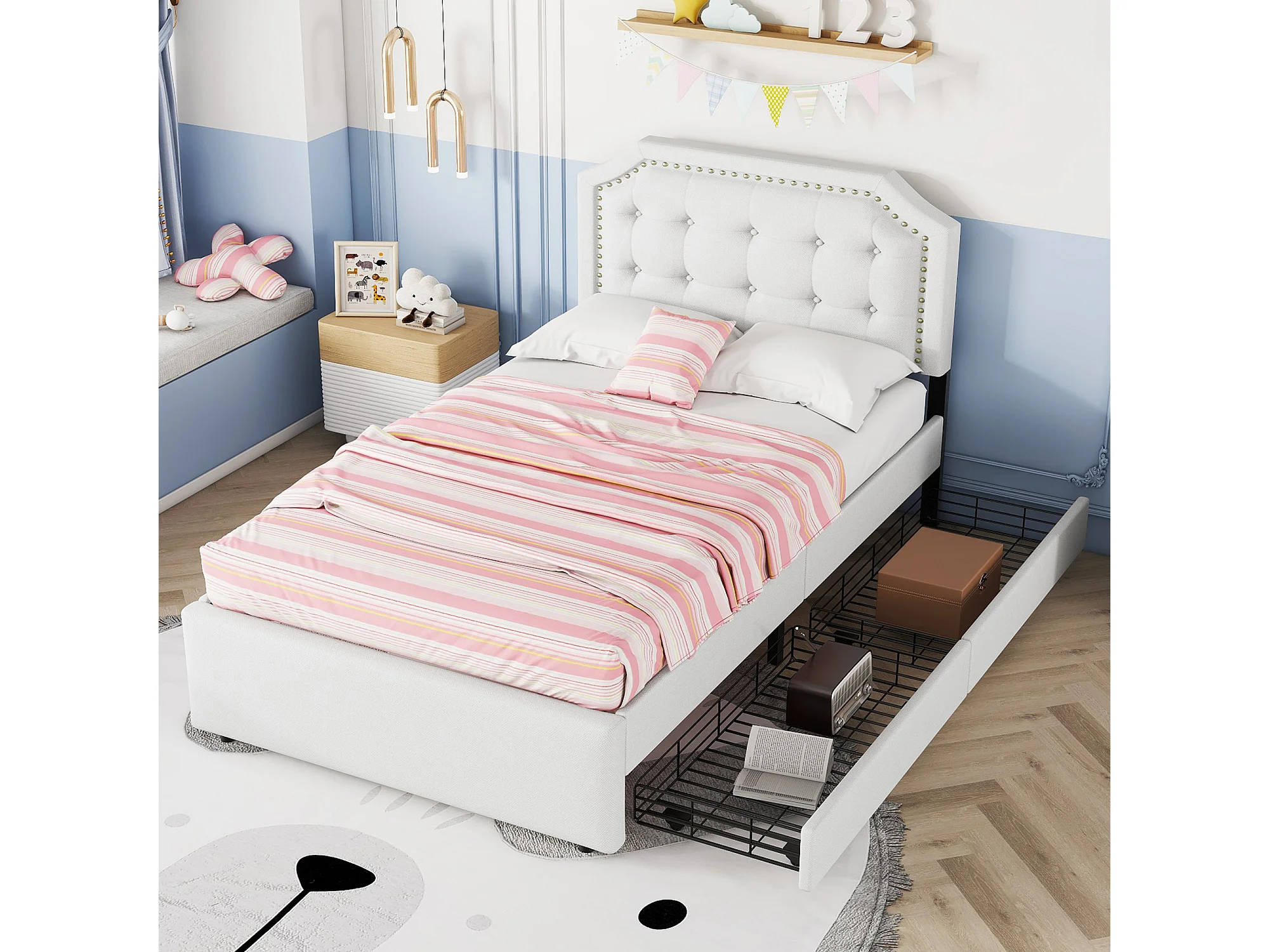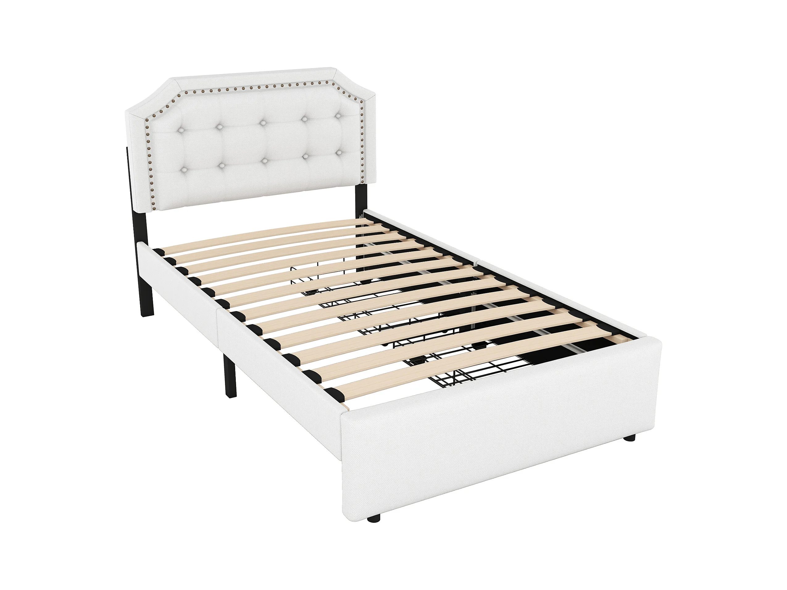 Lit adulte 90x200 cm - Lit simple avec 2 tiroirs et tête de lit tapissée - lin beige clair