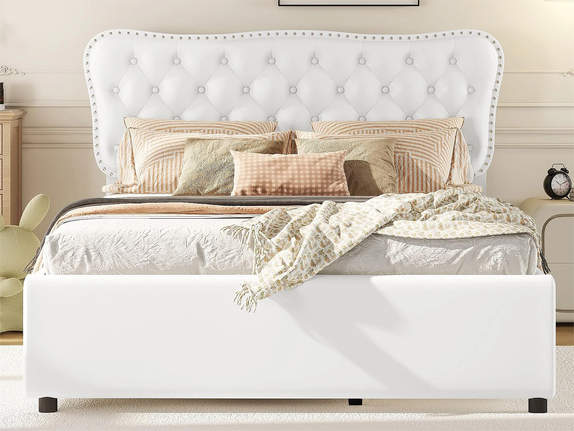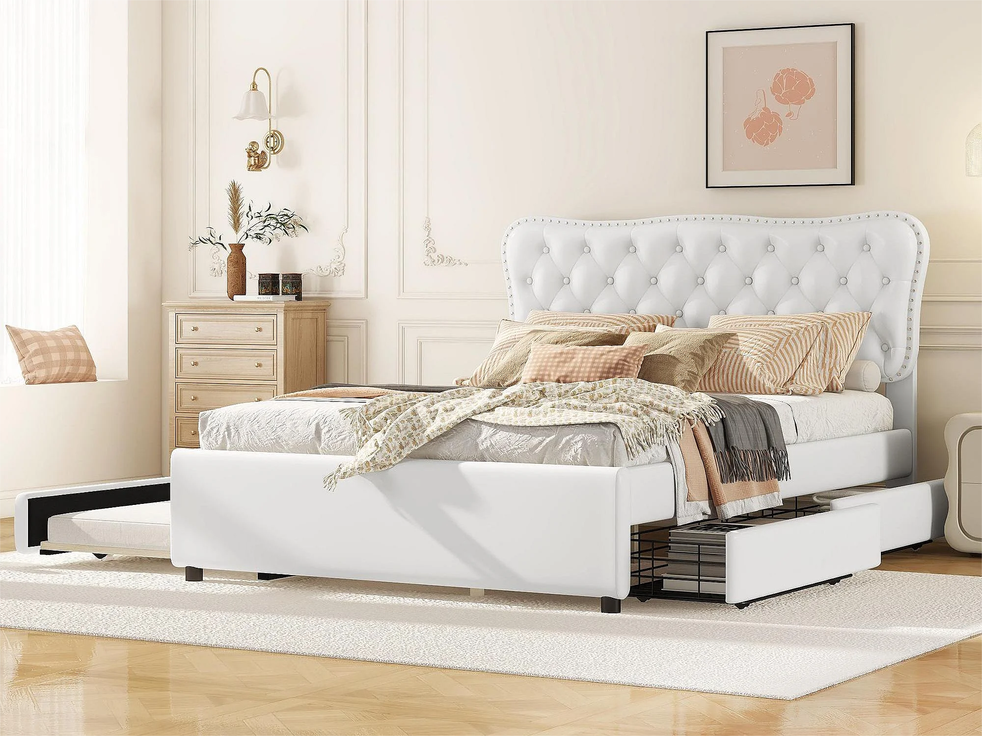 Lit capitonné adulte 140 x 200 cm avec lit gigogne 90 x 190 cm - 2 tiroirs - similicuir - blanc