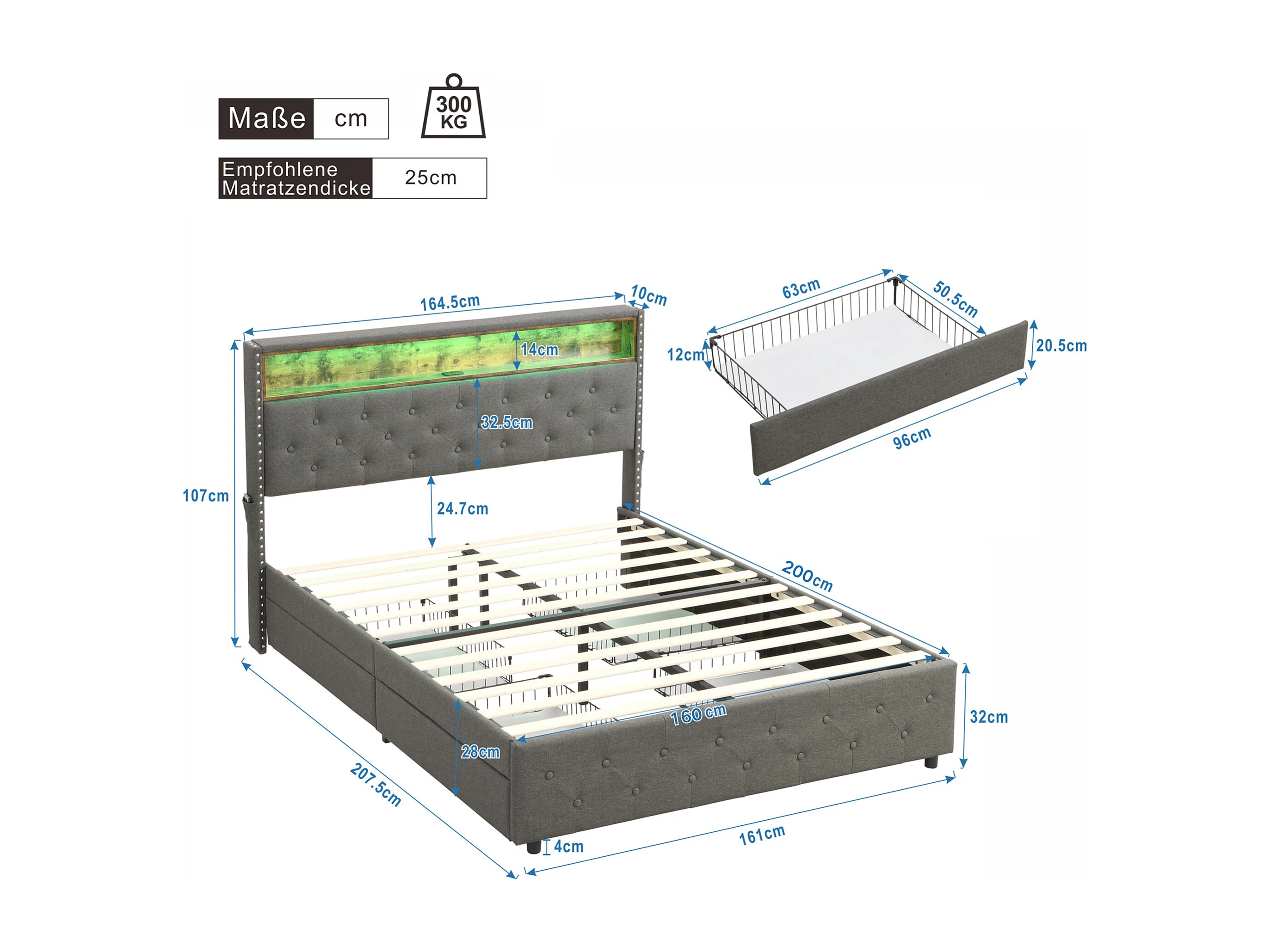 Lit capitonné avec 4 tiroirs et étagère - 160 x 200 cm - LEDs et USB - tissu en lin - sommier à lattes - gris