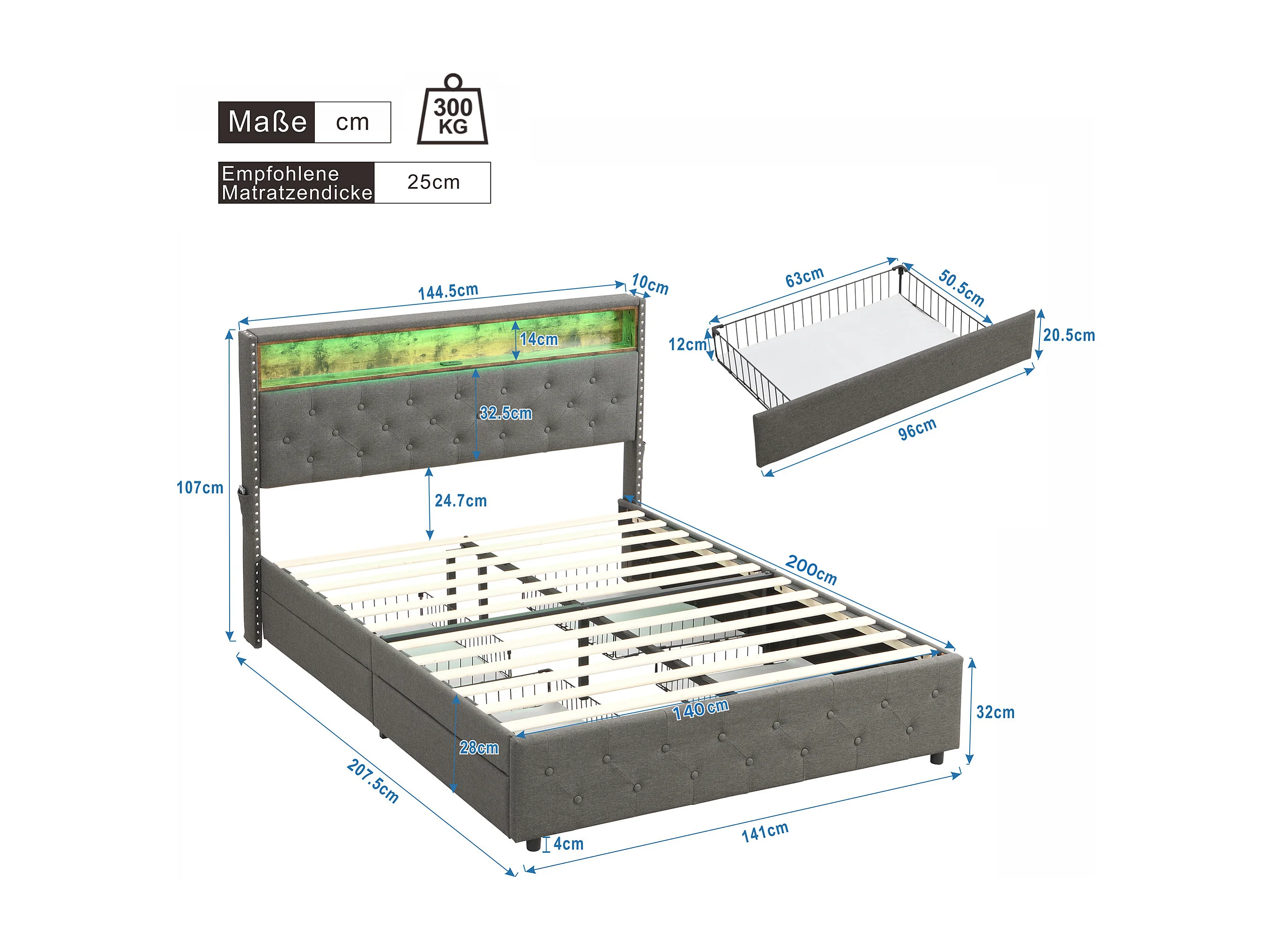 Lit capitonné avec 4 tiroirs et rangement de tête de lit - 140 x 200 cm - LEDs et USB - tissu lin - gris