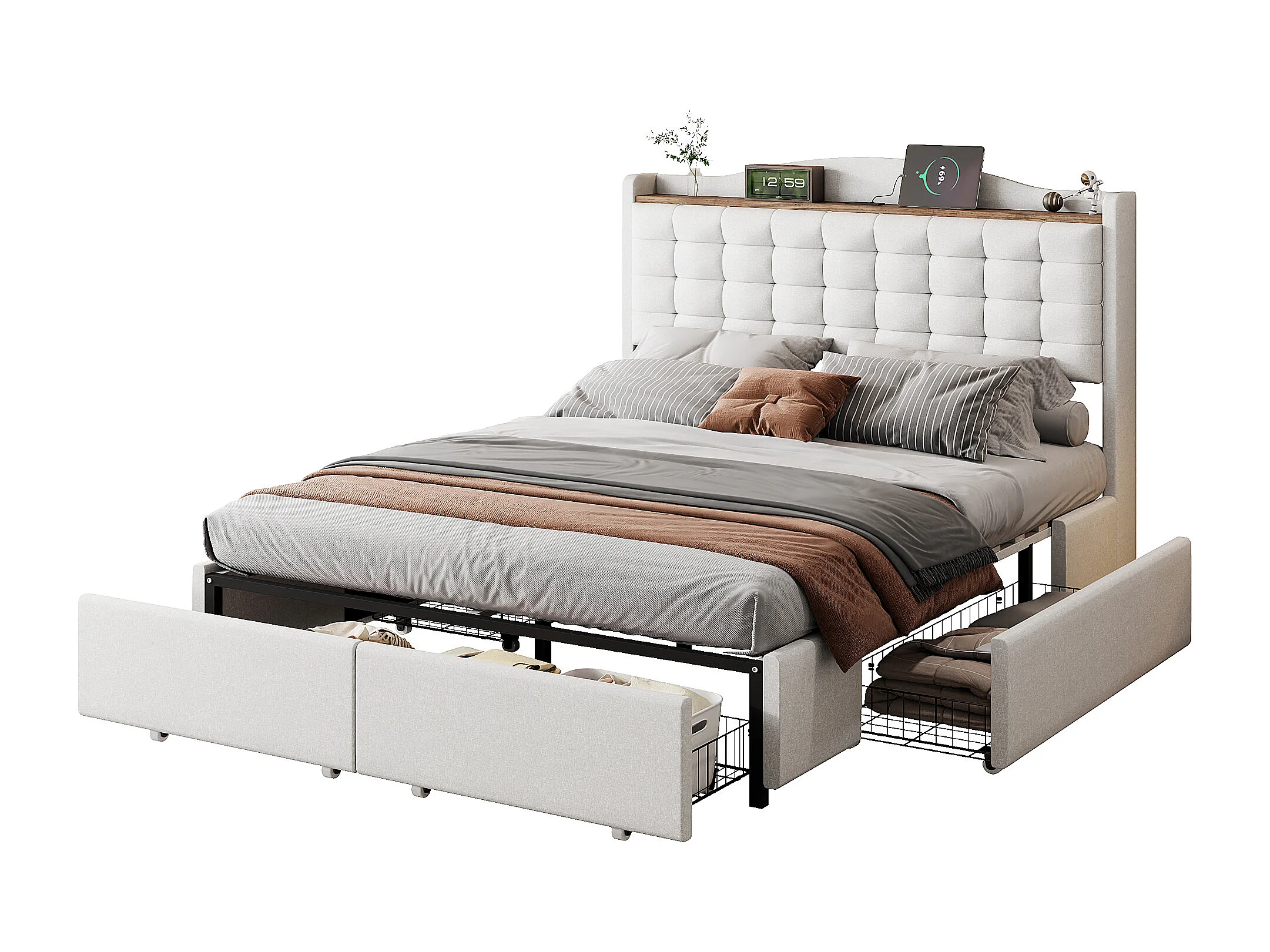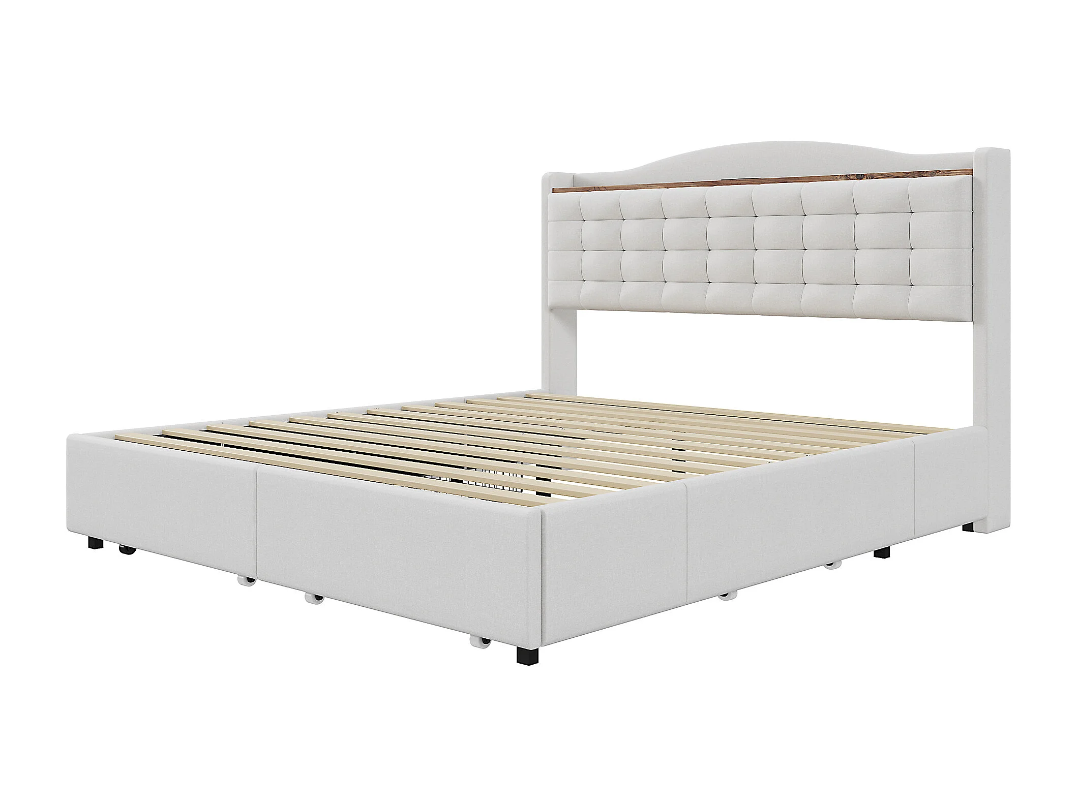 Lit capitonné avec 4 tiroirs, tête de lit avec prise USB, lin beige (200x146x110 cm)